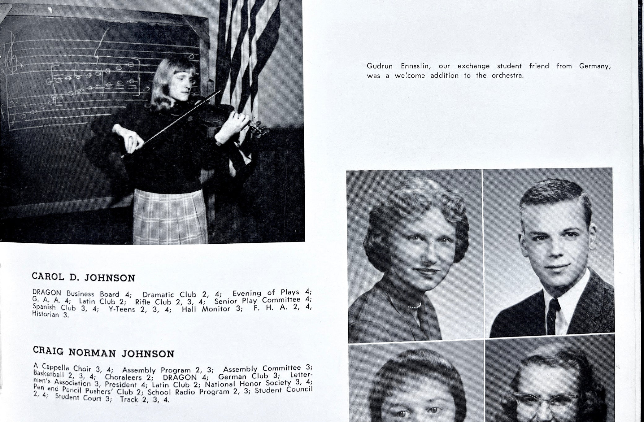 Ensslin is listed as a participant in Future Teachers of America, German Club, Orchestra, Student Council, Latin Club, and the National Honor Society. She appears at least five times (pp. 40, 52, 57, 122, and 136) and we believe can be identified in a sixth (p. 43) pledging allegiance with a larger group of students. A fascinating artifact of one of the postwar period's most visible proponents of political violence. She argued against the capitalist, imperialist policies of Western Europe and the US, which she had experienced first hand as an exchange student at Warren. The RAF was involved in numerous bombings and hostage situations; Ensslin was one of several members charged with murder and sentenced to life in prison. She died there under mysterious circumstances (in the same evening as two other RAF members) in what became known as the “Death Night.”