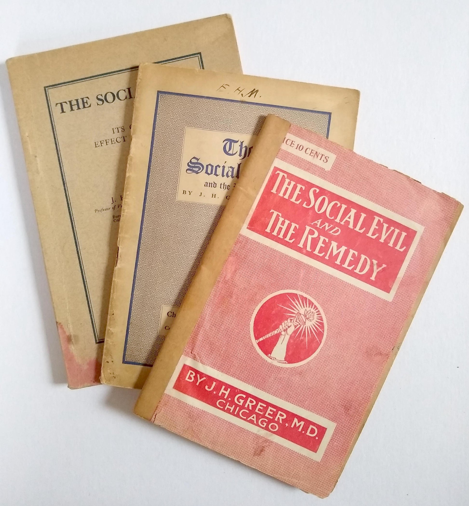 (Antiprostitution) (Socialism) Greer, J.H. The Social Evil: Its Cause Effect and Cure. Chicago, IL: Self-published, 1913. Small 8vo, 64 pp.; in printed wrap, dampstain at foot affecting first few leaves. Together with two other editions of the same: Greer, J.H. The Social Evil and the Remedy. Chicago, IL: Charles H. Kerr & Co., n.d. Each: small 8vo, 64 pp.; in color patterned wraps, both with losses to rear wrap where ads for The International Socialist Review are given.