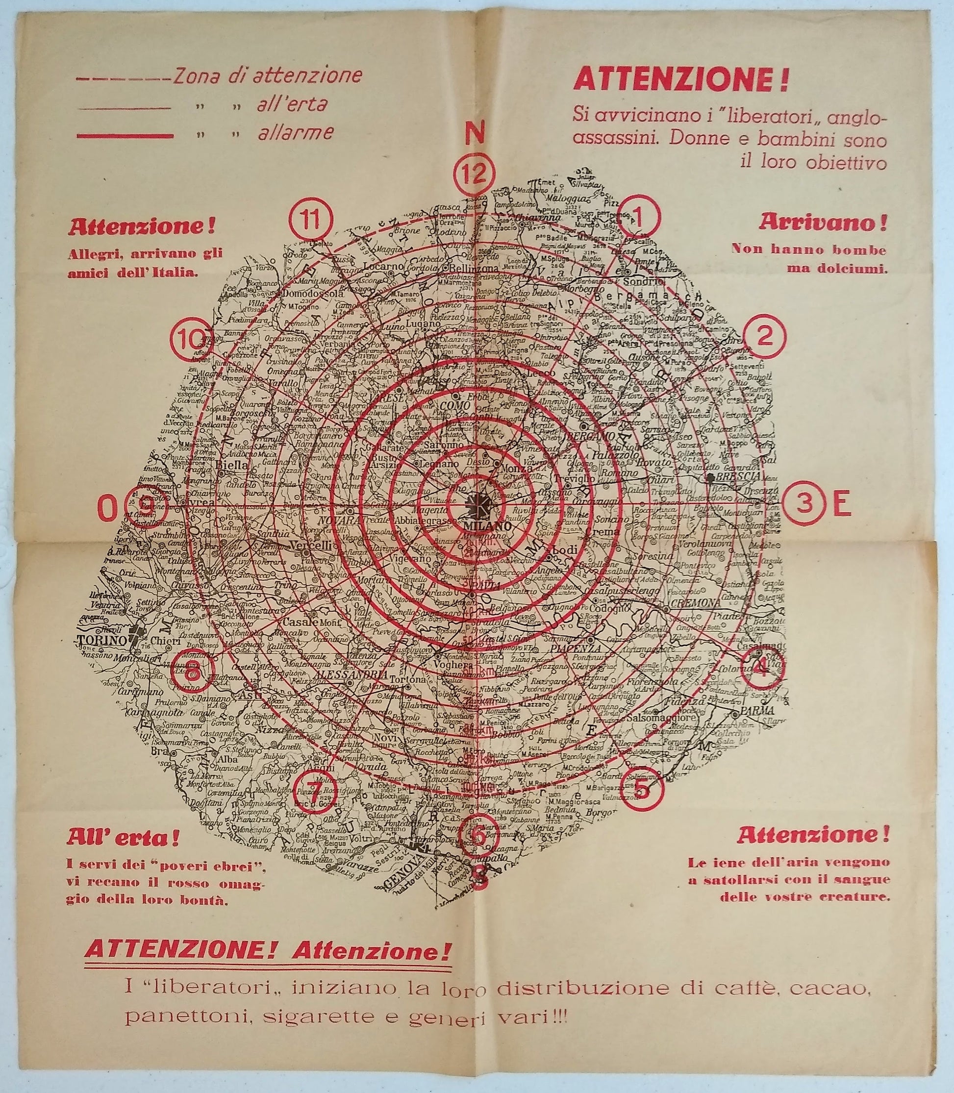 Attenzione! Si avvicinano i “liberatori” anglo-assassini… [Milan?], nd., ca. 1943. Poster printed in black and red, approx. 22-¾ x 19-¼ in.; toned, creases from vertical and horizontal folds, splitting at center; edges a bit worn, some foxing verso.