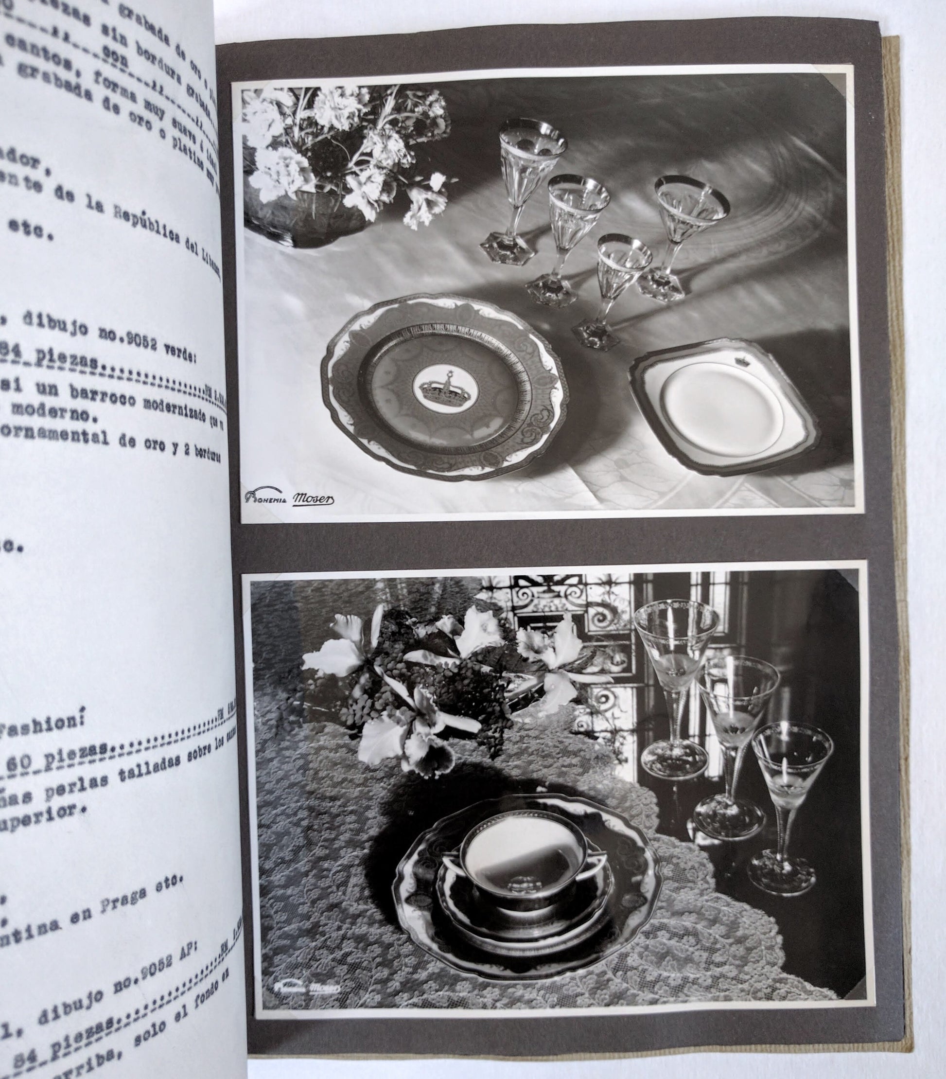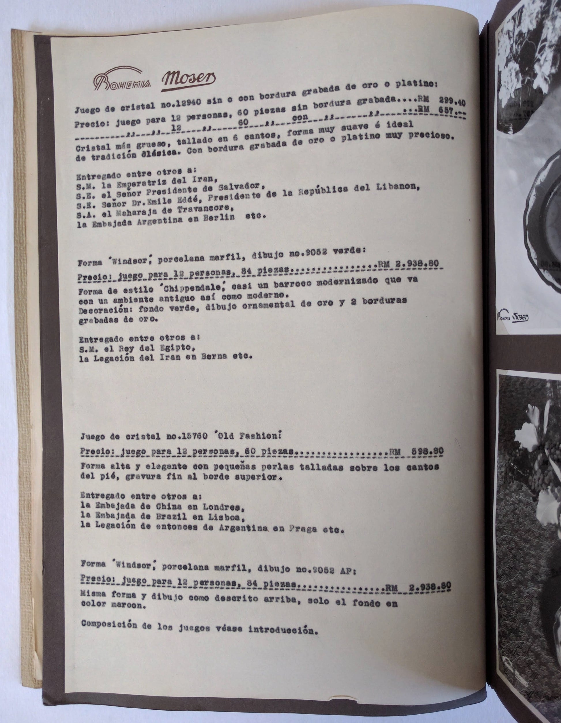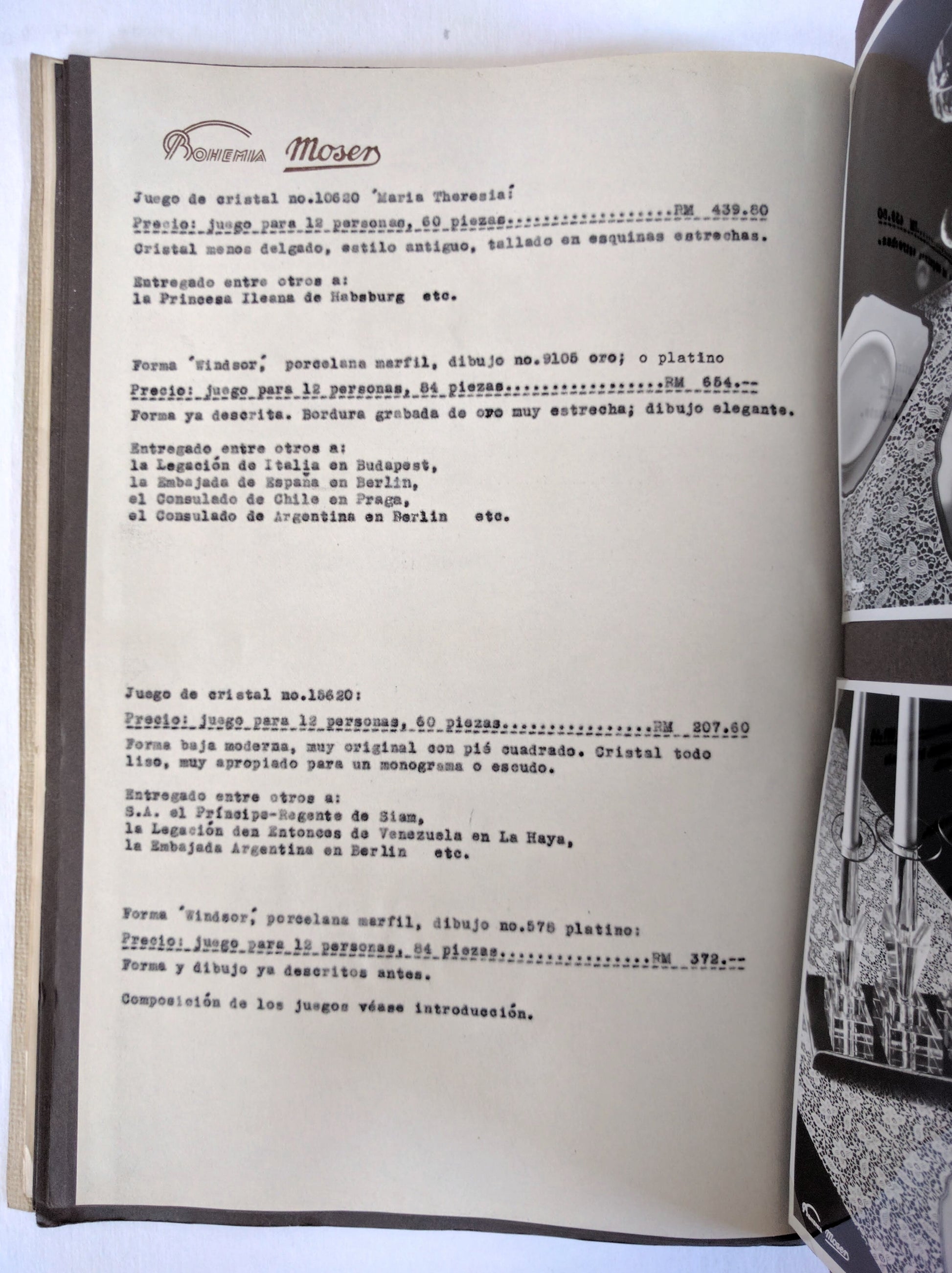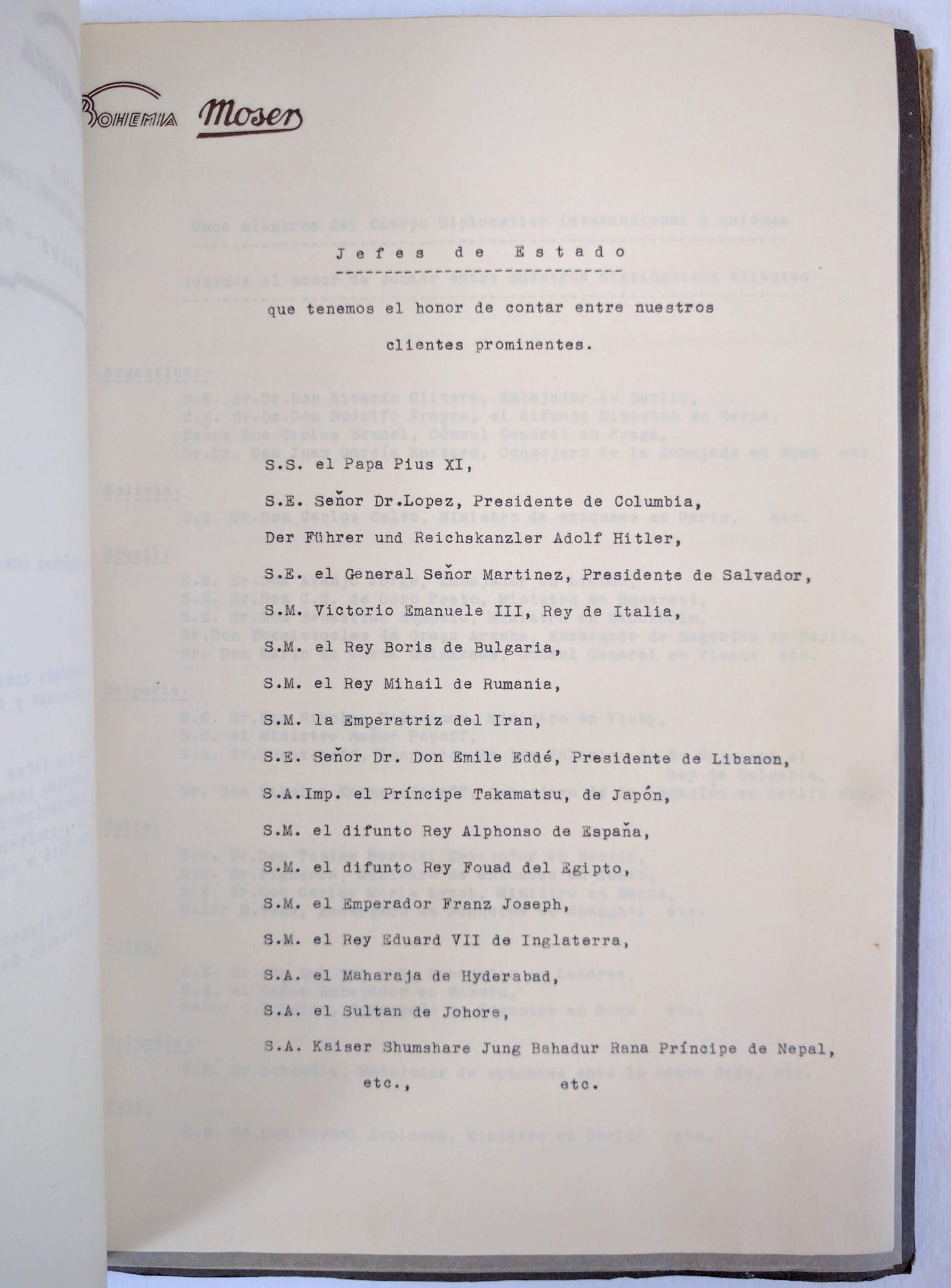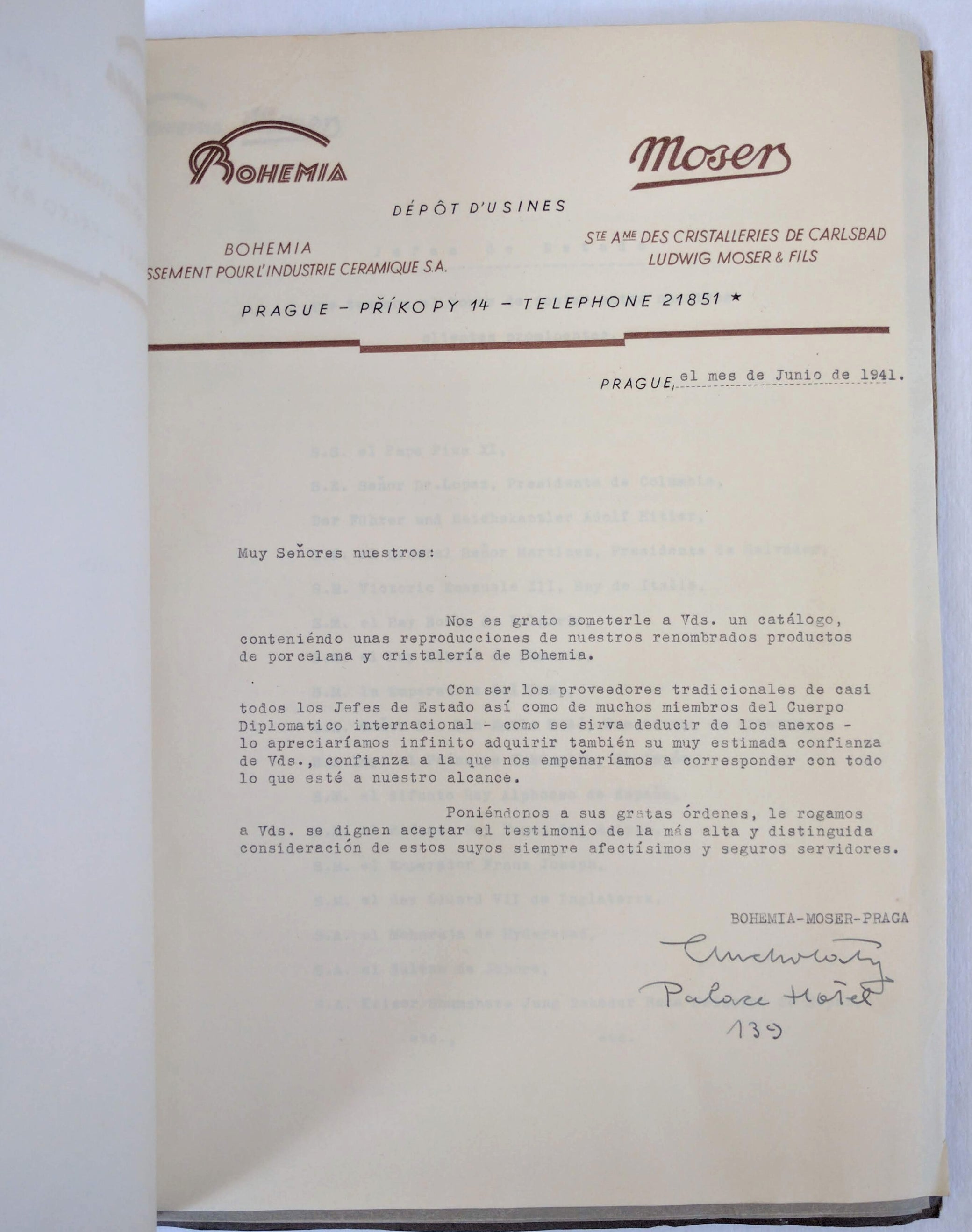 (Trade Catalogue). Bohemia-Moser-Praha. Prague: [Moser Glassworks], 1941. 4to, [8] typed and carbon copy leaves followed by 23 photographic prints mounted to [12] heavy card leaves, each interleaved with typed guards, photographs near fine, a few corner mounts detached; in stab-sewn paper wrappers, verso sl. soiled. An attractive and surprisingly political tableware catalogue sent by Bohemia-Moser-Praha to the El Salvadorian legate in Madrid in June, 1941. The introductory materials list the company's prominent clients: WWII-era heads of state and embassies. The list is a “who's who” of Axis country leaders and their “co-belligerent” states, puppet governments, and neutral allies (Adolf Hitler, Francisco Franco, Pope Pious XI, the Emperor of Japan, Kings of Bulgaria, Italy, Romania, and Spain, the Sultan of Johore, etc.). A few Allies are also listed, including the King of England and American diplomats. The interleaves identify the designs and prices of the tableware in the facing photographs, and provide the names of embassies and legations that have ordered the specific patterns shown. Franco's selection is featured. Moser was founded by the Czech-Jewish glass artist Ludwig Moser in 1857; a majority interest was sold in 1934 and the company was further nationalized after the Nazi occupation of Czechslovakia in 1939. In September 1941, a few months after this catalogue was released, much of the Moser family was killed in the Nazi liquidation of Jewish Bohemia. SOLD