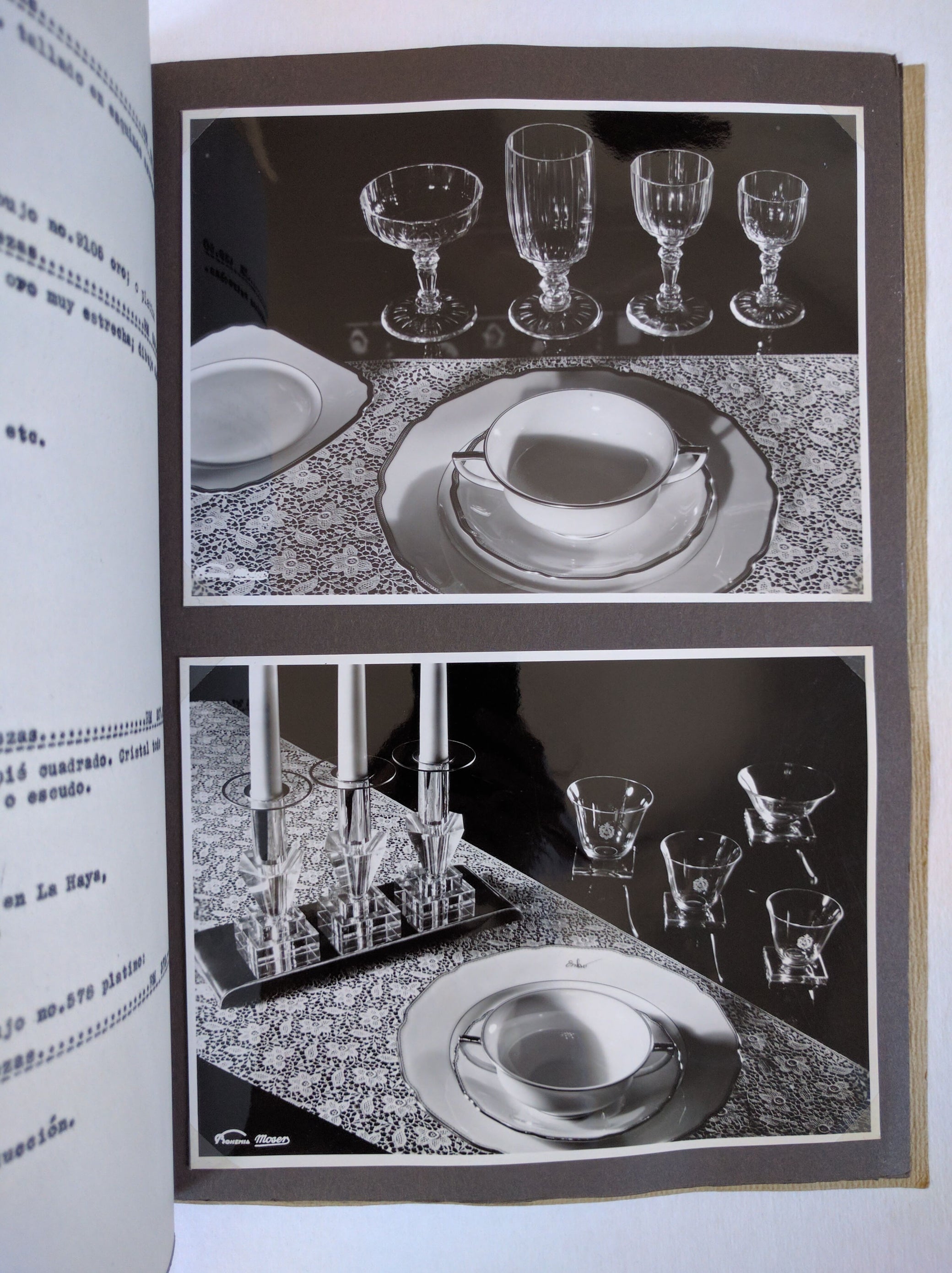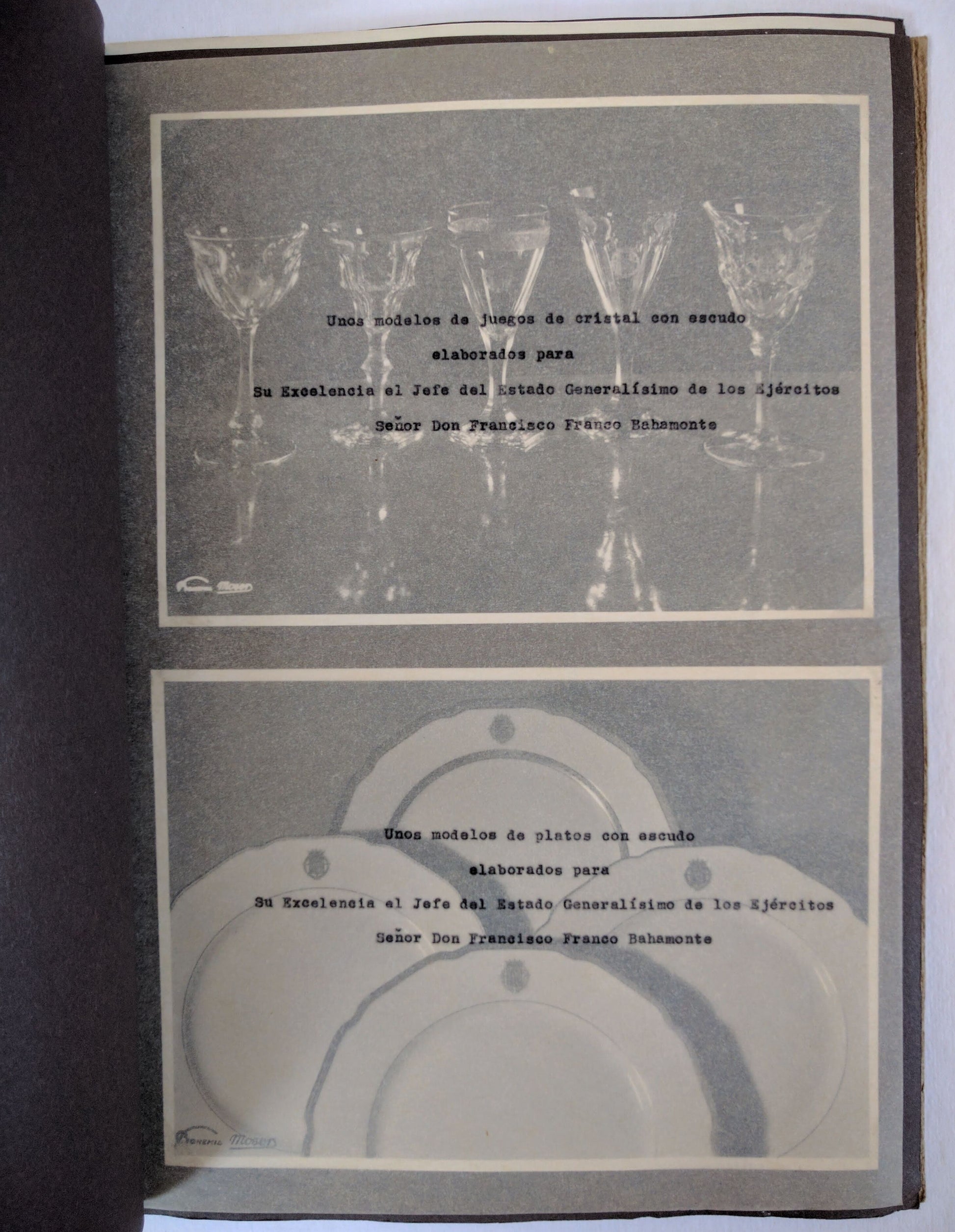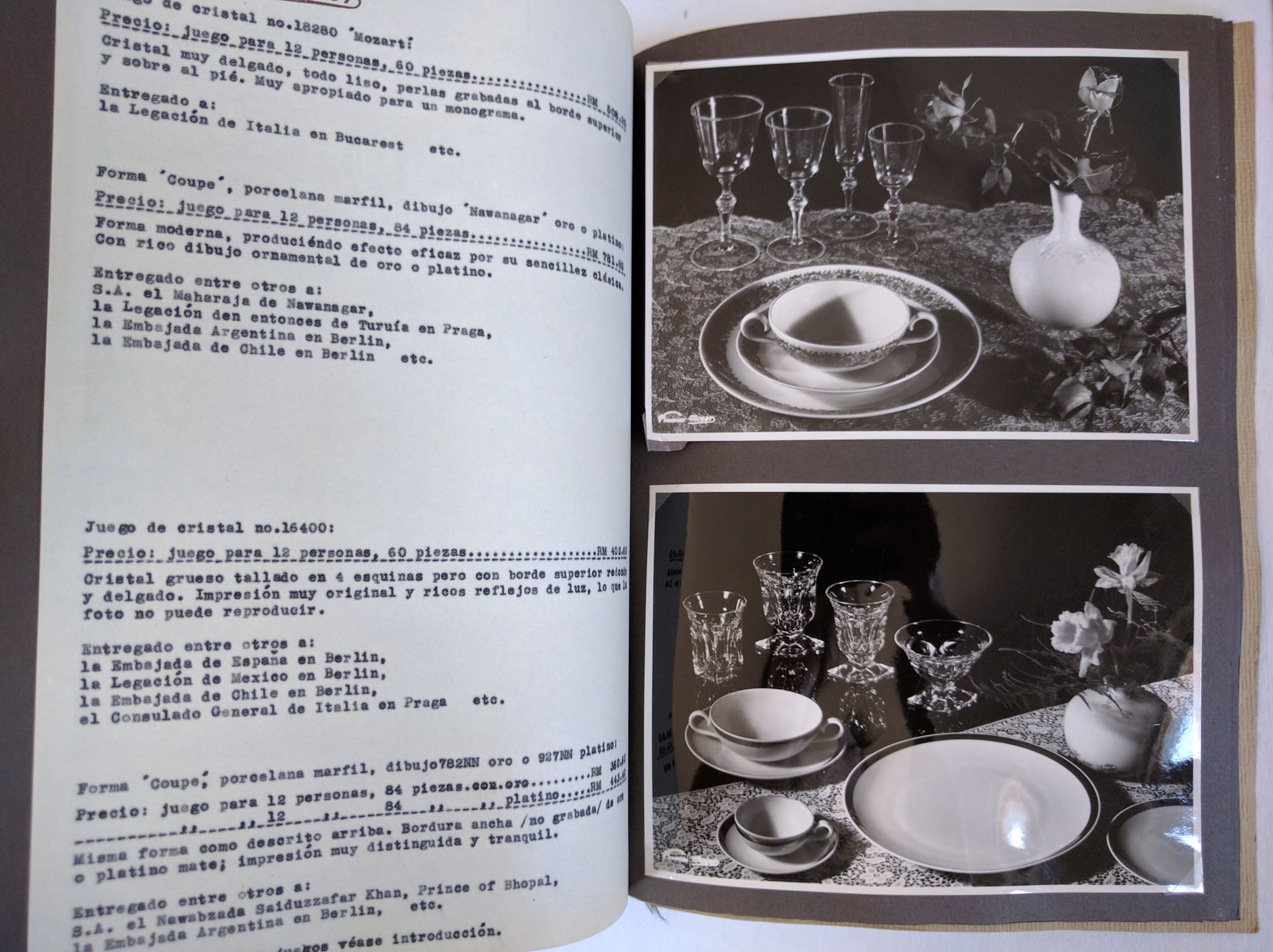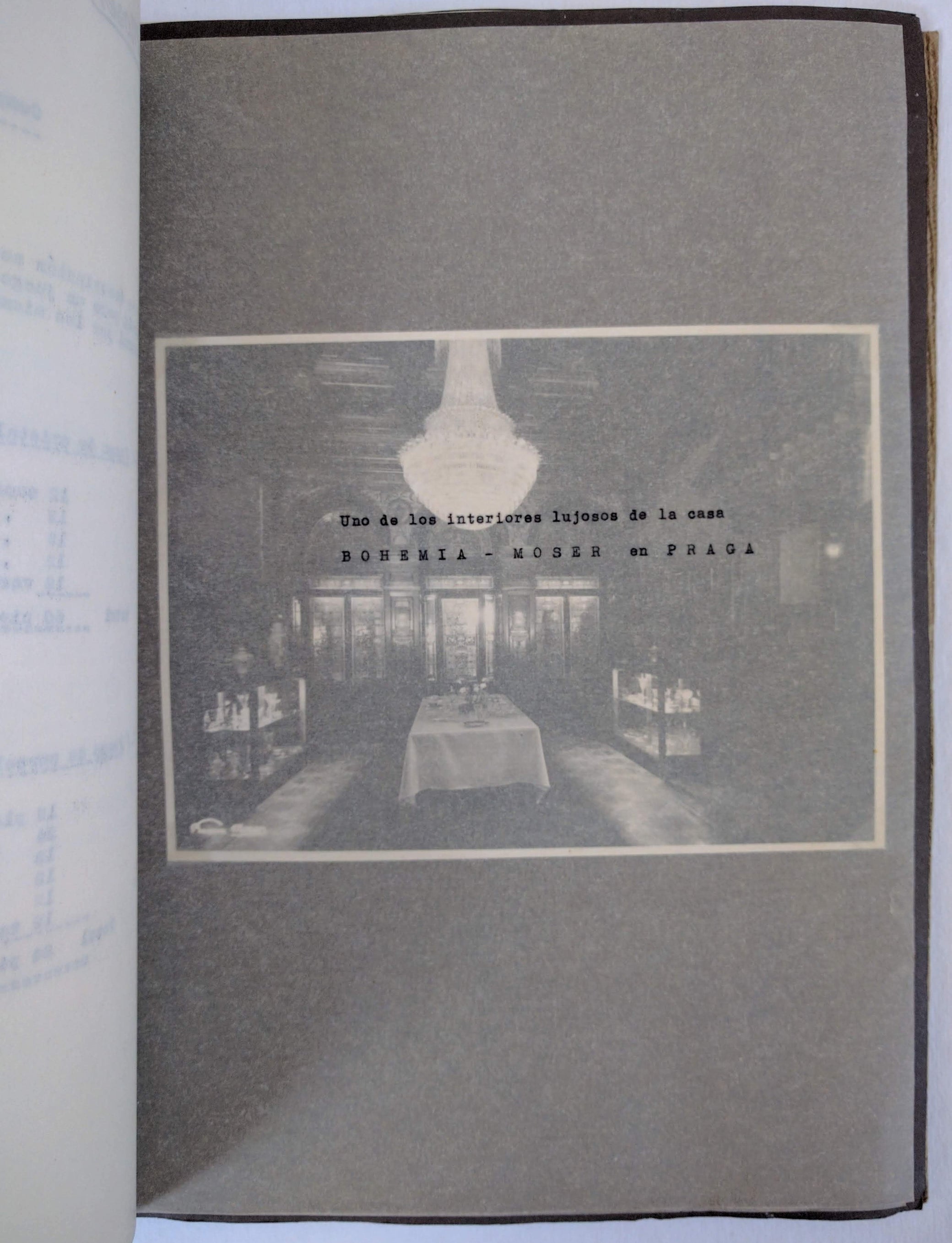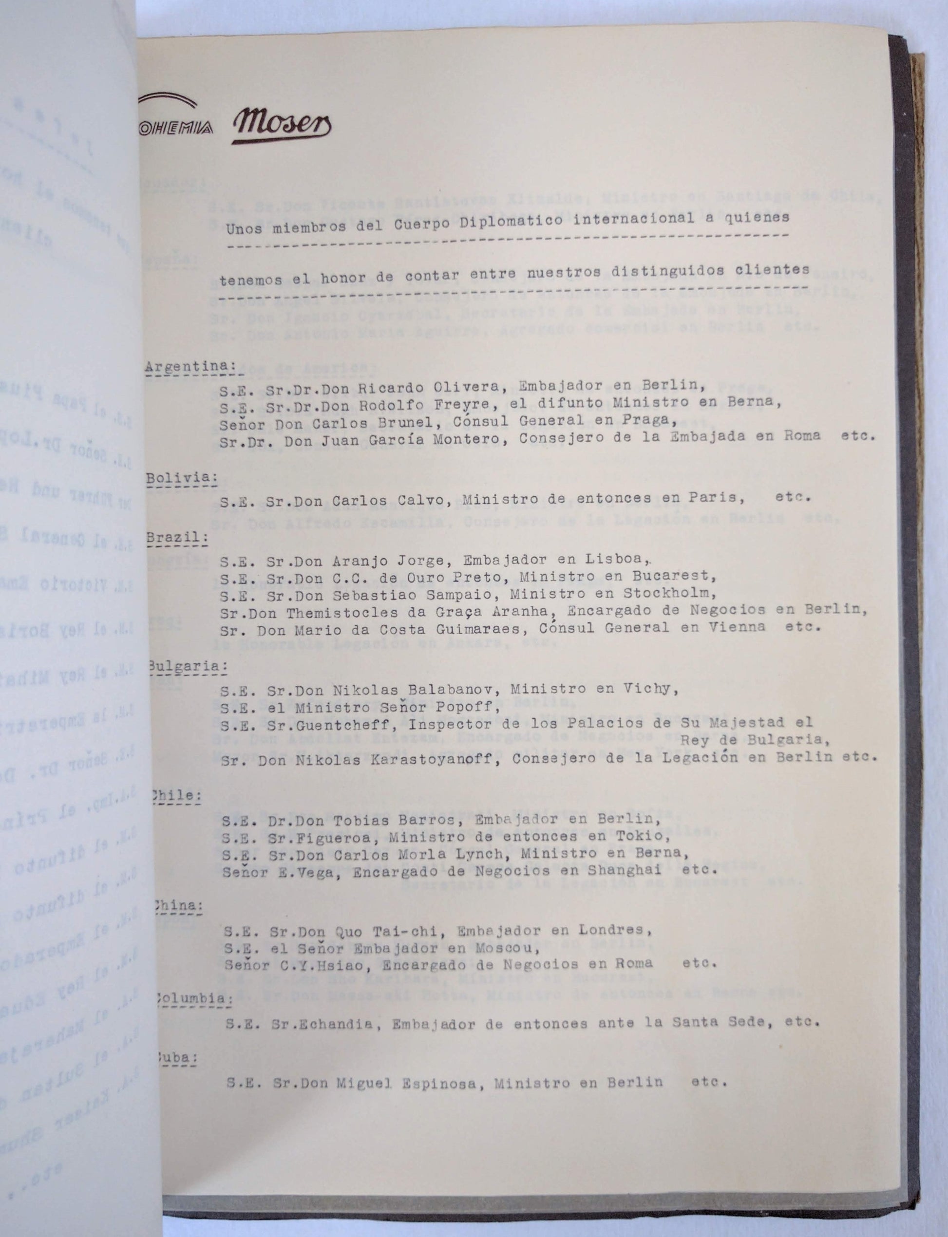 (Trade Catalogue). Bohemia-Moser-Praha. Prague: [Moser Glassworks], 1941. 4to, [8] typed and carbon copy leaves followed by 23 photographic prints mounted to [12] heavy card leaves, each interleaved with typed guards, photographs near fine, a few corner mounts detached; in stab-sewn paper wrappers, verso sl. soiled. An attractive and surprisingly political tableware catalogue sent by Bohemia-Moser-Praha to the El Salvadorian legate in Madrid in June, 1941. The introductory materials list the company's prominent clients: WWII-era heads of state and embassies. The list is a “who's who” of Axis country leaders and their “co-belligerent” states, puppet governments, and neutral allies (Adolf Hitler, Francisco Franco, Pope Pious XI, the Emperor of Japan, Kings of Bulgaria, Italy, Romania, and Spain, the Sultan of Johore, etc.). A few Allies are also listed, including the King of England and American diplomats. The interleaves identify the designs and prices of the tableware in the facing photographs, and provide the names of embassies and legations that have ordered the specific patterns shown. Franco's selection is featured. Moser was founded by the Czech-Jewish glass artist Ludwig Moser in 1857; a majority interest was sold in 1934 and the company was further nationalized after the Nazi occupation of Czechslovakia in 1939. In September 1941, a few months after this catalogue was released, much of the Moser family was killed in the Nazi liquidation of Jewish Bohemia. SOLD