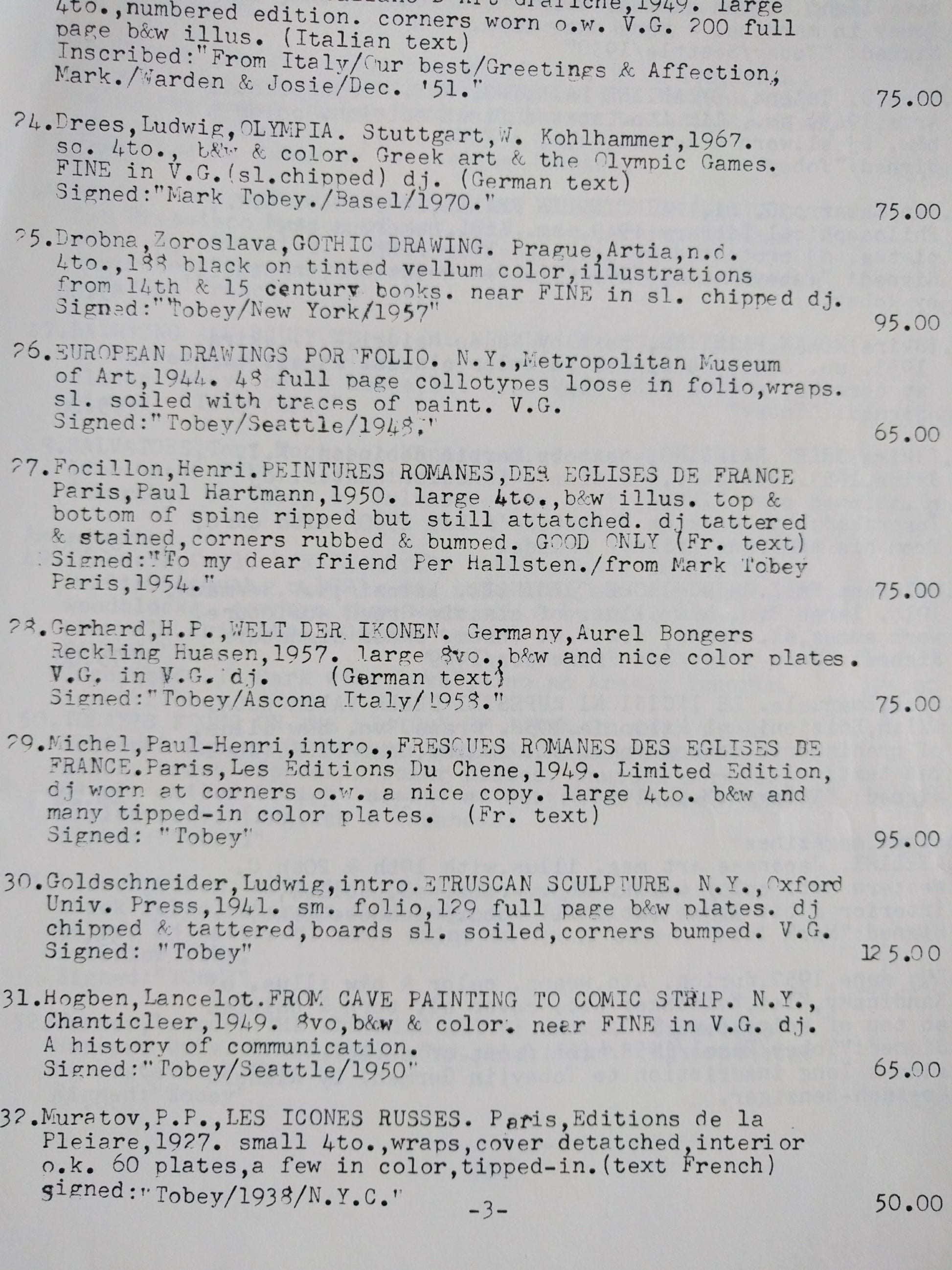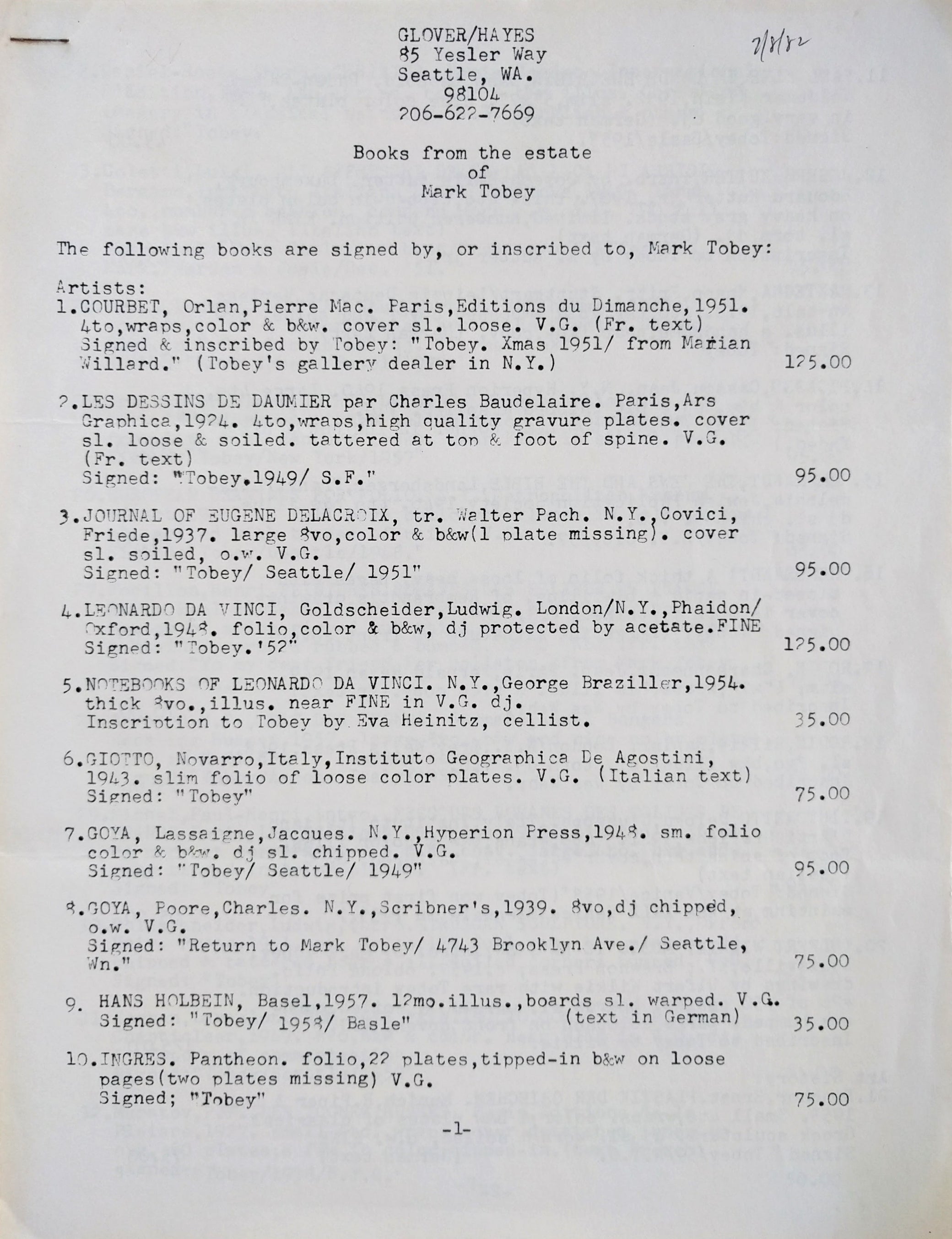 [Glover/Hayes]. Books from the estate of Mark Tobey. Seattle: 1982. 4to, 12 pp.; stapled mimeographed sales list of 143 books “signed by, or inscribed to, Mark Tobey,” dated in pen, minor creases from folds, good condition.