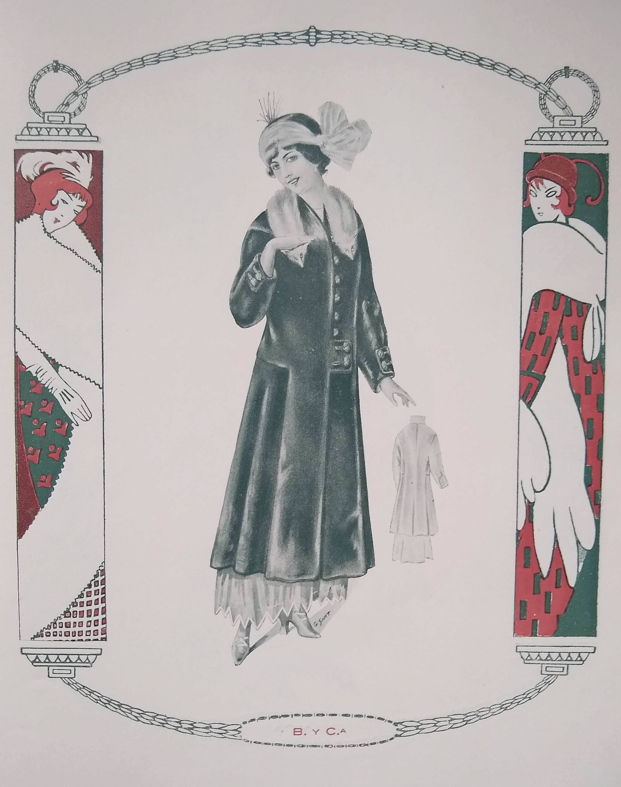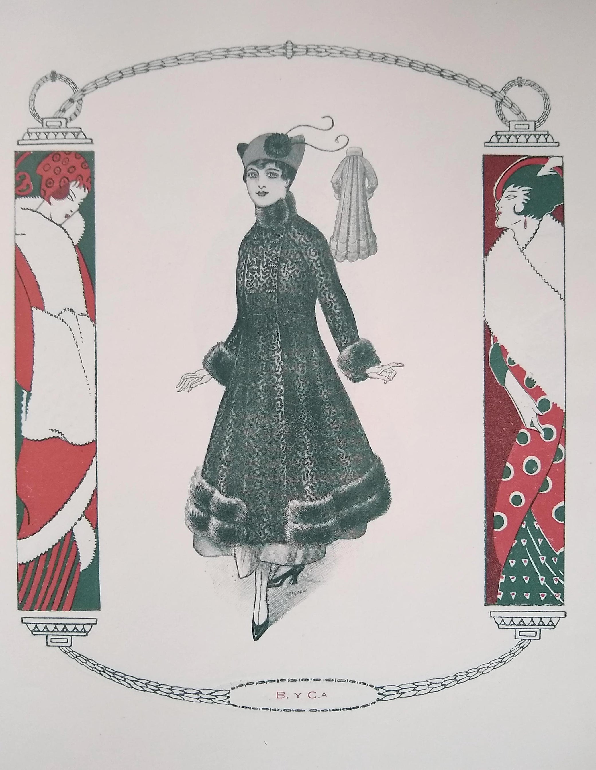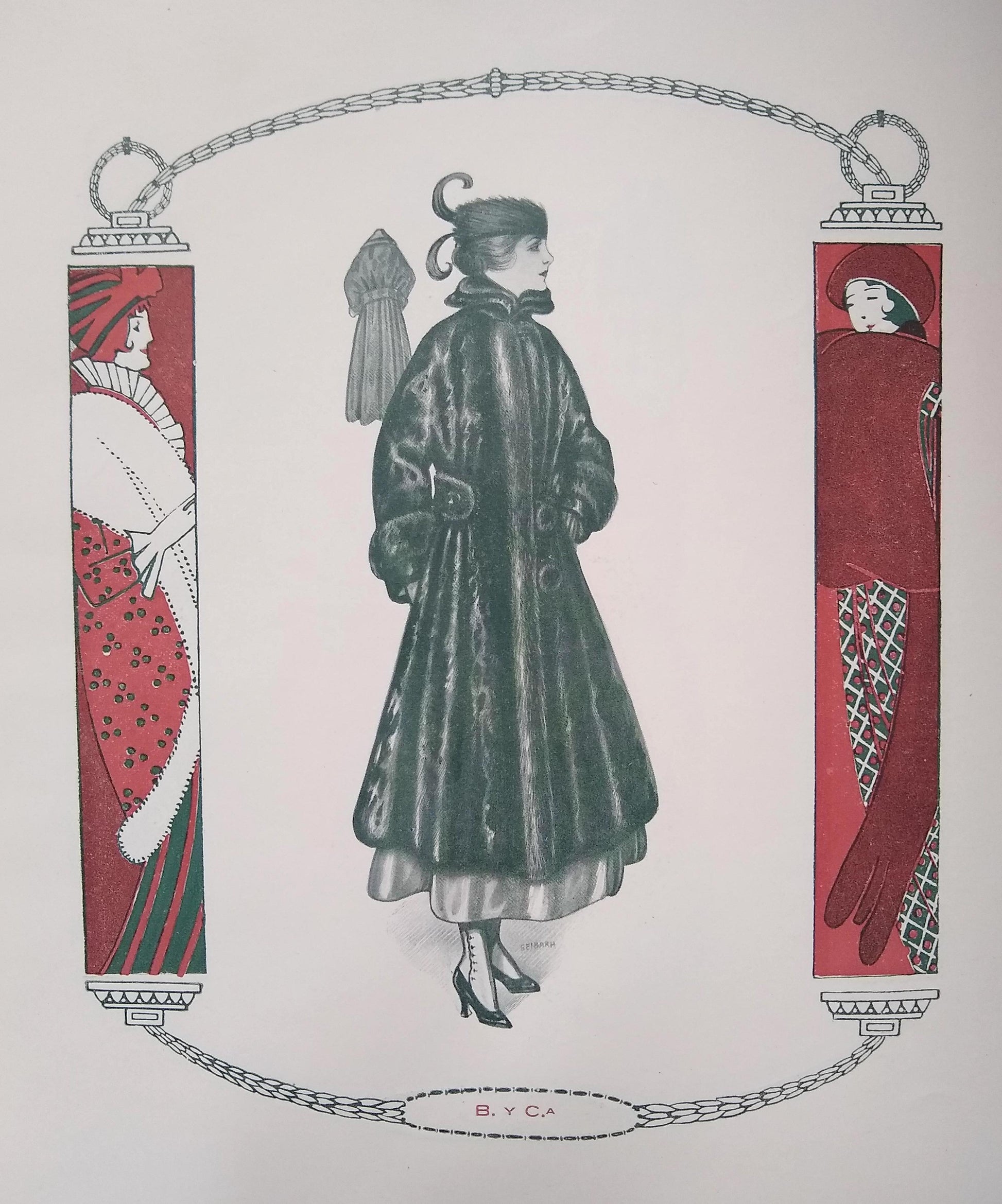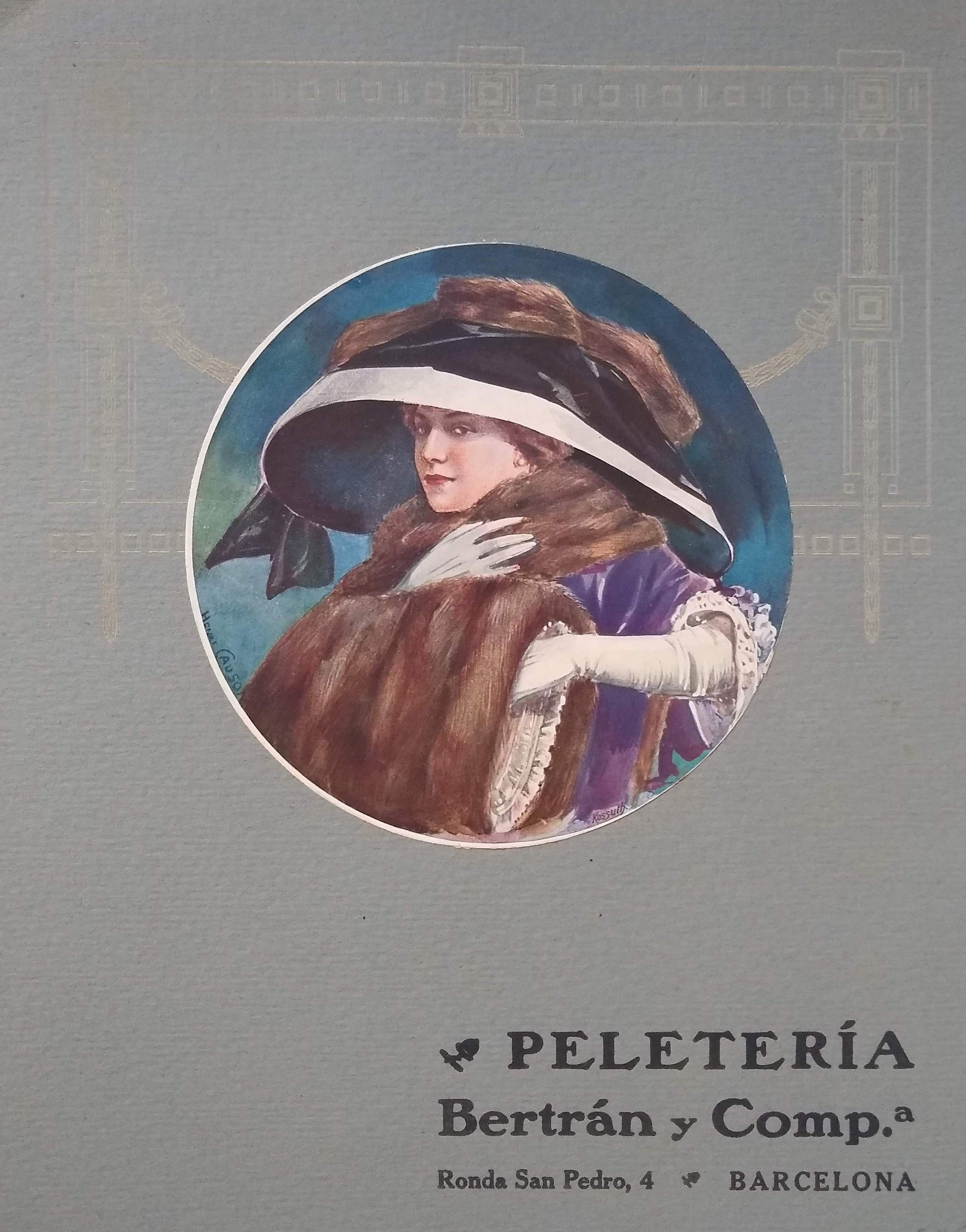 (Trade Catalogue - Fashion) Peletería Bertrán y Compania. Catálogo de Peletería. Barcelona: [Seix & Barral Herms.], [1915]. 4to (26.5 cm), [12] pp.; one page printed recto only, followed by [8] pp. of full-page plates with color graphics; in stapled french-fold wrapper with tipped-in pictorial illustration. Fine example of exuberant graphics and luxury commercial activities at the beginning of WWI. Published by Barcelona graphics specialist, Seix & Barral. Not found in OCLC.