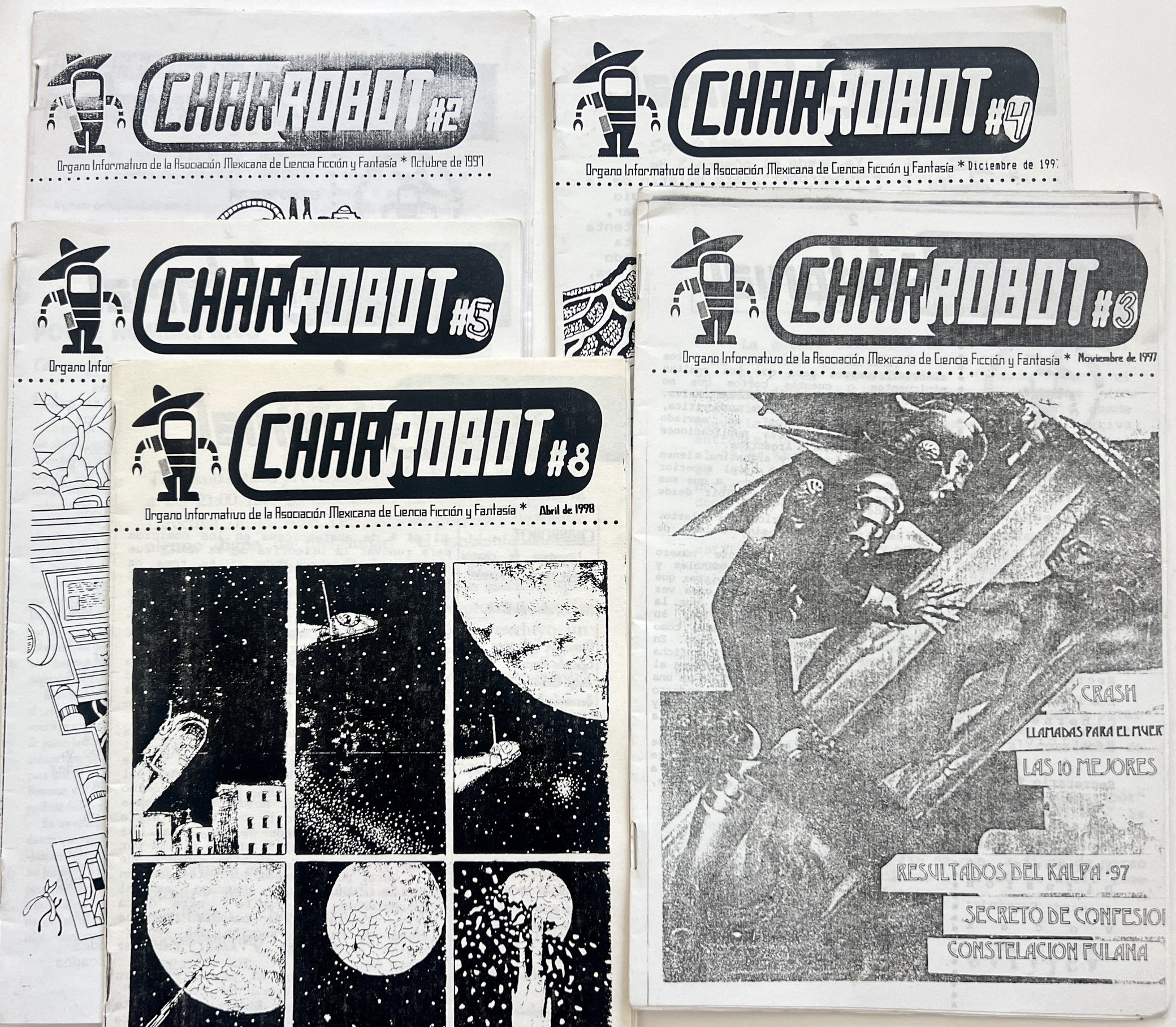Charrobot: Organo Informativo de la Asociación Mexicana de Ciencia Ficción y Fantasía. Nos. 2-5, 8. [México D.F.]: Asociación Mexicana de Ciencia Ficción y Fantasía, 1997-1998. 21.5 cm, 5 vols.; most 24 pp.; b/w illustrations, stapled illustrated wrappers.