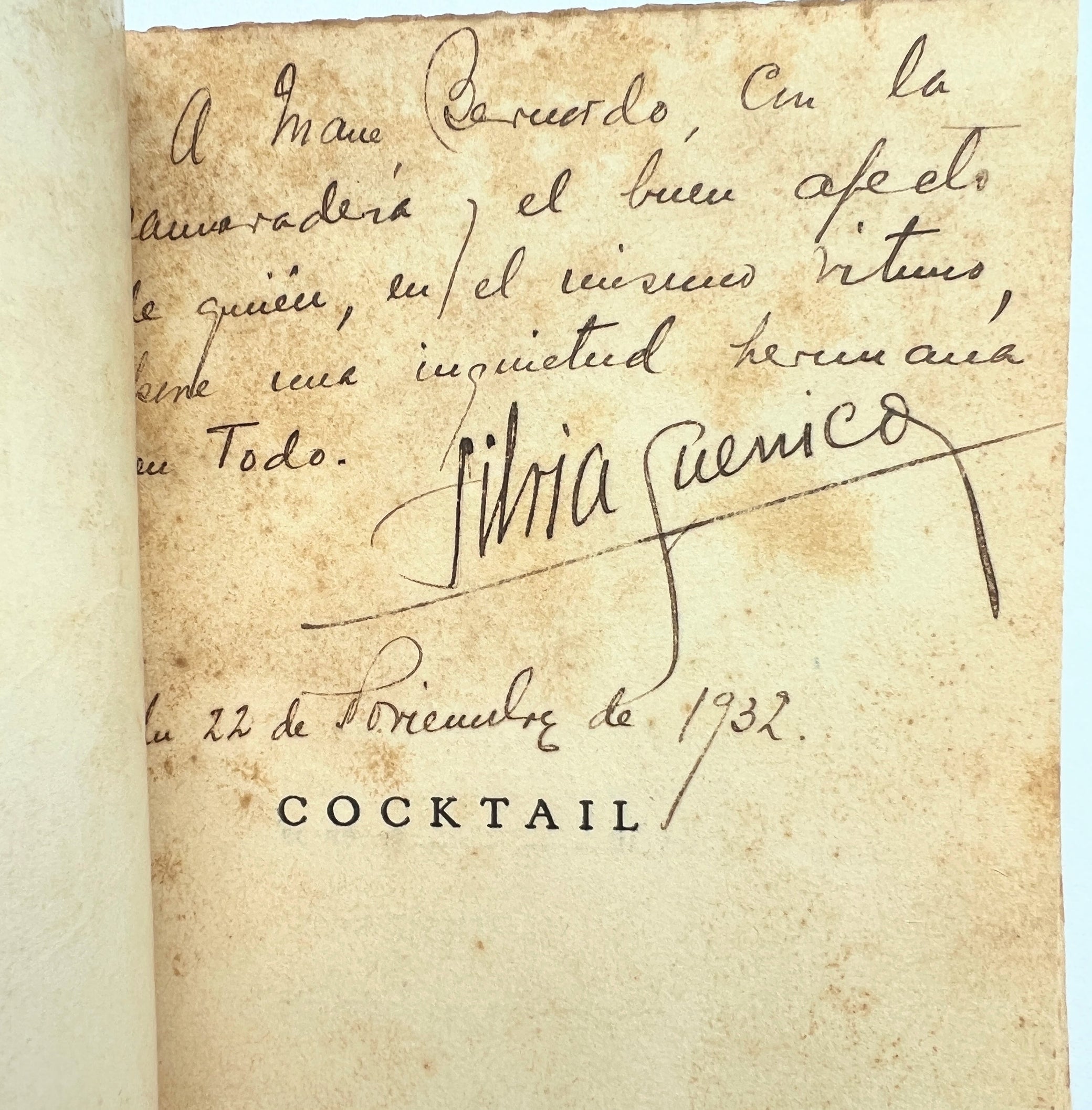 Guerrico, Silvia. Cocktail (Para el atardecer de un sábado inglés): Cuentos Breves. Buenos Aires: Editorial Tor, 1932. First edition. 18.5 cm, 157 pp.; textblock toned with foxing, stories followed by five pages of publicity and press blurbs about Guerrico and an index. Color wrapper with illustration by Luis Macaya (1888-1953), older glue repairs to spine. With signed manuscript dedication from the author to Mané Bernardo on half-title, and a newspaper clipping with a photograph of the author, accompanied by a second handwritten note from Guerrico to Bernardo, both laid in. Note reads “A Mane Bernardo, amiga muy querida, en el atardecer de este sábado inglés en que la alegría de todas hizo editar un segundo cocktail. Cariñosamente. Silvia.” Together with a signed copy of: Guerrico, Silvia. Los príncipes azules. Montevideo: Rossi, 1927. First edition. 20 cm, 139, [5] pp.; in color illus. glued wrapper, illustration by Mario Castellanos. Losses to wrappers, spine, and interior chipped and toned. Reading copy only. Signed dedication by the author on half-title to the poet Fermín Estrella Gutiérrez.
