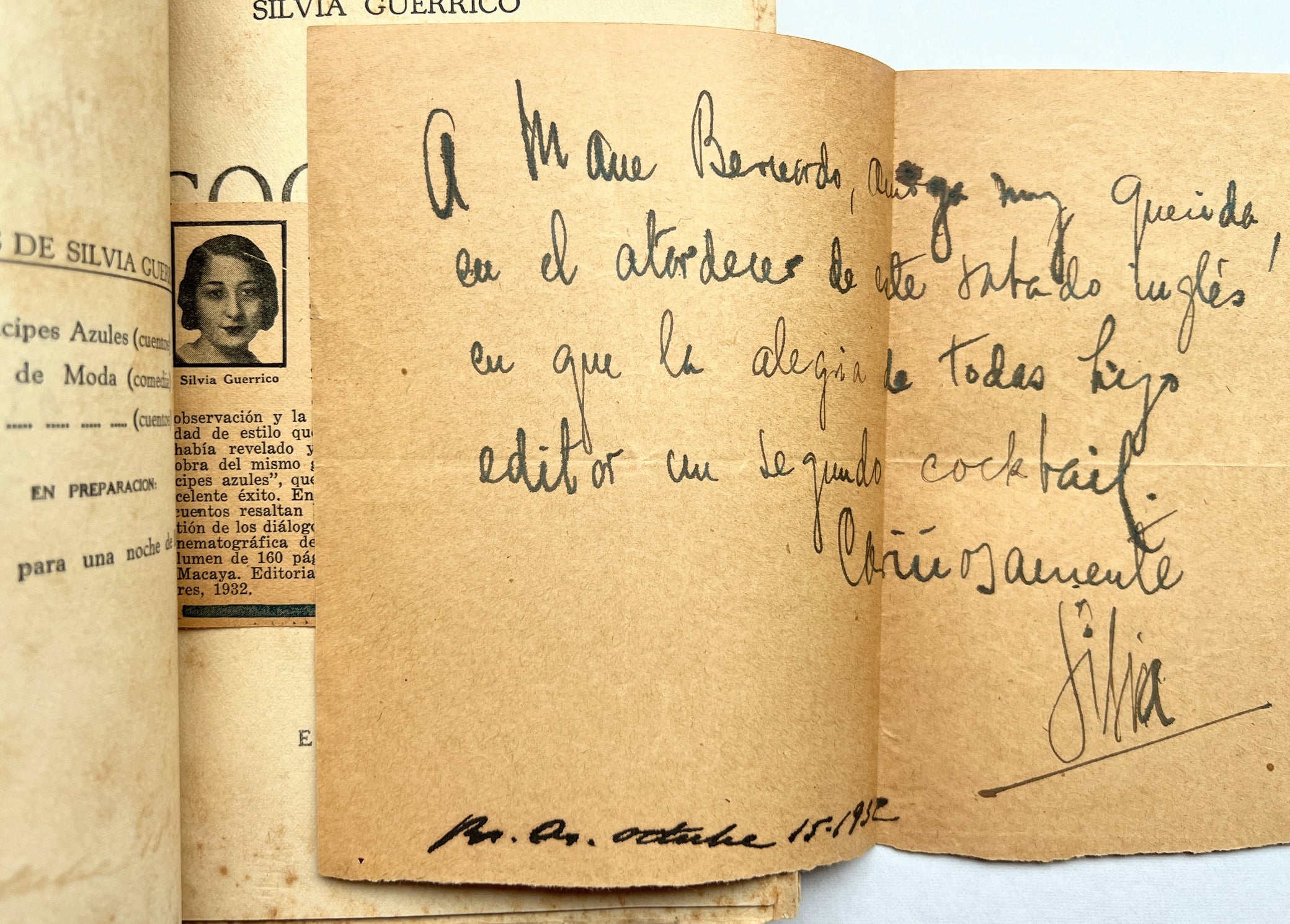 Important association copies of early short stories by radio star Silvia Guerrico (Uruguay, 1905-1983), whose daily program in Buenos Aires became one of the most popular primetime shows in Rio Plata during the medium's golden-age. Guerrico began her career as a theater critic in Montevideo, where she published Los príncipes azules (Prince charmings) when she was just 22. The collection was well-received by her contemporaries, including Juana de Ibarborou and Blanca Luz Brum. Brum wrote that “since she lives her life touching the painful and burning things, she could very well be a ‘little Russian’in our literature [otherwise] prostituted by pornography and gauchismo.” (From publicity blurb in Cocktail, p. 157.) Guerrico moved to Buenos Aires in 1928, where she shifted back and forth between print (incl. a regular newspaper column) and the radio, starting her own “magazine” program in late 1930. This quickly evolved into a daily broadcast called Cartel sonoro featuring many of her own poems and radio plays. Cartel sonoro was part of a wider effort to attract female audiences and consumers to variety shows and narrative programming. By the age of twenty-seven, Guerrico's program had become a primetime success and an important platform for other women journalists and writers. Despite her popularity, she was regularly criticized for the “vulgarity” and “femininity” of her on-air persona. Her rise corresponded to a new era of celebrity in Argentinian radio, and the government was just catching up to conservative concerns about the immorality of radio programming and modern music (particularly tango). It was during this period that she wrote the stories in Cocktail, which, like Los Principes Azules, depict modern women drinking and dancing and men who exploit and violate them. In Guerrico's telling, the only exceptions to this dynamic are men and women of strong moral character brave enough to stand up for themselves.