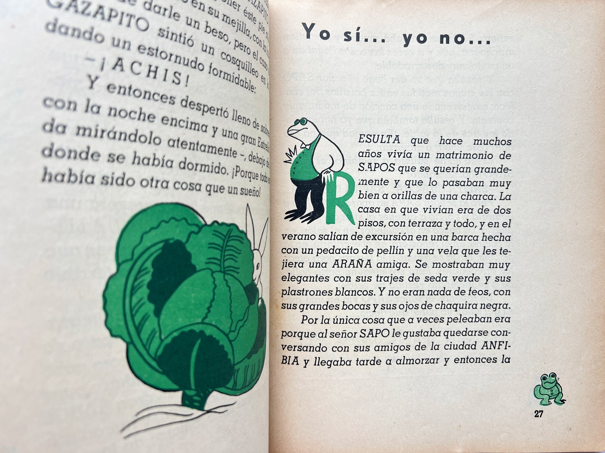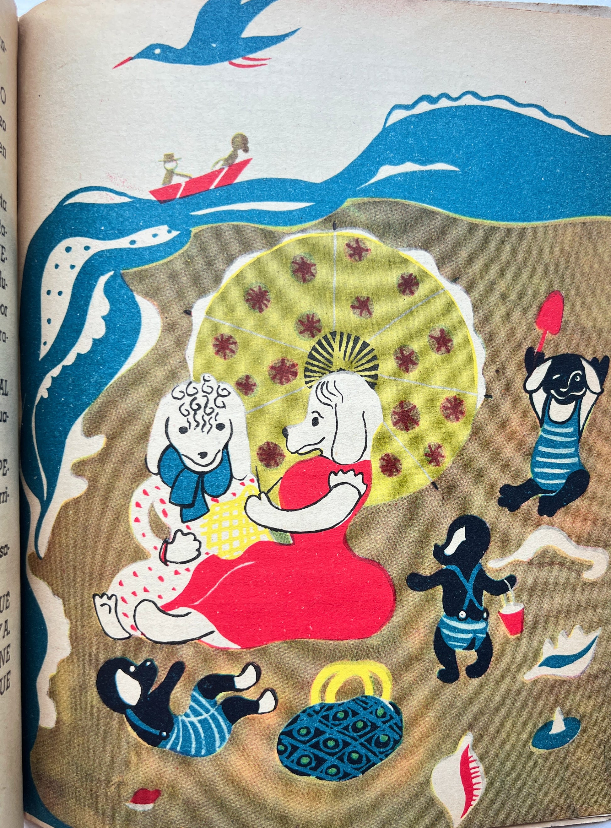 Brunet, Marta. Maria Valencia, Illus. Cuentos para Mari-Sol. Santiago de Chile: Zig Zag, nd. (1938?). First edition. 25.2 cm, 49, [1], pp.; letterpress? with four-color halftone title page and five four-color halftone plates, additional in-text color halftone illus. throughout; each of the seven stories beginning with a historiated initial “R” (“Resulta que…”); the page numbers with changing ornamental surrounds corresponding to the different stories. Text block clean and uniformly toned, colors bright with some ghostingbleedthrough from the inking of the color illustrations. Orig. stapled card stock boards, rebacked, with orig. color illustrated wrapper, stained and reinforced at edges and spine where there were small losses, BrunetValencia “ex-libris” design on the rear wrapper.