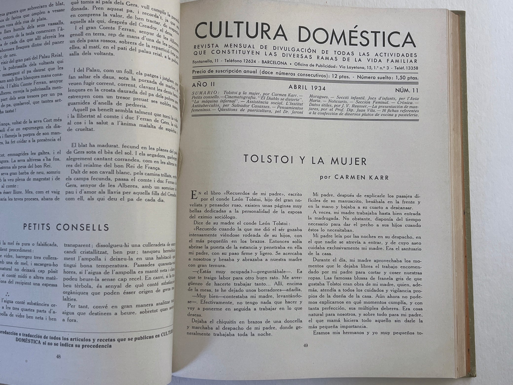 (Feminism) [Karr, Carme, aka Carmen Karr] Cultura Doméstica: Revista Mensual de [...] las Diversas Ramas de la Vida Familiar. Año I, Núm 1-18; followed by Cultura Femenina: Revista Mensual Ilustrada de la Mujer y el Hogar. Año III, Núm 19-24 (all published). 26.8 cm, annual continuous pagination (122, 182, and 96 pp. respectively); illustrated women’s serial with texts in both Castilian and Catalan, bound in single cloth volume, lacking orig. wrappers. Barcelona: 1933-1935.