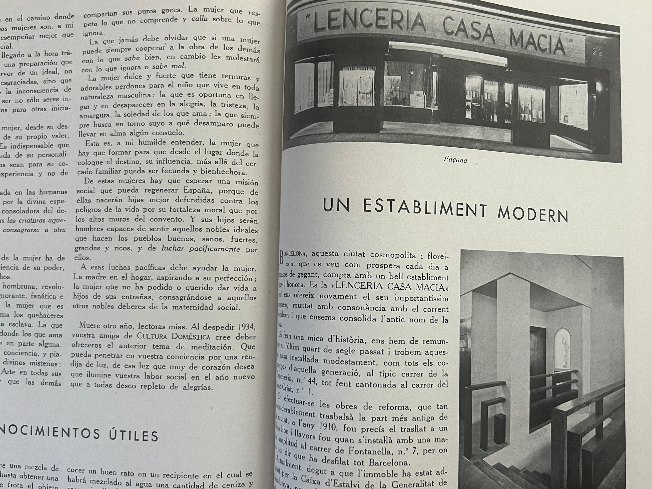 The serial documents the early days of this brief moment in Spanish women’s history (roughly 1931-1939), when new freedoms and roles were possible. This period lasted until the Republican defeat in the Civil War ushered in a new era of tradition and oppression. Along with monthly columns on women’s issues and news by Karr (e.g. “La mission social de la mujer en la vida moderna,” the magazine carried regular features on girl’s education, women at work and job training, medicine and family health, cooking, fashion, applied arts and interior design, all with an emphasis on modern styles, particularly German. Contributions by or articles on artists and authors including Elvira August Lewi, Margarita Sans Jordi, Margarita Xirgu, Anna Casanovas (book binder), Maria Teresa Vernet, Enriqueta Pascual Benigani, and the fashion houses Pedro Rodriguez and El Dique Flotante.