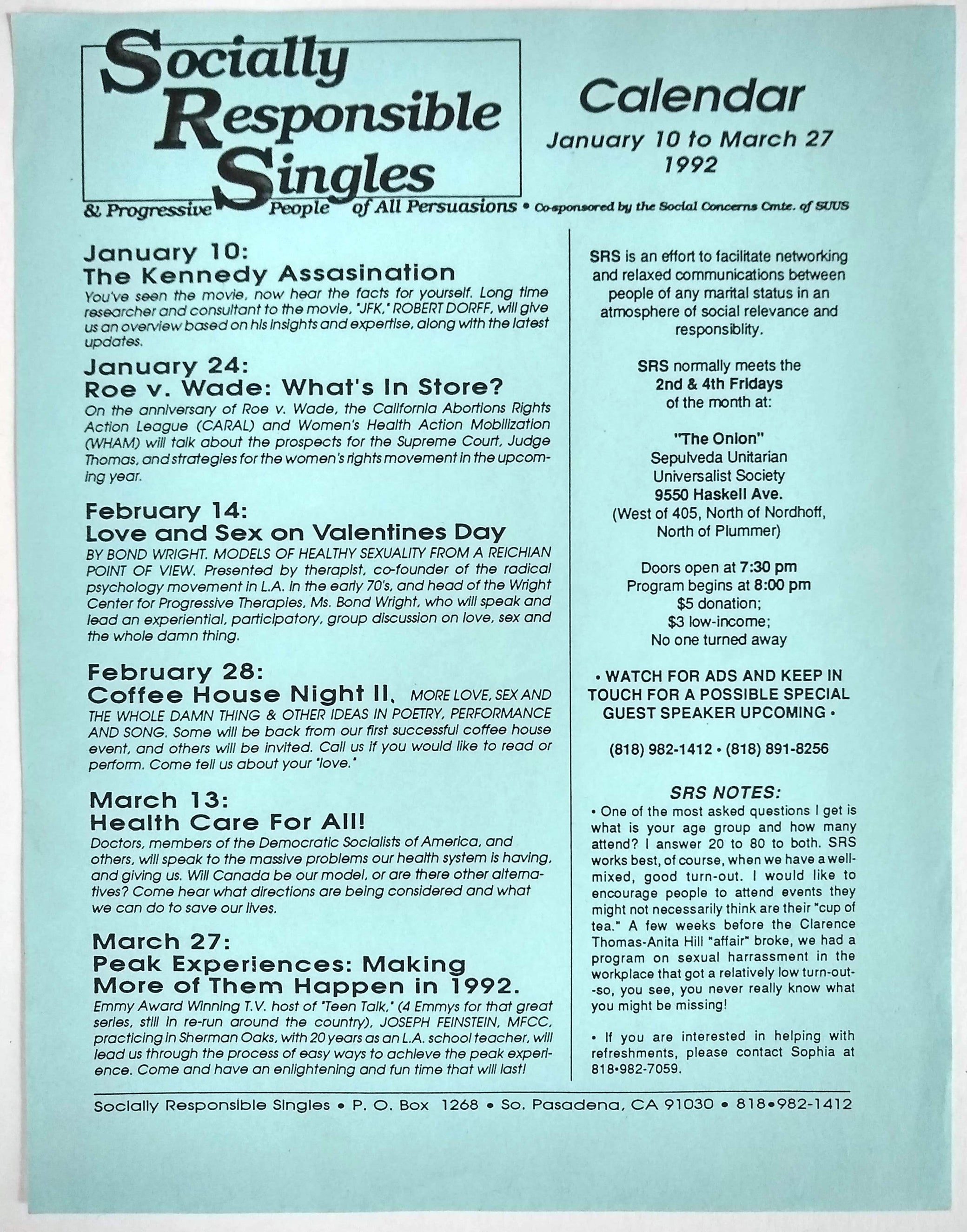 (Dating) (California) Cole, Susan D. The Woman's Guide to the East Bay Singles’Scene. Richmond, CA: Wildcat Canyon Books, 1983. 8vo, 108 pp.; black and white reproductions of drawings by Judy Fein; printed color wrapper, small dampstain on fore-edge affecting perhaps 5 pages in margin only, else very good. Half-title inscription by author. Together with: Socially Responsible Singles. Socially Responsible Singles Calendar, January 10 to March 27, 1992. Pasadena, CA: 1992. Single sheet of blue copy paper, 8-½ x 11 in., printed recto only. Very Good. Excellent period snapshot of dating mores and hot spots for heterosexual women in the East Bay and socially responsible singles in Los Angeles. Written by a recent divorcée, Woman's Guide answers the questions: “Where can I meet interesting people?” “What are the current ideas about dating (Who pays? Who makes decisions about where to go? What about sex? Who calls whom?)” “Where is it safe to go alone at night?” “Can I initiate conversations with men?” The Socially Responsible Singles calendar offers “an atmosphere of social relevance and responsibility.” Romantic events include a Democratic Socialist healthcare meeting and a discussion night on Roe v. Wade. Reference made to recent Clarence Thomas-Anita Hill events. Neither recorded in OCLC. SOLD