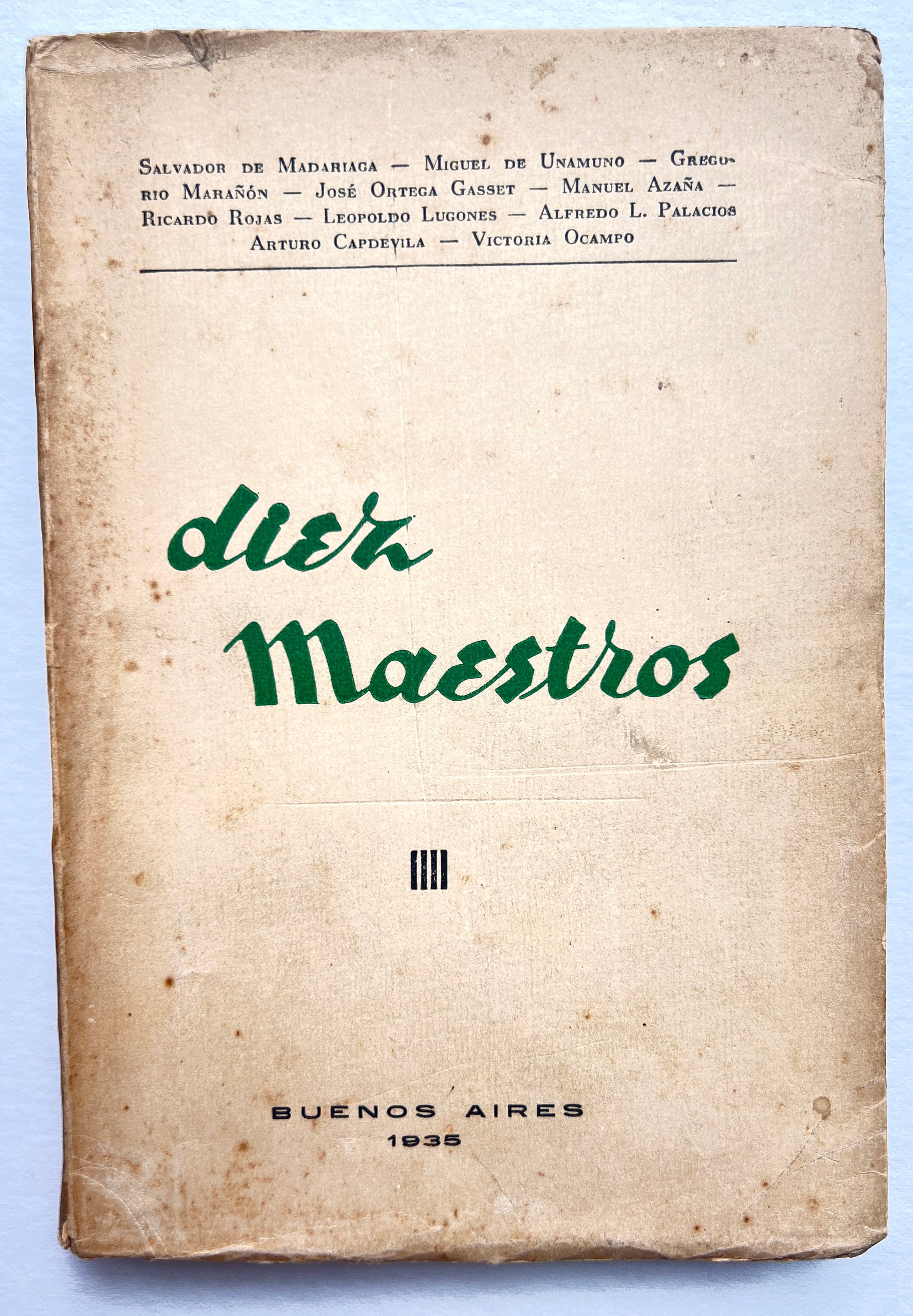 Ocampo, Victoria. Diez Maestros. Buenos Aires: Plan Cultural de la Manufactura de Tabacos “Particular”, 1935. 18.5 cm, 185 pp.; fore-edges foxed, interior clean; wrapper foxed and stained, edges bumped, spine chipping. Proceedings of a radio conference held simultaneously in Madrid and Buenos Aires. Commercially sponsored by a tobacco company, the list of participants included Jobsé Ortega y Gasset, Victoria Ocampo, Leopoldo Lugones, and Manuel Azaña among others.