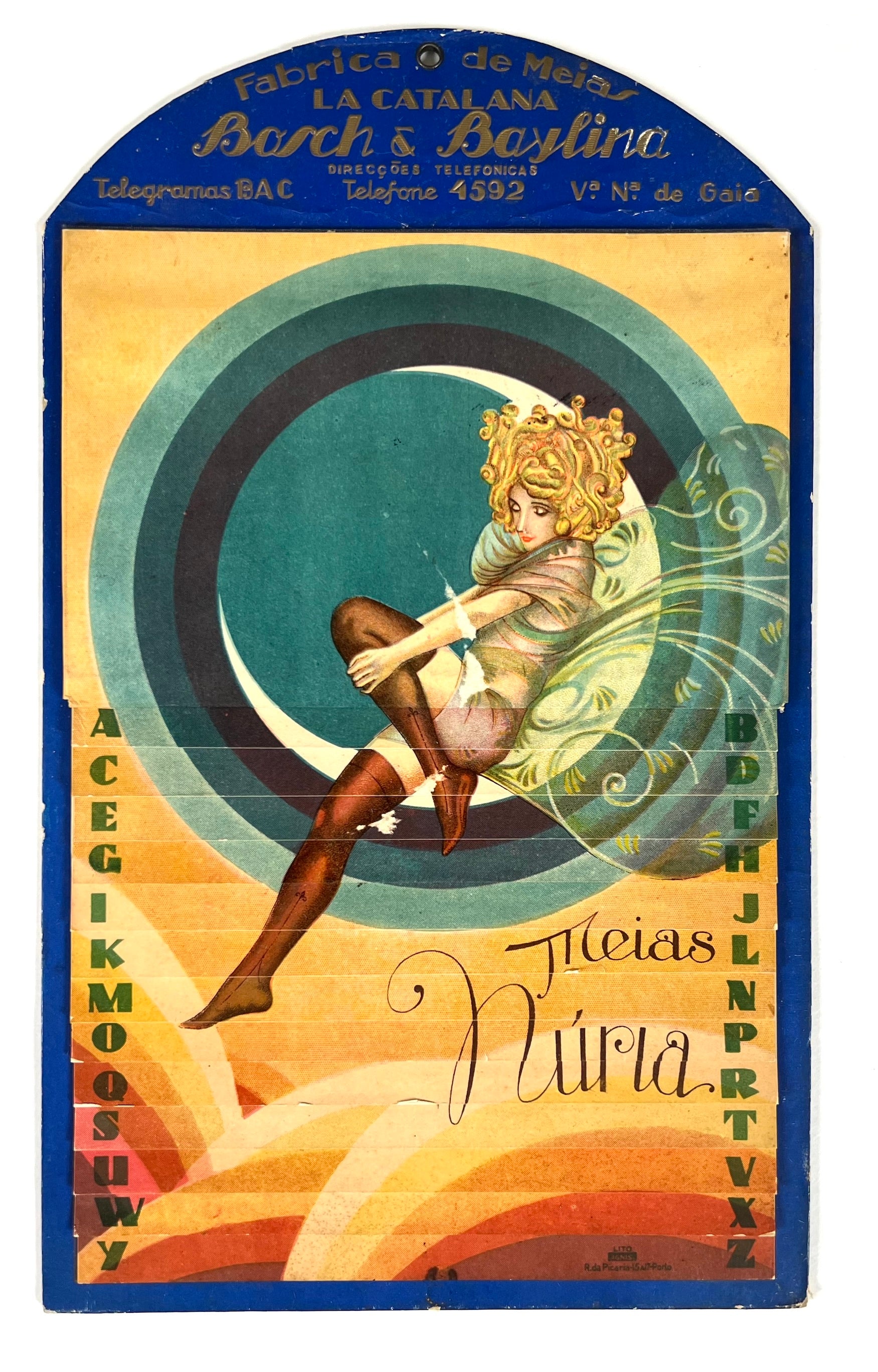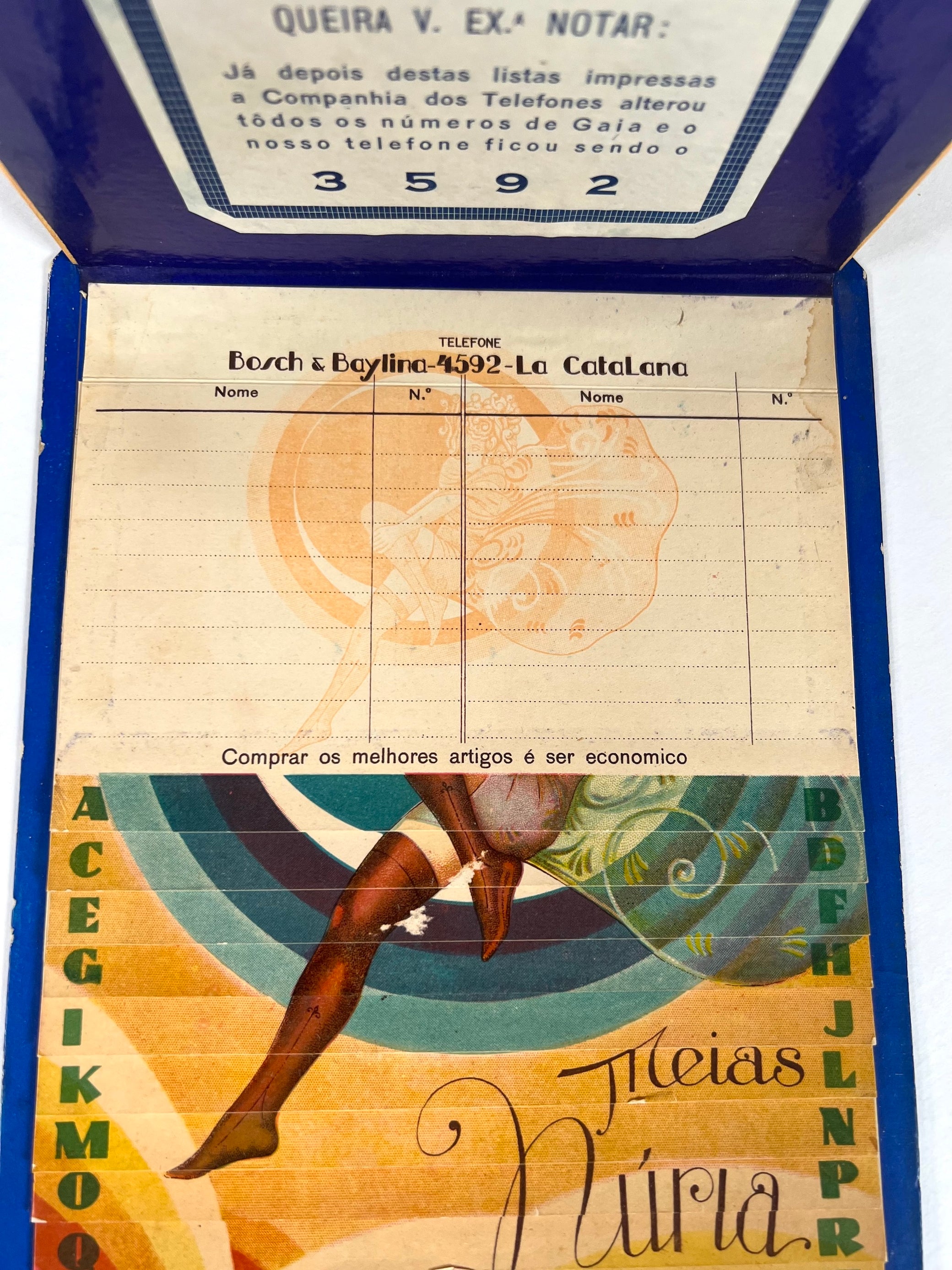 Bosch & Baylina. Direcções Telefonicas. [Porto, Portugal]: [1938]. 30 cm. Unused. Decorative hanging telephone directory with color lithographic printing across fourteen heavy index cards mounted to board, the first further reinforced. Lightly abraded at center of design, affecting three leaves.