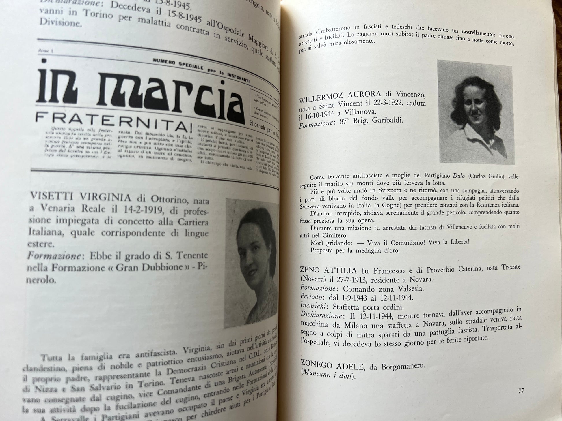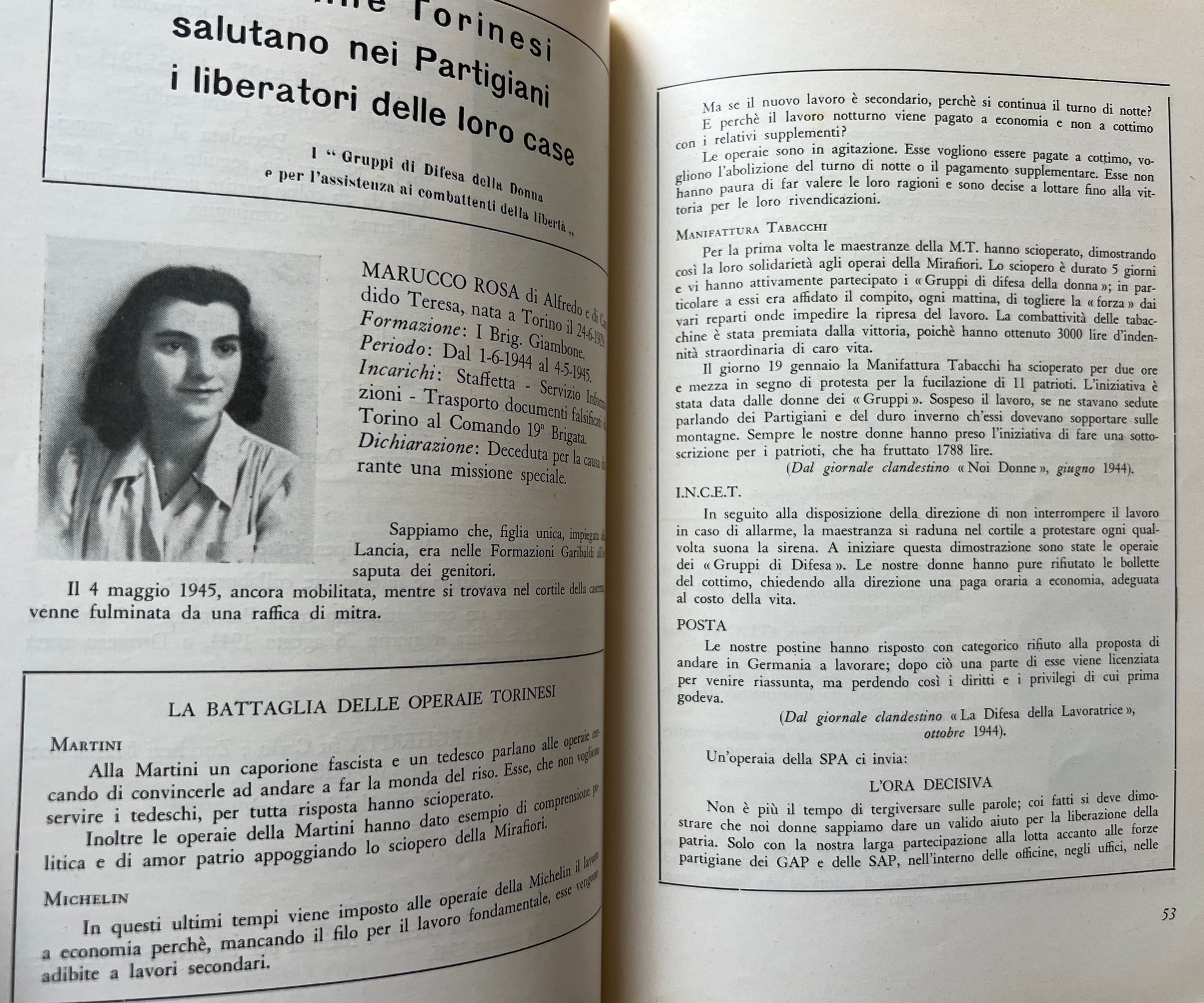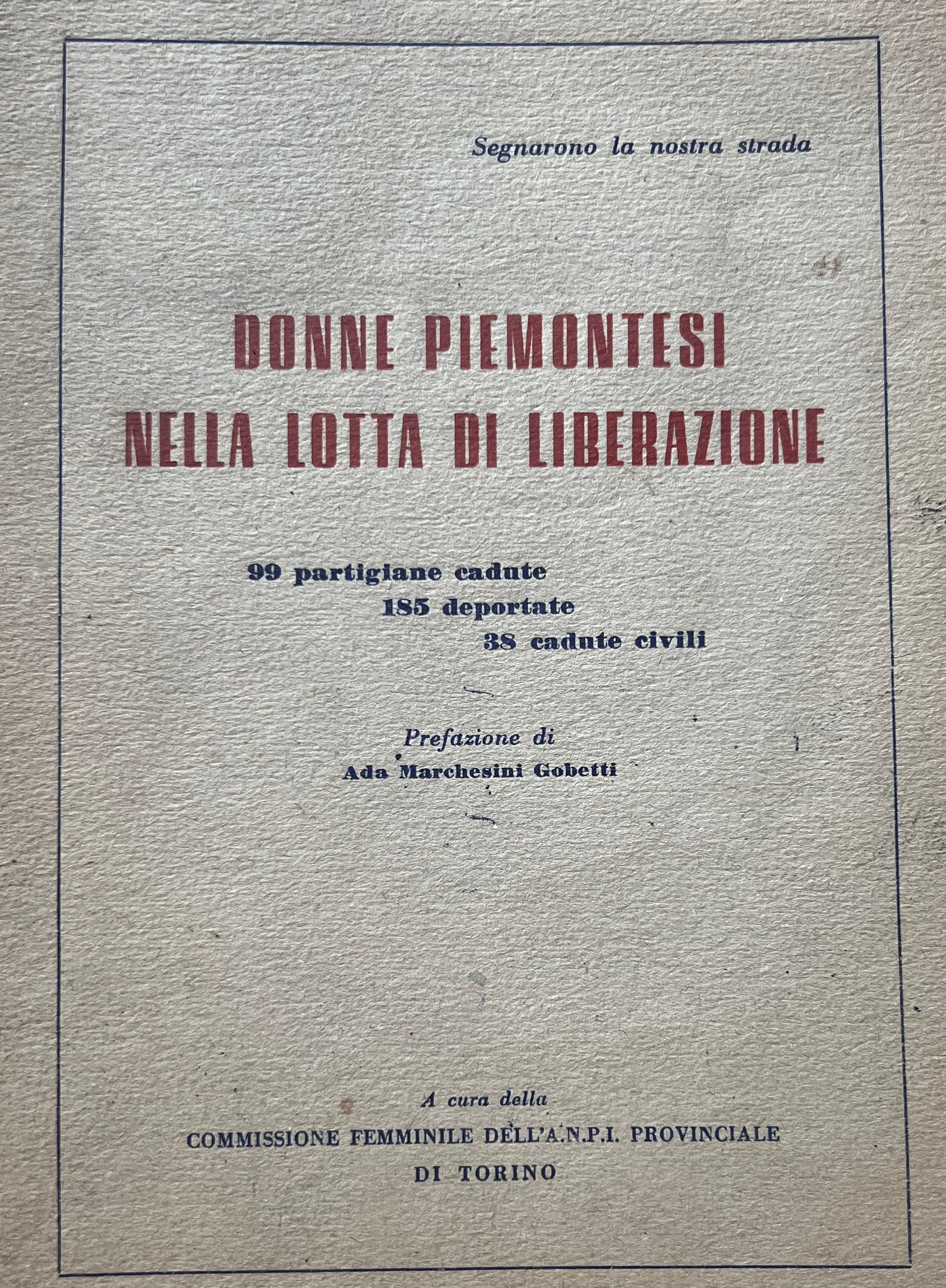 Gobetti, Ada, Intro. Donne piemontesi nella lotta di liberazione 99 partigiane cadute, 185 deportate, 38 cadute civili. Turin, Italy: Torino Commissione femminile dell’A.N.P.I. provinciale di Torino, nd. [ca. 1945]. 24 cm, 103 pp.; many bw portraits, wrappers darkened and a bit worn, small ink numeric notation on front cover.