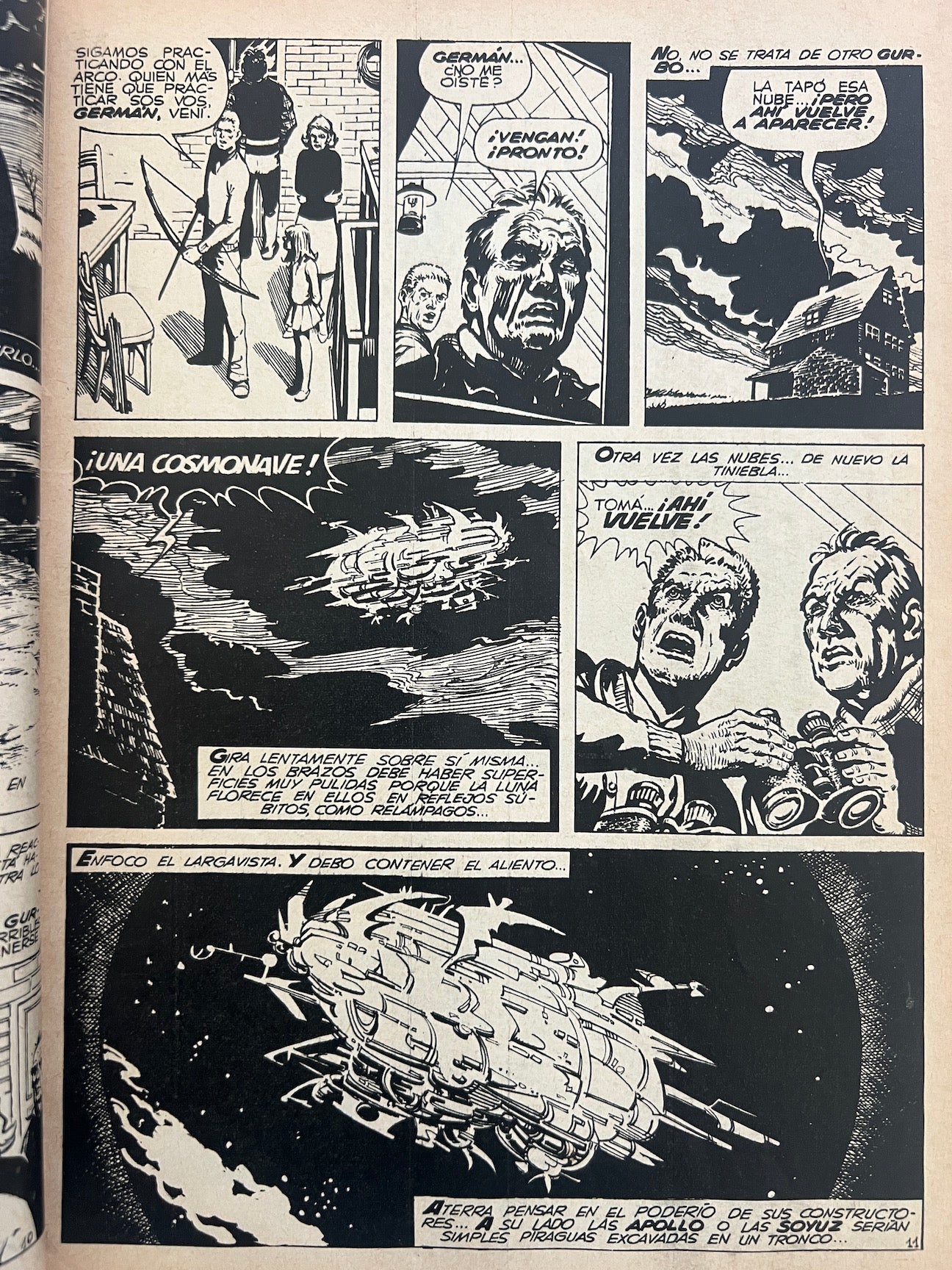 The first chapter of El Eternauta II was published in the serial Skorpio in December 1976, nine months after the coup d’etat that established Argentina’s final military junta. Oesterheld’s family was already the victim of Argentinian death squads - in the summer of 1976 two of his daughters were disappeared: Beatriz (19) and Diana (23 and pregnant); his third, Marina (20 and pregnant), was taken in November. The women and their children were never found. Oesterheld himself was in hiding and submitting new chapters of Eternauta II through clandestine channels, the episodes churn with heightened terror and anxiety; it was dangerous to publish and only three of the 17 Skorpio issues advertised Eternauta II episodes on the cover (Libro de Oro 2; Nos. 28 and 33).