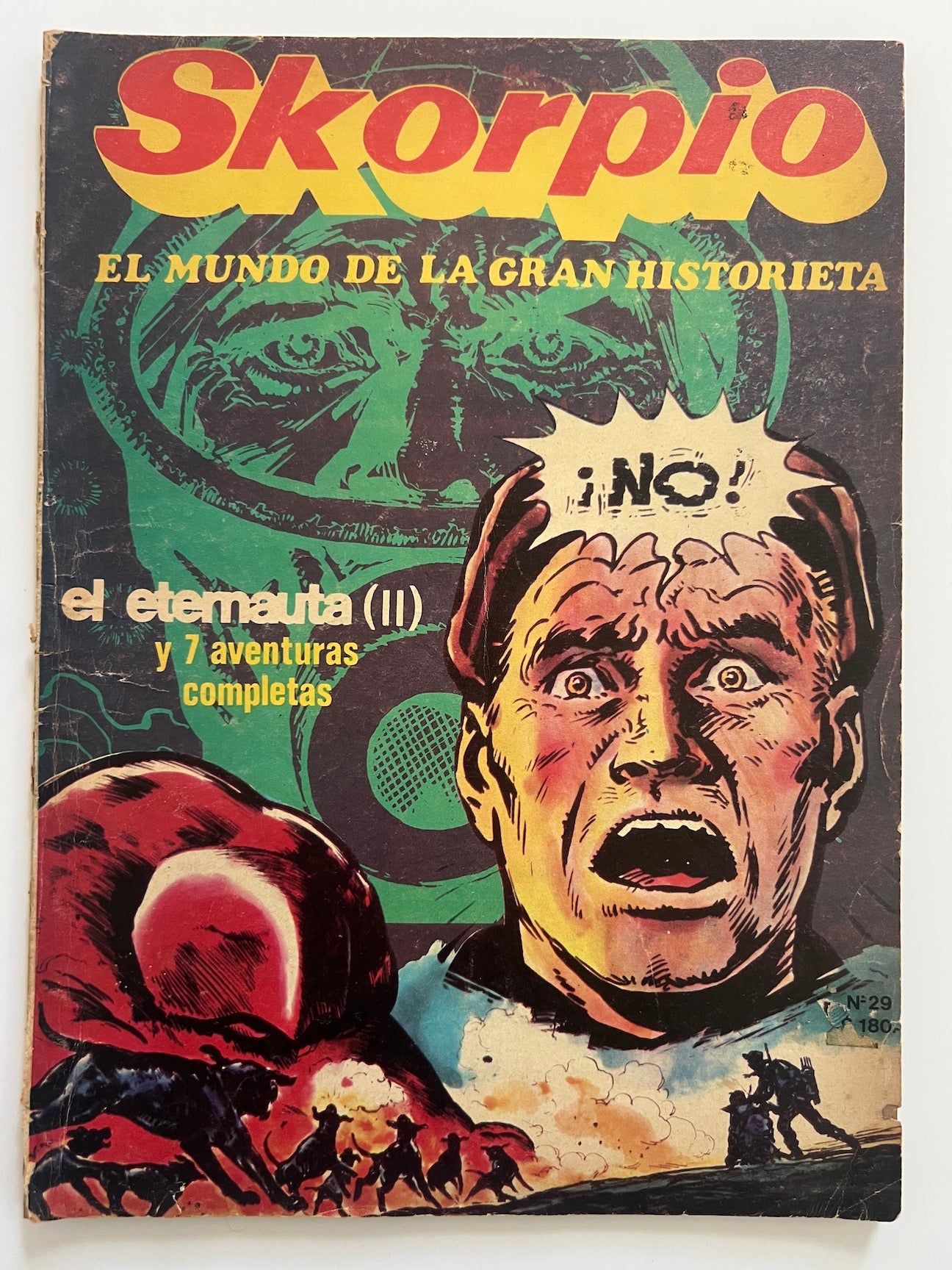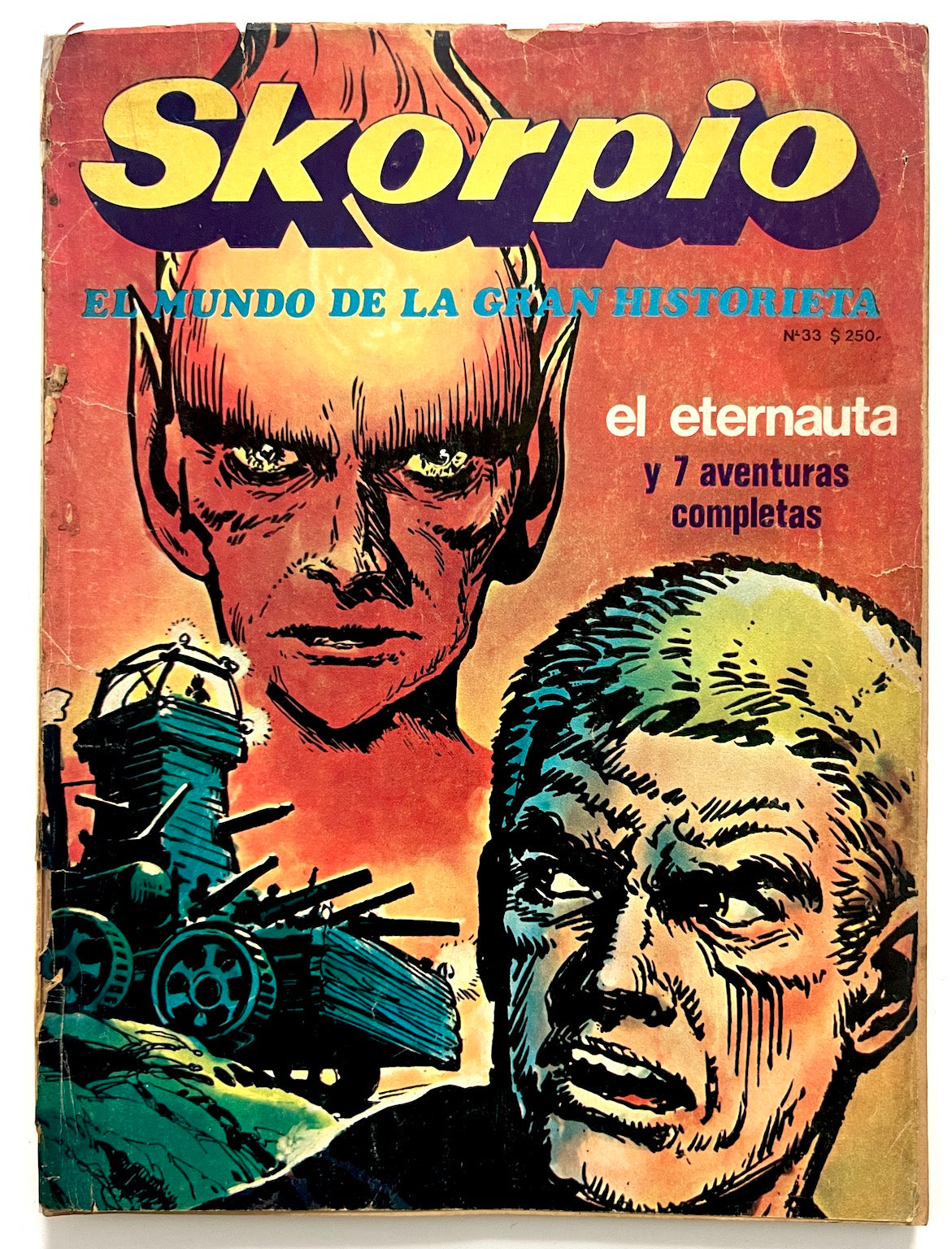The real danger of publishing and possessing Oesterheld’s work, coupled with the low quality of the era’s paper stock, resulted in many destroyed, damaged, or discarded copies. Issues from 1976 and 1977 rarely appear on the market. Eternauta II did not appear in the Italian version of Skorpio until years later. Two recorded OCLC holdings in North America: a single issue at MSU and a complete set at Duke.