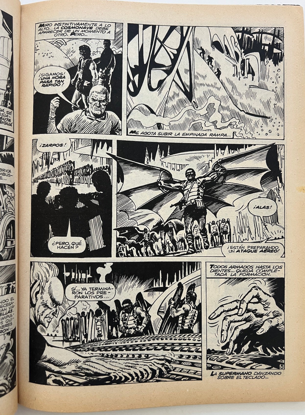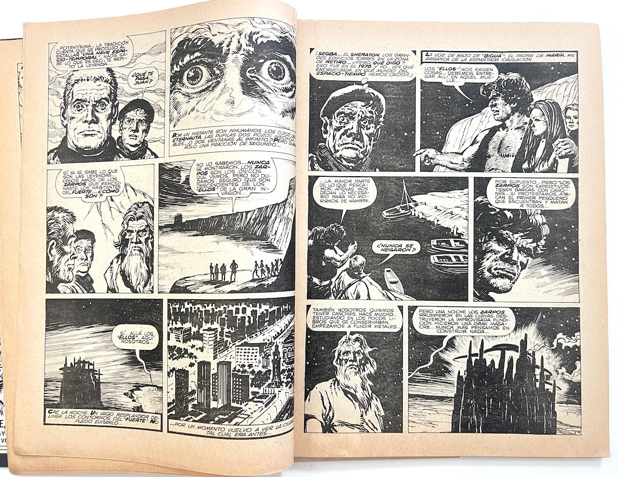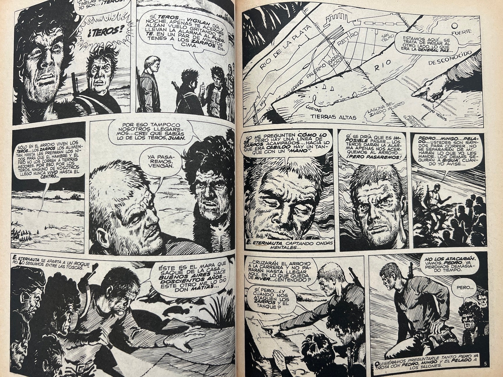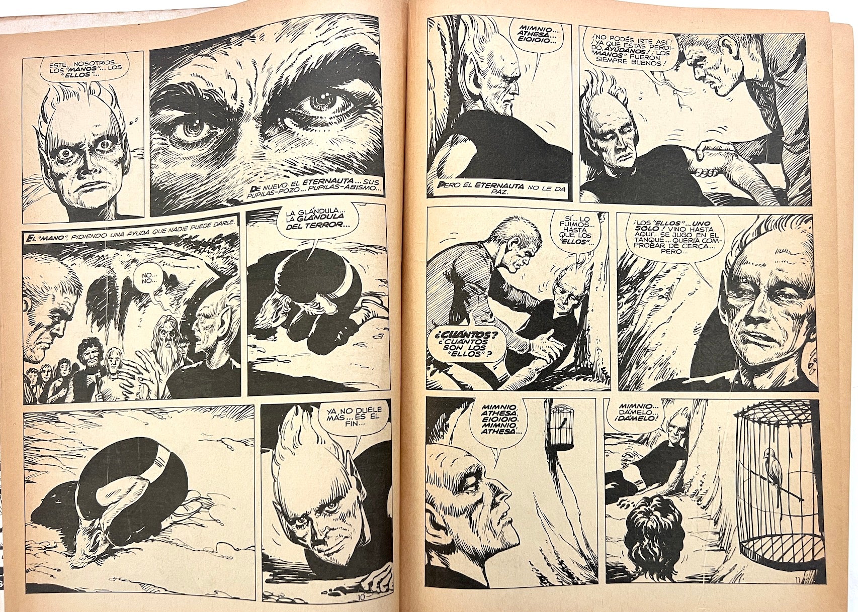 Not unlike iconic US comics of the 1950s and 1960s, El Eternauta has generated many sequels and spinoffs (including a 2025 Netflix series). Despite a somewhat confusing number of anthologies, reprints, and edited editions, there were only three distinct Eternauta series authored by Héctor Germán Oesterheld: El Eternauta I [1957-1959], El Eternauta 1969 [a heavily edited version of El Eternauta I with new illus.], and the present sequel, El Eternauta II [1976-1978].