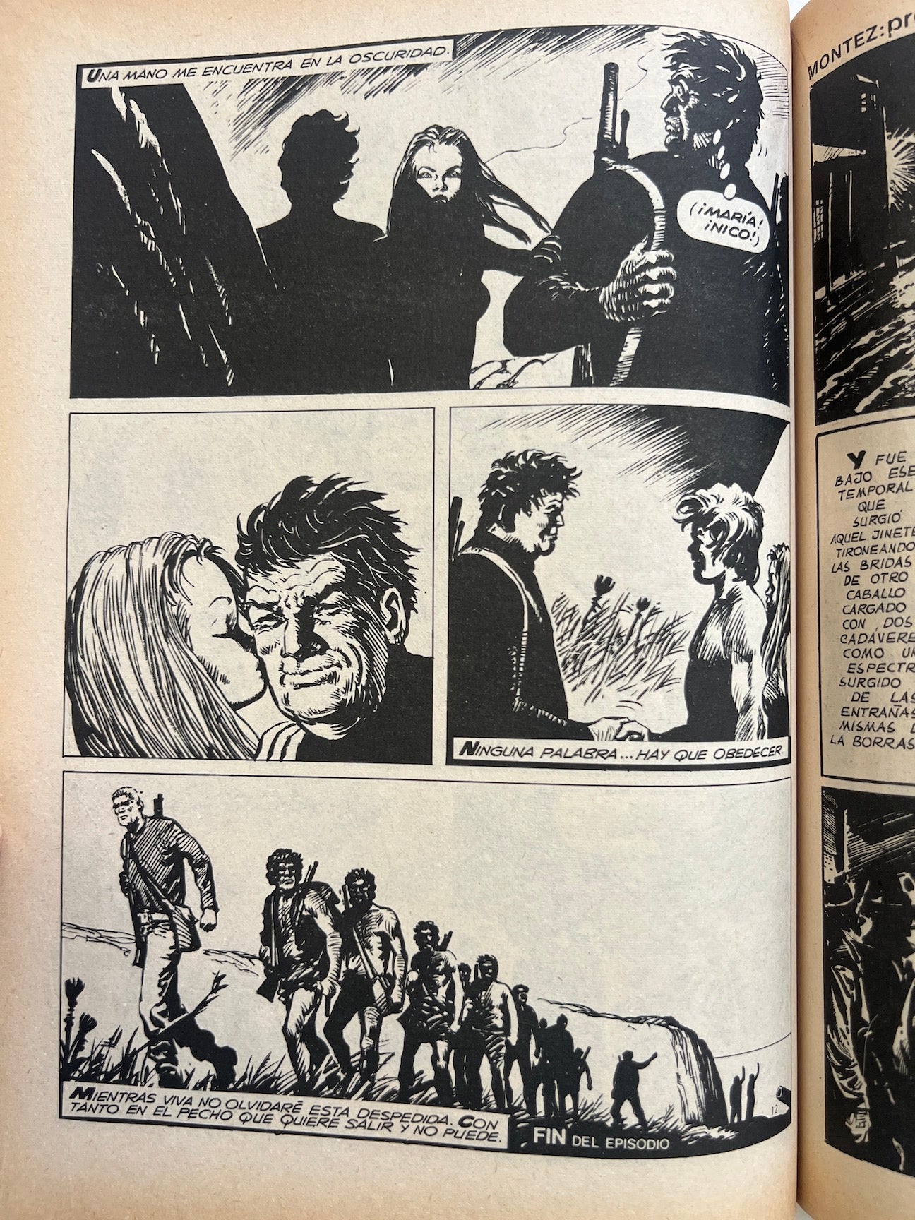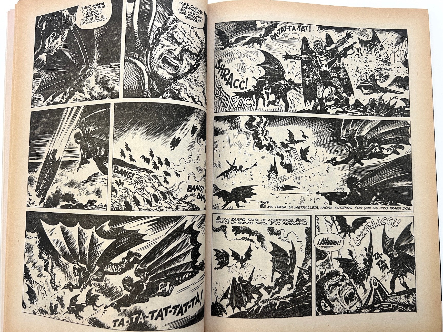 The complete first edition is composed of: 17 “episodios”, each 12 pp., published in 17 consecutive vols. of Skorpio. Beginning with Libro de Oro de Skorpio No. 2 (Dec. 1976), followed by Skorpio Nos. 27-36, Libro de Oro de Skorpio No. 3 (November 1977), and concluding with Skorpio Nos. 37-41 (Dec. 1977-April 1978). Each vol. near 26.5 cm, total page length of each monthly issue varies widely. Nine of the 17 issues in expected used condition: papers toned, wrappers rubbed with signs of use, minor chipping, bumped spines, etc. The other eight issues are more worn, five with separated wrappers, a few bent corners or small losses to covers, no. 33 missing spine, Libro de Oro 2 and no. 28 spine reinforced with tape. No. 32 with damage to the lower fore edge of first two leaves, not affecting story panels.