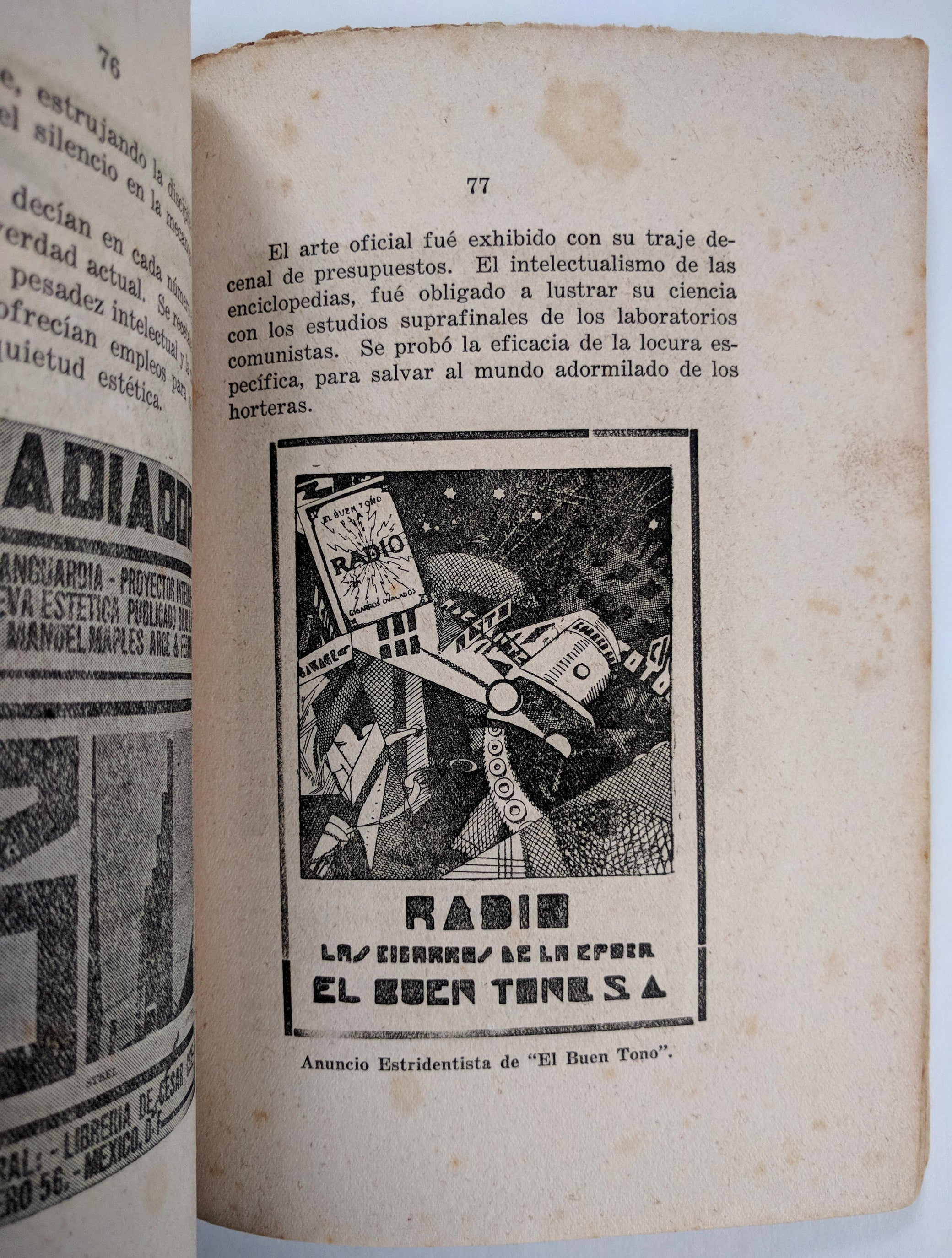 List Arzubide, Germán. El Movimento Estridentista. Xalapa, Veracruz; Mexico: Ediciones de Horizonte, [19261927]. First edition. 8vo, 106 pp.; profusely illus., a few in color, incl. 2 color pls., tipped in; missing orig. wrappers, half-title with small loss at top-edge, first and last pages heavily foxed.