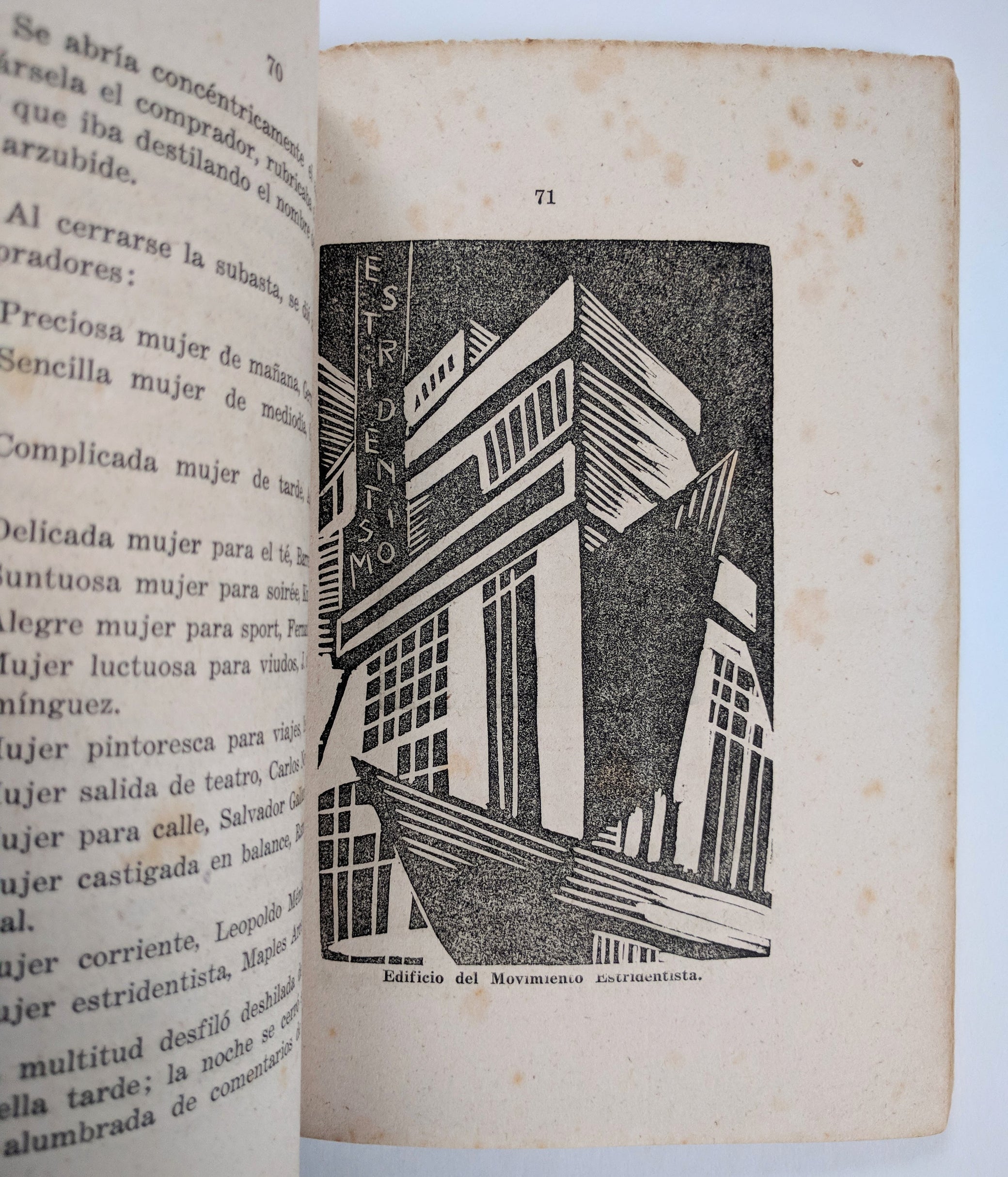A reading copy of this important illustrated chronicle of Estridentista, the avantgarde Mexican arts movement. Even without wraps, Arzubide's history is a beautifully realized book. Scores of vibrant illustrations are accompanied by descriptions of Estridentista founder, Manuel Maples Arce, the movement's headquarters at El Café de Nadie in Mexico City, and its aesthetic principles. As described by the International Center for the Arts of the Americas, “a good number of the illustrations [...] are unique, given the loss of a large portion of the works by the painters and engravers associated with the group, especially oil paintings.”