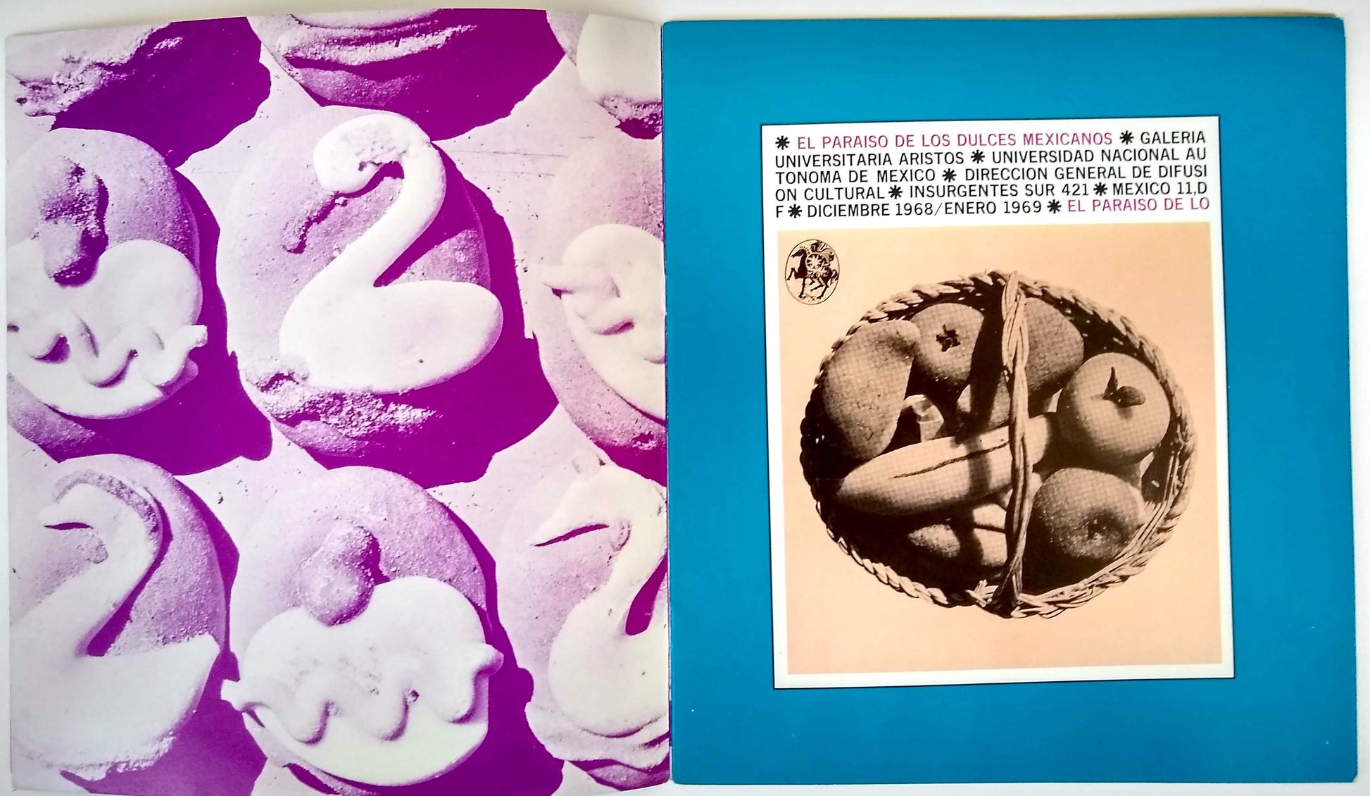 Galeria Universitaria Aristos. El Paraíso de los Dulces Mexicanos. México, D.F.: Universidad Nacional Autónoma de México, n.d. [1968]. Square 8vo, [16] pp.; primarily visual, some reproductions in color, with [2] pp. wove paper insert. Stapled color pictorial wraps, extremities worn. Exh. cat. exploring the sculptural artistry of Mexican confectionaries. Surrealist and Pop overtones. With text and images by artists associated with UNAM in the late 1960s including Olga Costa and Victor Fosado. OCLC finds one US holding: UCSD. SOLD