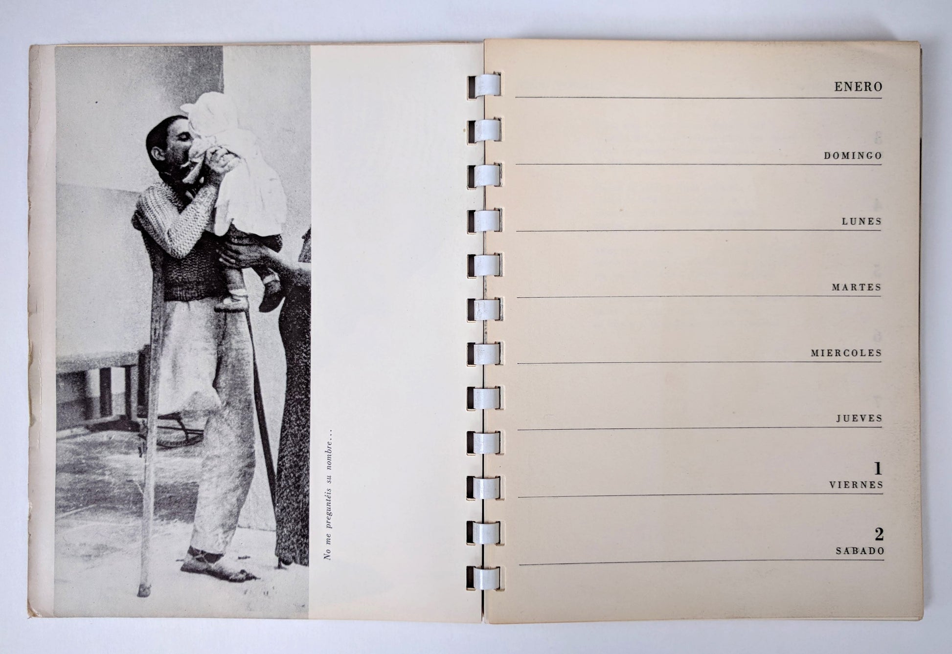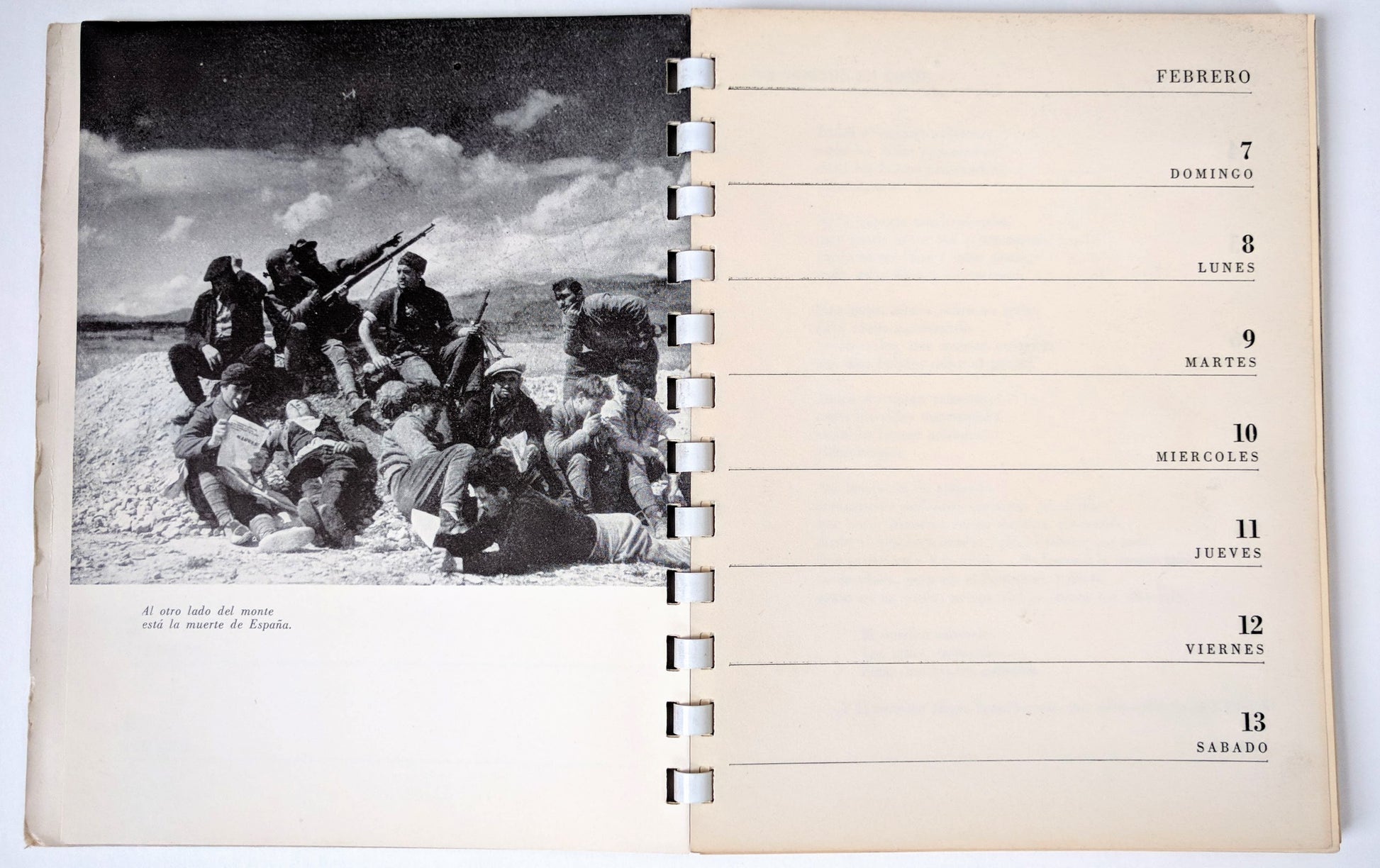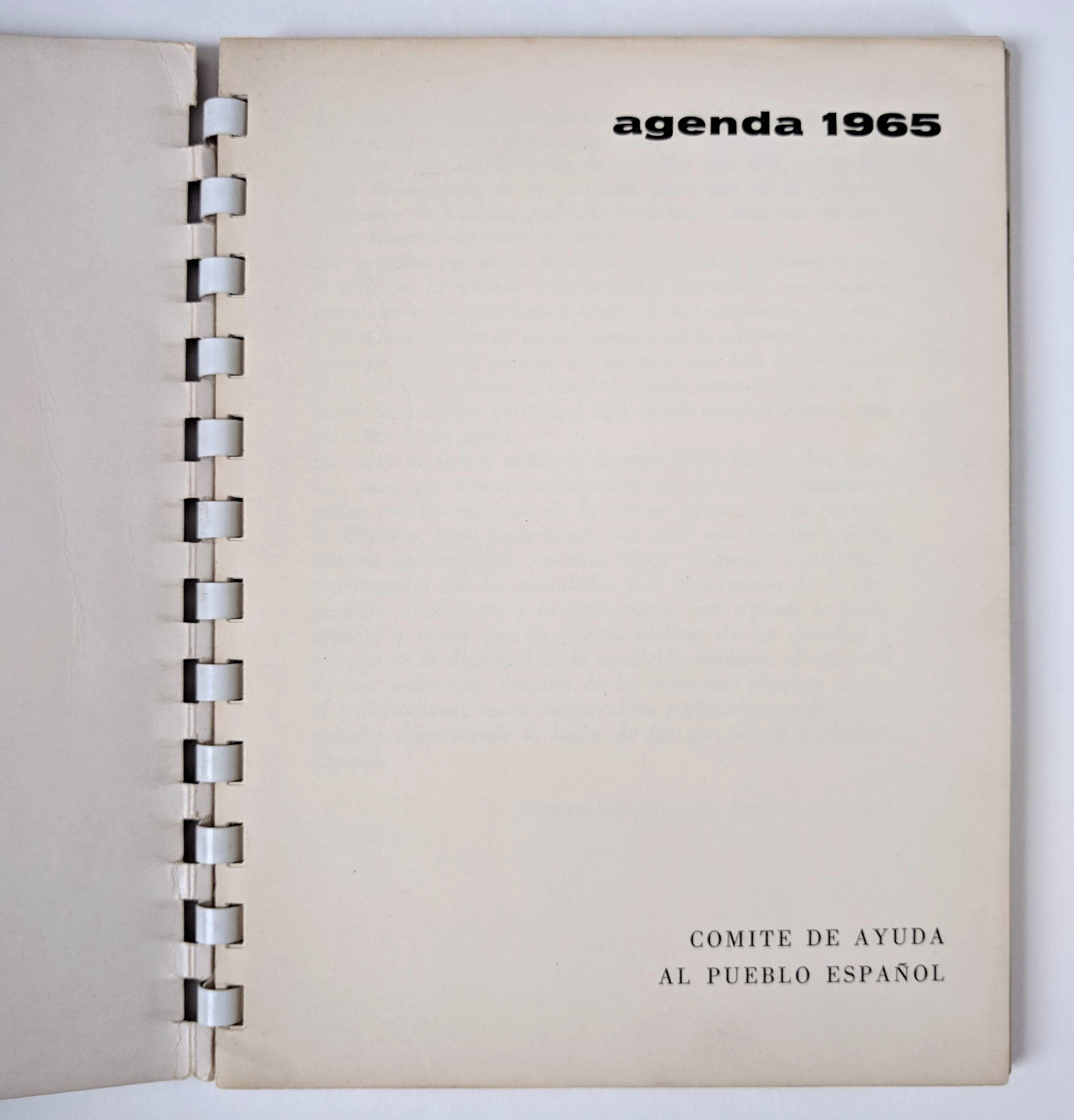 [Horna, Kati] Comite de Ayuda al Pueblo Español. España 1936-1965. [Mexico]: [1964]. Small 8vo, 7-⅜ x 5-⅝ in., [94] pp.; illus. daily agenda and poems, with 7 bw pls., printed recto and verso, incl. 10 reproductions of photographs by Horna; final page reproduces pinback worn by the Abraham Lincoln Brigade during a protest against the Spanish Pavilion at the World's Fair, 1964; in plastic comb binding with glossy pictorial wrappers by Horna, worn at binding and fore-edges, with creases; interior very good. Thirty years after the end of the Guerra Civil, exiled Republicans and sympathizers continued to agitate in Latin America and Europe for an end to the Franco regime. This agenda calls for daily solidarity with “the sacrifices and suffering” of the heroic Spanish people still fighting against “Nazi-fascism,” particularly political prisoners and their families. The calendar includes radical Spanish and Latin American poetry, including work by Garcia Lorca, Machado, Neruda, Rejano, et al., and is illustrated with wartime photos by Hungarian-born Mexican photojournalist Kati Horna (1912-2000). Horna worked for a number of anarchist magazines in Madrid before she was hired in 1937 by the Republican government to document the war. After two years in Spain she was forced to flee to Paris and then Mexico where her negatives remained largely unseen until the fall of Franco in 1979. Since that time her unusual subject matter and passionate representation of ordinary lives in communities far from the frontlines (e.g. women and children, wounded soldiers at home) have re-established her reputation alongside her lifelong friend, Robert Capa. She lived in Mexico for the rest of her life, where she contributed to a number of anarchist publications and became a key member of a group of expat artists, including Remedios Varo and Leonora Carrington. Only recently rediscovered, Horna's published work before 1979 is scarce. The first major publication of her Spanish Civil War-era work was in 1992, almost thirty years after this calendar appeared. Unrecorded in OCLC. HOLD
