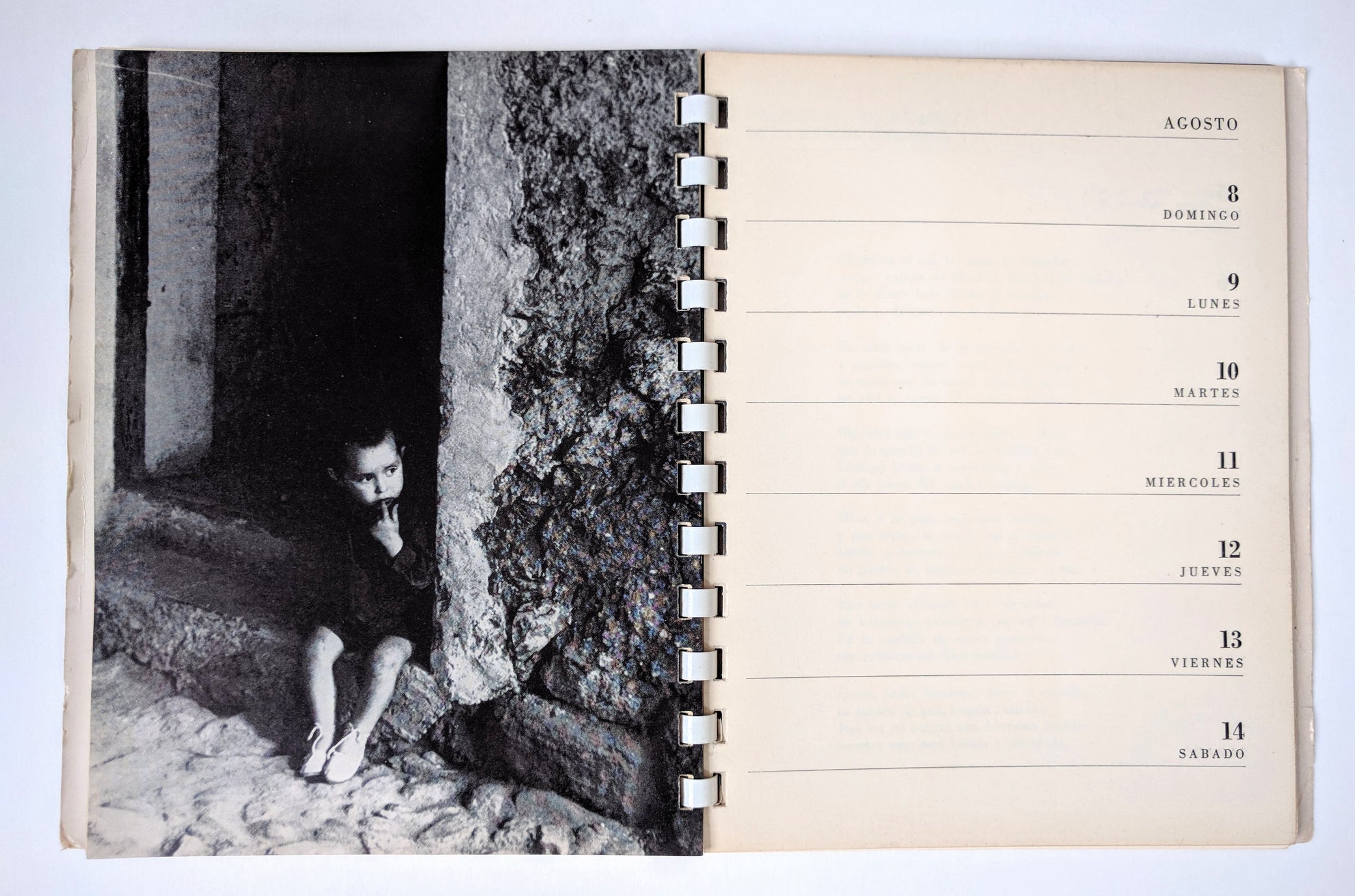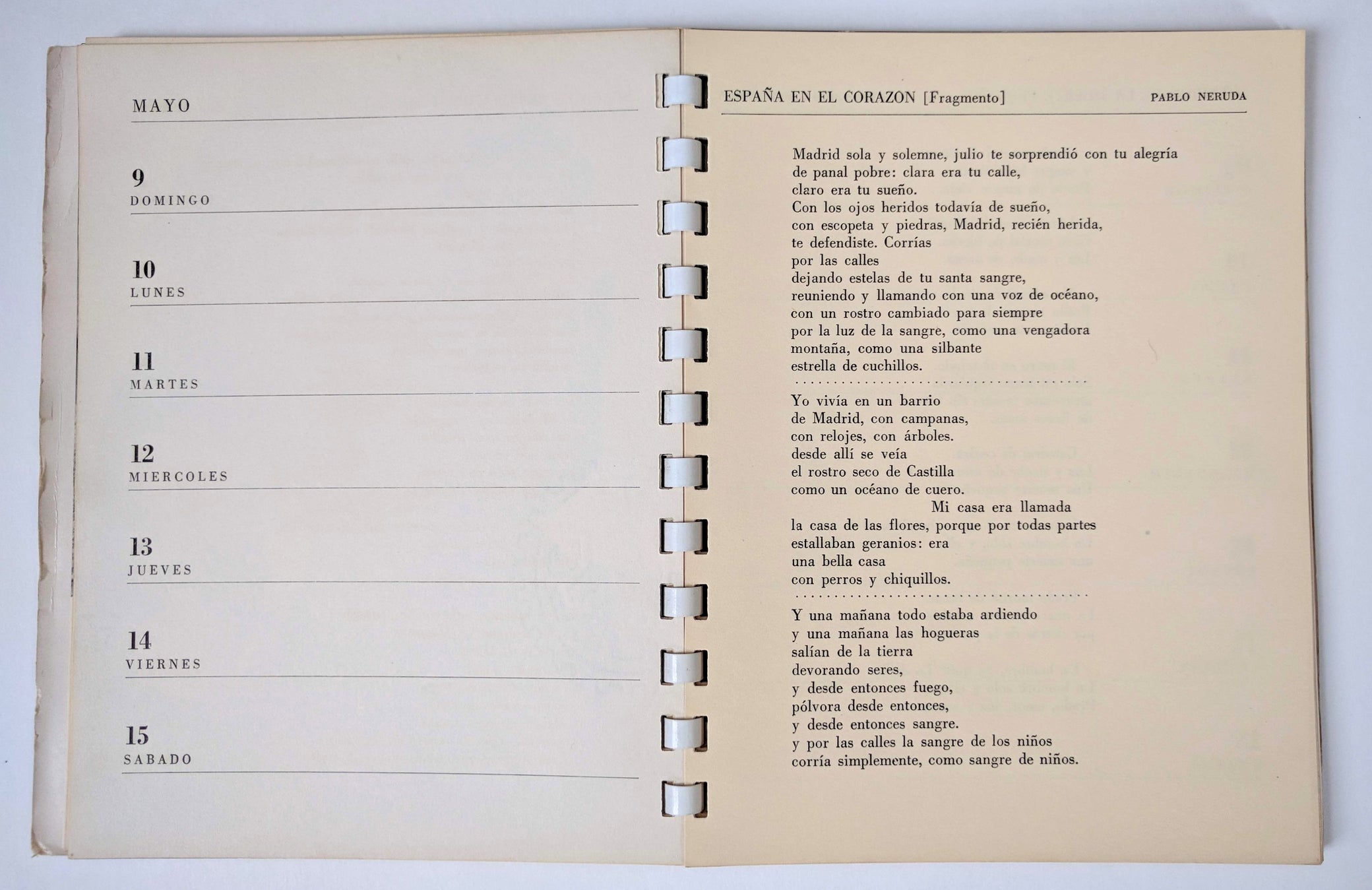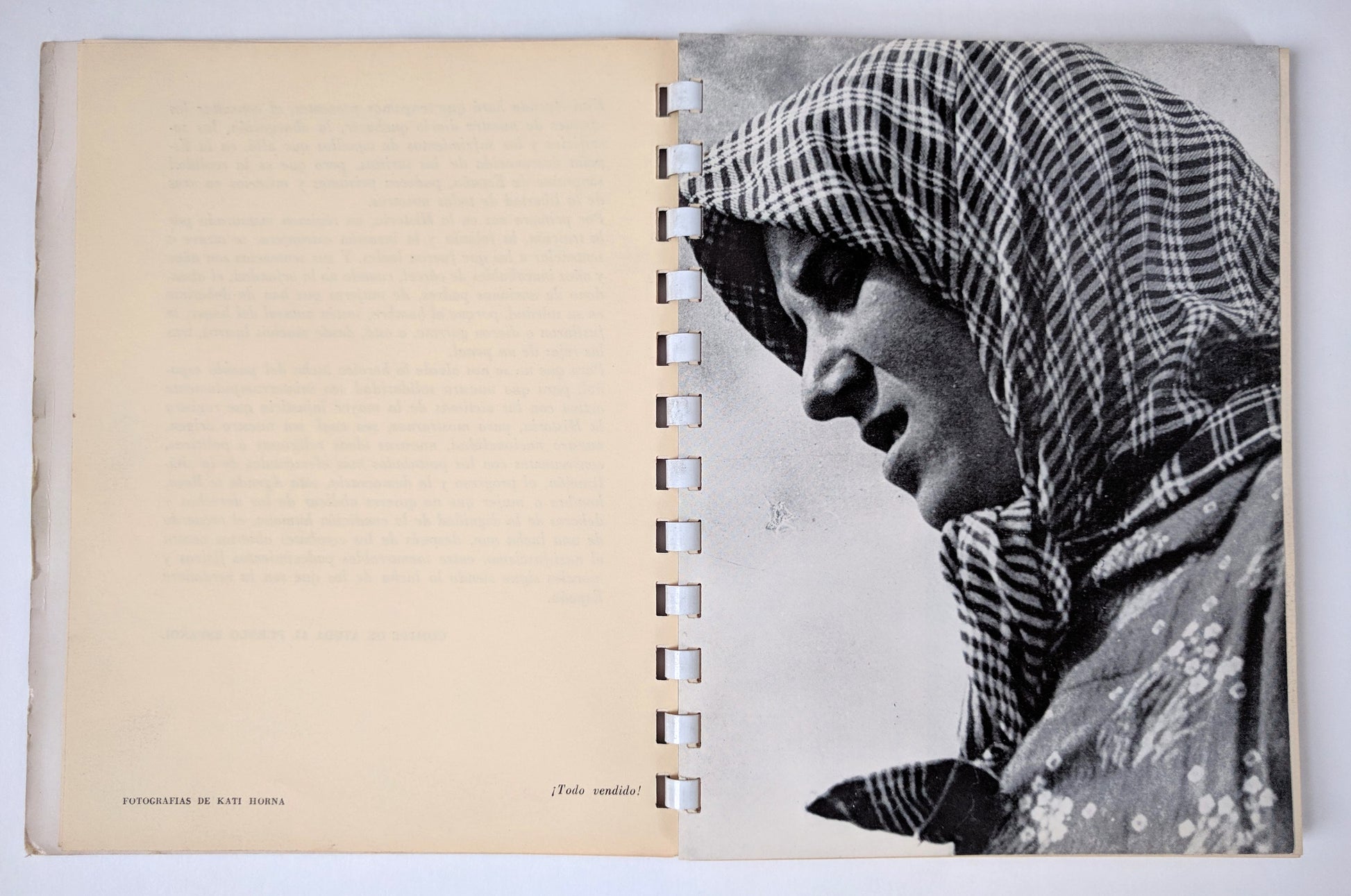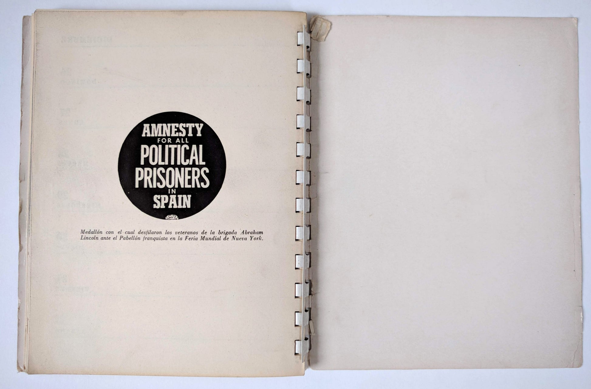 [Horna, Kati] Comite de Ayuda al Pueblo Español. España 1936-1965. [Mexico]: [1964]. Small 8vo, 7-⅜ x 5-⅝ in., [94] pp.; illus. daily agenda and poems, with 7 bw pls., printed recto and verso, incl. 10 reproductions of photographs by Horna; final page reproduces pinback worn by the Abraham Lincoln Brigade during a protest against the Spanish Pavilion at the World's Fair, 1964; in plastic comb binding with glossy pictorial wrappers by Horna, worn at binding and fore-edges, with creases; interior very good. Thirty years after the end of the Guerra Civil, exiled Republicans and sympathizers continued to agitate in Latin America and Europe for an end to the Franco regime. This agenda calls for daily solidarity with “the sacrifices and suffering” of the heroic Spanish people still fighting against “Nazi-fascism,” particularly political prisoners and their families. The calendar includes radical Spanish and Latin American poetry, including work by Garcia Lorca, Machado, Neruda, Rejano, et al., and is illustrated with wartime photos by Hungarian-born Mexican photojournalist Kati Horna (1912-2000). Horna worked for a number of anarchist magazines in Madrid before she was hired in 1937 by the Republican government to document the war. After two years in Spain she was forced to flee to Paris and then Mexico where her negatives remained largely unseen until the fall of Franco in 1979. Since that time her unusual subject matter and passionate representation of ordinary lives in communities far from the frontlines (e.g. women and children, wounded soldiers at home) have re-established her reputation alongside her lifelong friend, Robert Capa. She lived in Mexico for the rest of her life, where she contributed to a number of anarchist publications and became a key member of a group of expat artists, including Remedios Varo and Leonora Carrington. Only recently rediscovered, Horna's published work before 1979 is scarce. The first major publication of her Spanish Civil War-era work was in 1992, almost thirty years after this calendar appeared. Unrecorded in OCLC. HOLD