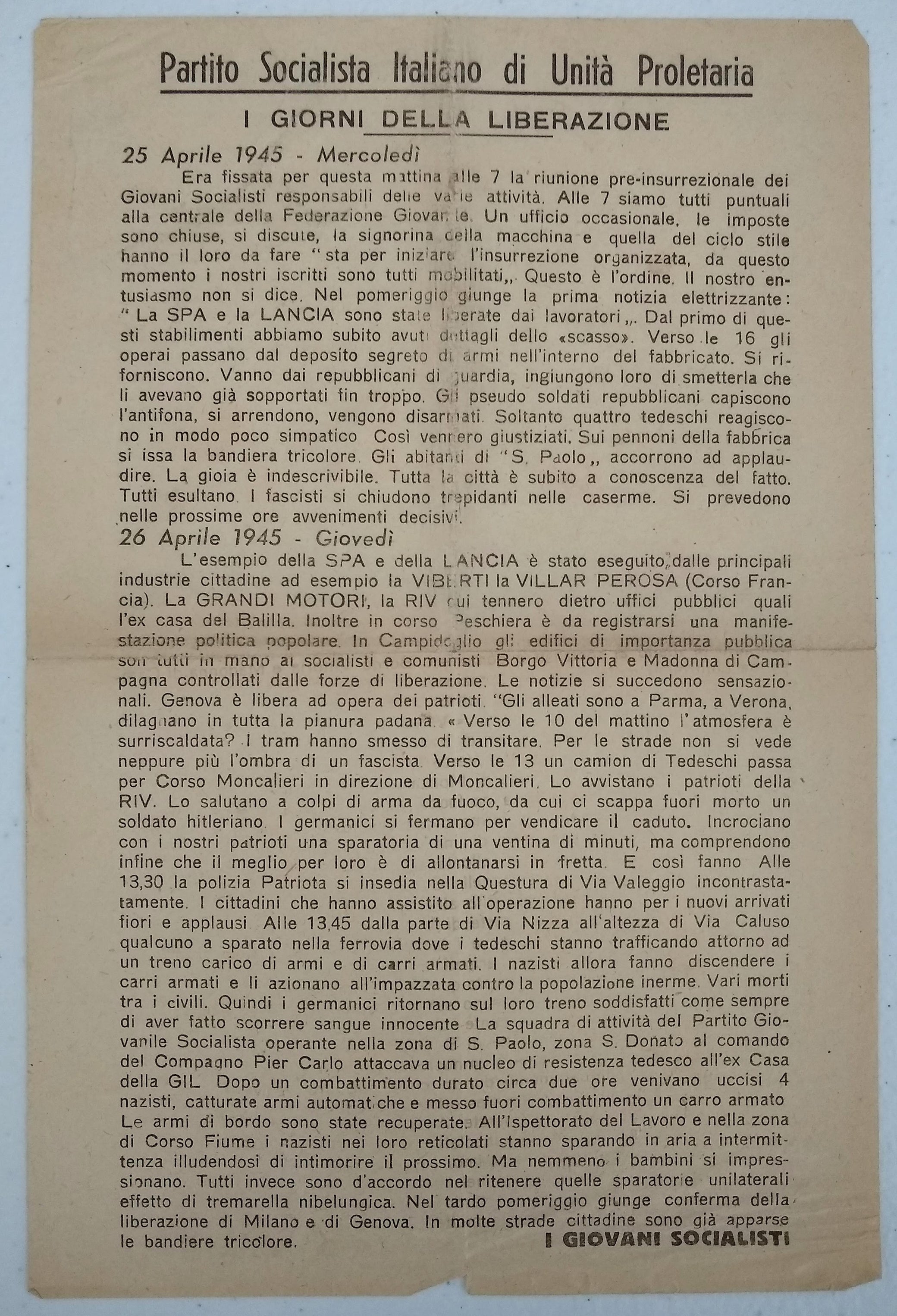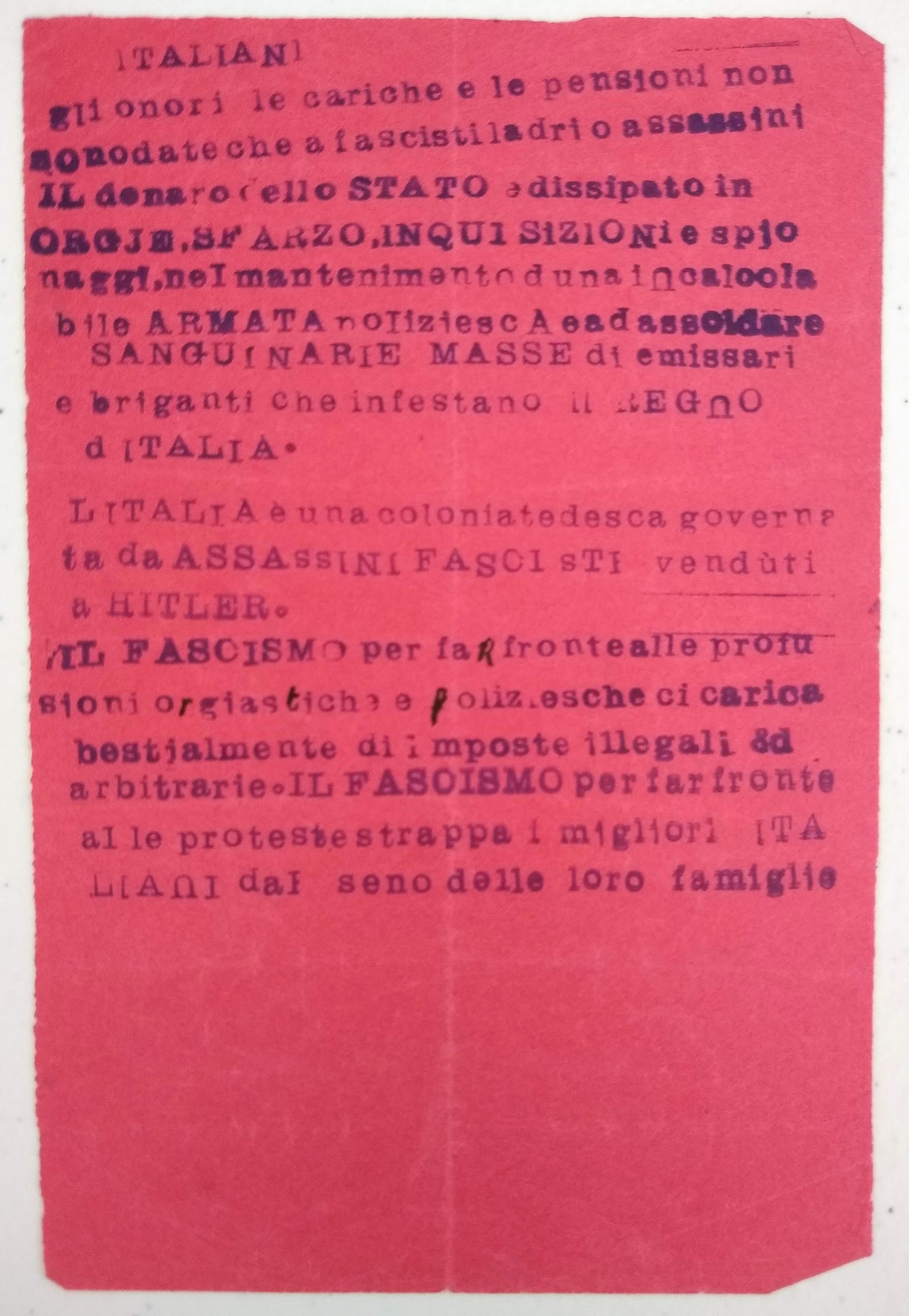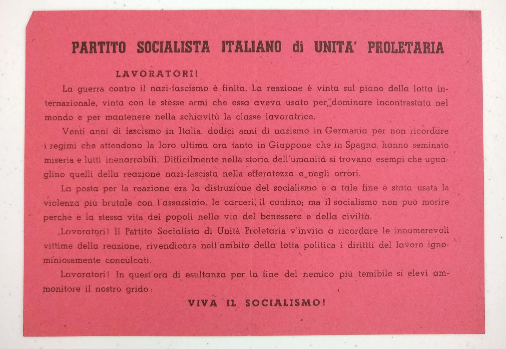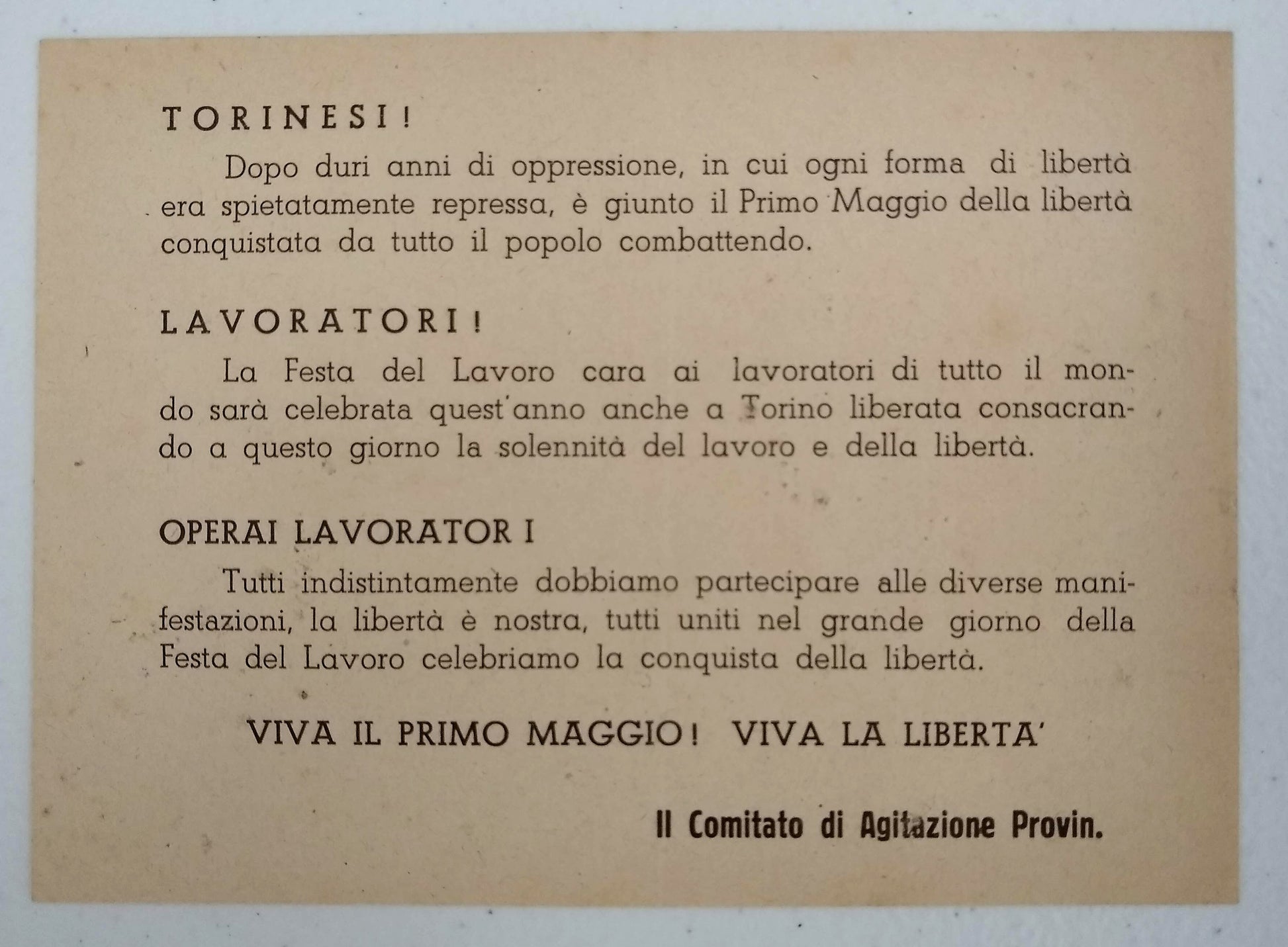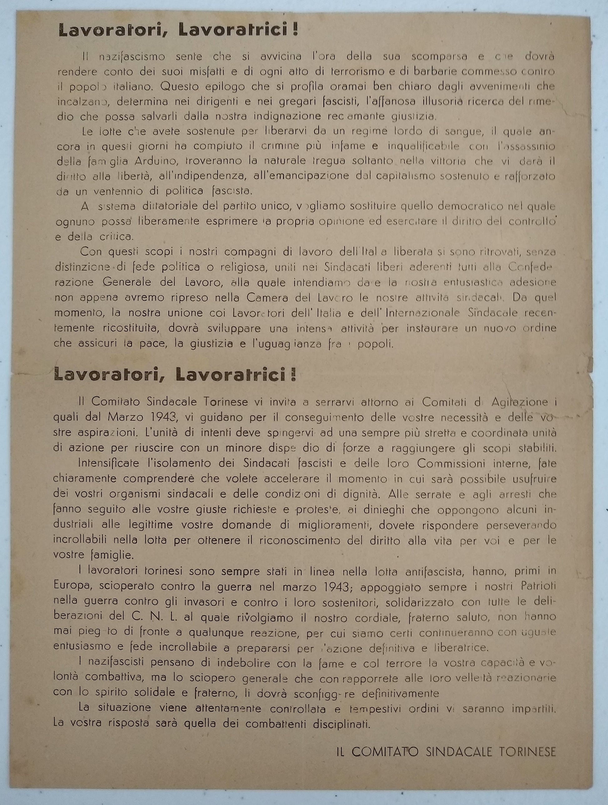 “Lavoratori Torinesi! L'ora dell'insurrezione popolare contro il nazifascismo e giunta ... Lo sciopero insurrezionale ad oltranza apra la via alla nostra liberazione! Viva il Socialismo!” (Antifascism) (Socialism) Fourteen Italian Antifascist, Communist, and Revolutionary Socialist Party Leaflets, 1943-1945. Various sizes, most single-sided, four recto and verso, two on red papers, most good, with scattered fraying, creases, small chips, bent corners, and toning, one closed tear, one example much larger, creased with losses. Together with: Fronte Del Lavoro: Per un'Italia nuova del lavoratori. [3] pp. mimeograph party manifesto, dated September 2, 1943, sl. faded with small pencil annotations, possibly corrections; Lo Stato Moderno: Rivista di critica, politica, economica, e sociale. Anno 1, N. 1 (Luglio 1944). [Rome]: 1944. 8vo, 16 pp.; newsprint darkened; stapled wrapper, front with small stain and closed tear; and 3) Foglio Volante: Portato dalle Forze Aeree delle Nazioni Unite. No. 6. Np. Nd. ca. 1943. Single sheet of a French? Resistance aerial leaflet with solidarity messages for Italian workers from leaders of the trade union movement in France and Britain. Leaflets calling for working-class action against Nazi-fascism in the German-occupied Italian Social Republic from communist, socialist, and revolutionary parties belonging to the National Liberation Committee coalition or the armed resistance movement: Partito Socialista Italiano di Unità Proletaria, Partito d'Azione, Il Fronte della Gioventù (part of the Italian Communist Party [PCI]), Fronte degli Intellettuali (PCI?), and Partito Repubblicano Italiano. With the exception of Foglio Volante and Lo Stato, most of these examples were presumably published clandestinely in Turin and environs. At least two published in the days following liberation, either celebrating the first postwar Labor Day (May 1) or insisting on a new democratic Italian republic to represent the working class. No OCLC holdings found. A few similar leaflets in the Library of Congress holdings. Foglio Volante held only at the BNF. SOLD