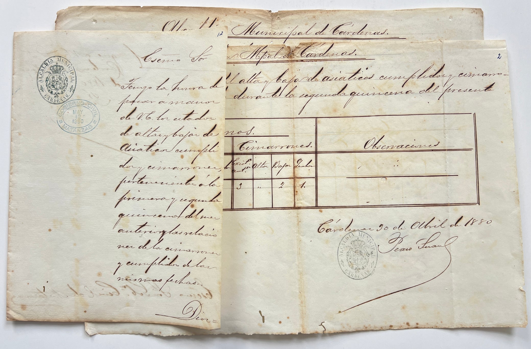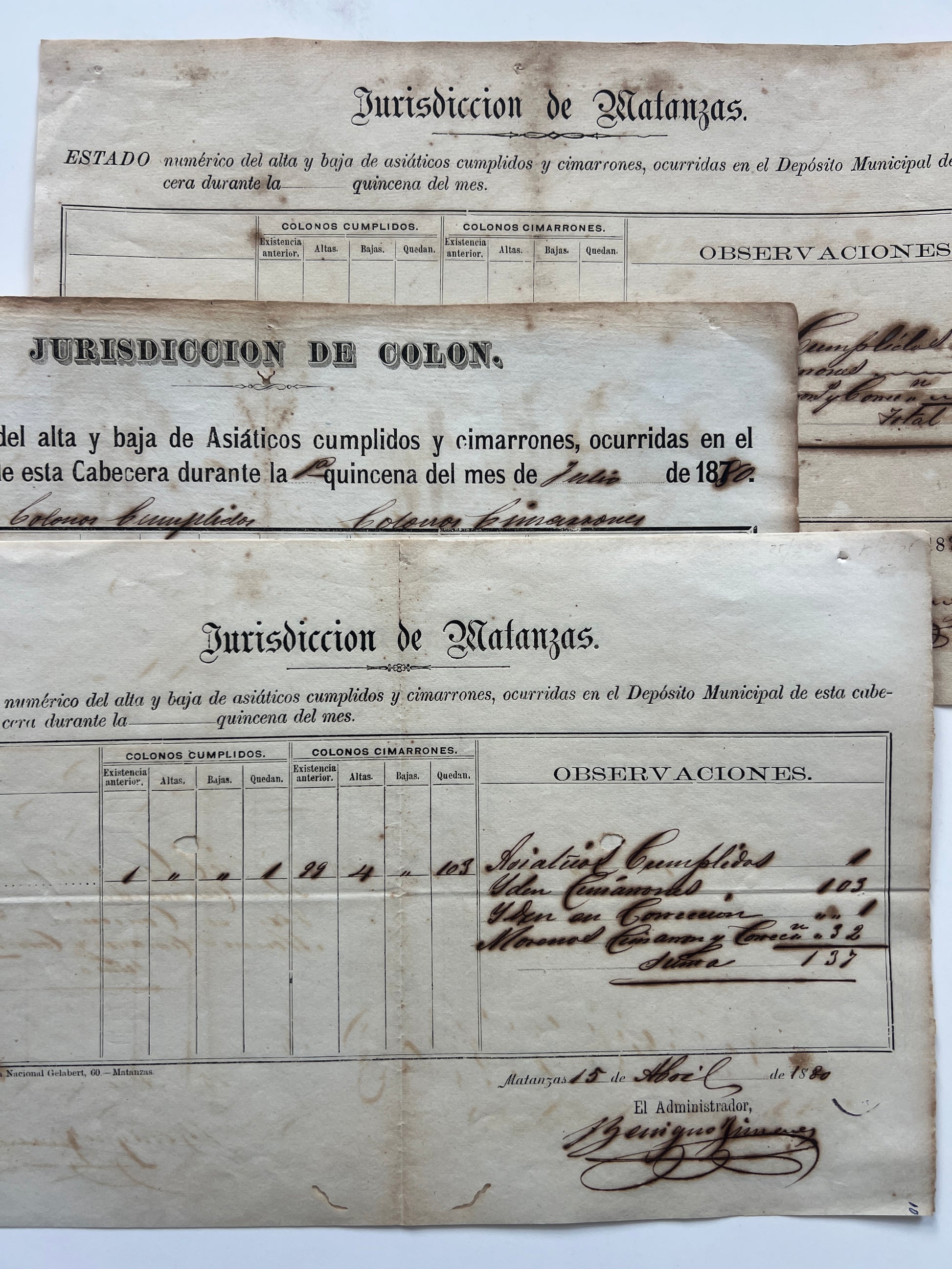 Seven single leaf oblong registers, each near 20 x 30 cm, partially printed and filled in manuscript, listing the addition or subtraction of Chinese workers from various municipal deposits (jails), based on whether they are “cumplidos” or “cimarrones”. Two from Colon, dated June and April of 1880; three from Matanzas, dated June and April of 1880, two attached to one another margin with tiny tapes; and two from Cardenas, April 1880, these accompanied by a manuscript letter, single leaf, from an official in Cardenas to a senior official in Matanzas. All a bit foxed or toned, some wormholes, one leaf from Cardenas with a 2 cm loss.