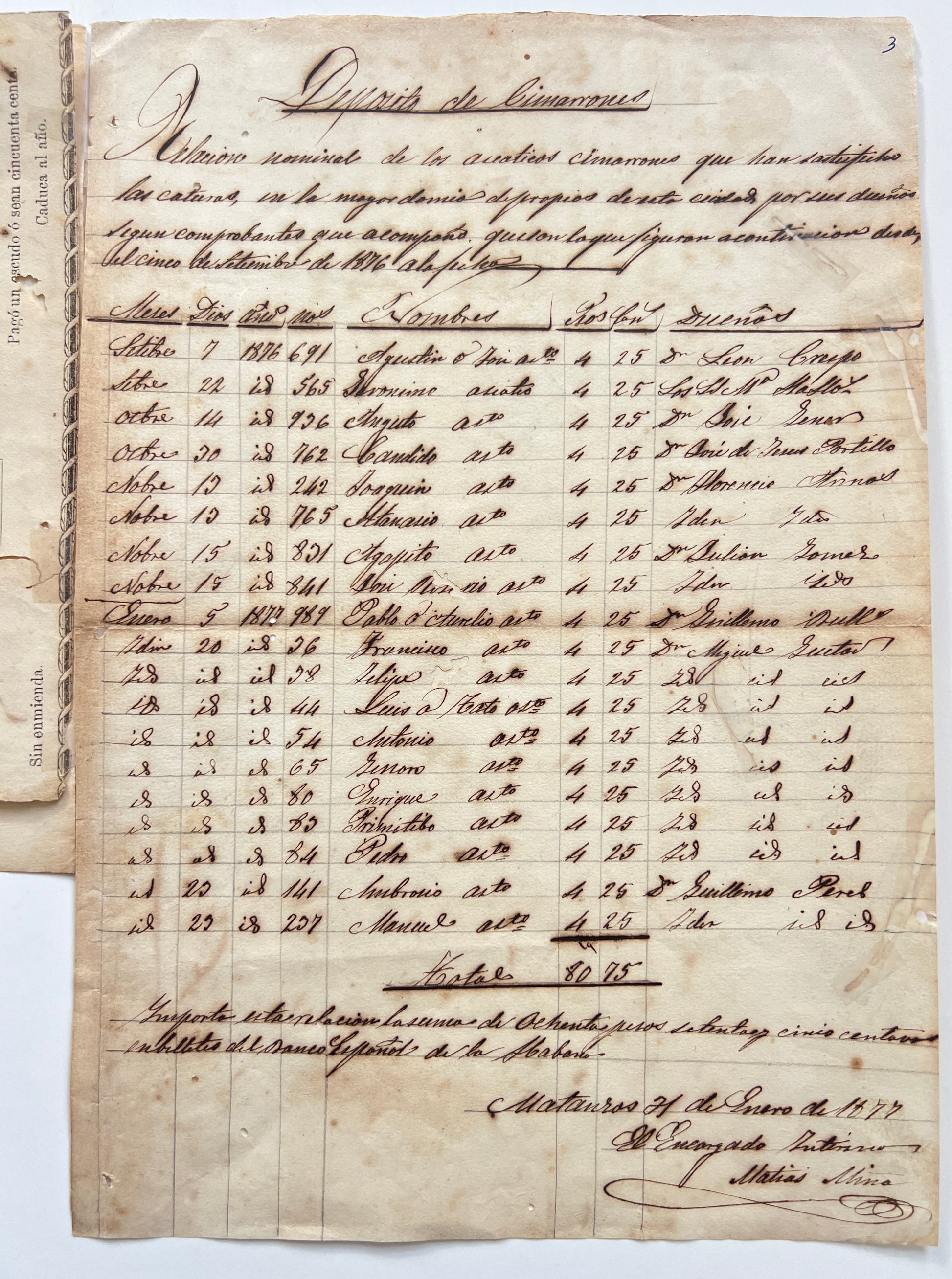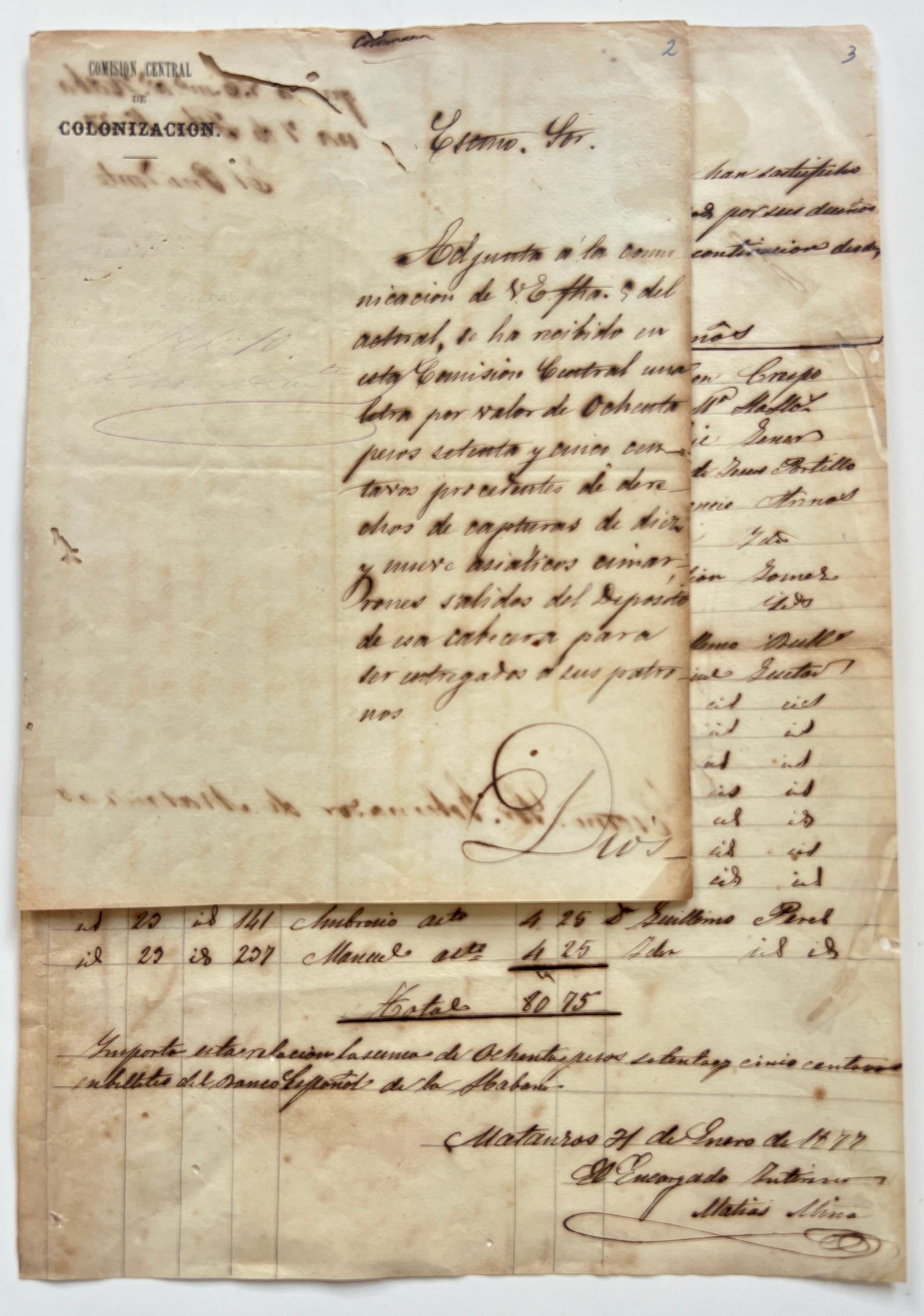 Two manuscript letters and an invoice. Letters from Comision Central de Colonizacion to the Governor of Matanzas (February 1877), accompanying a manuscript invoice (January 21, 1877), for the capture and return of 19 Chinese runaways. Letters: two leaves, 21.5x16.5 cm, one written on recto of the paper scrap of a cedula application. Invoice, 30.5 x 21.5 cm. Toned, some worm holes, a few small additions of tape verso.