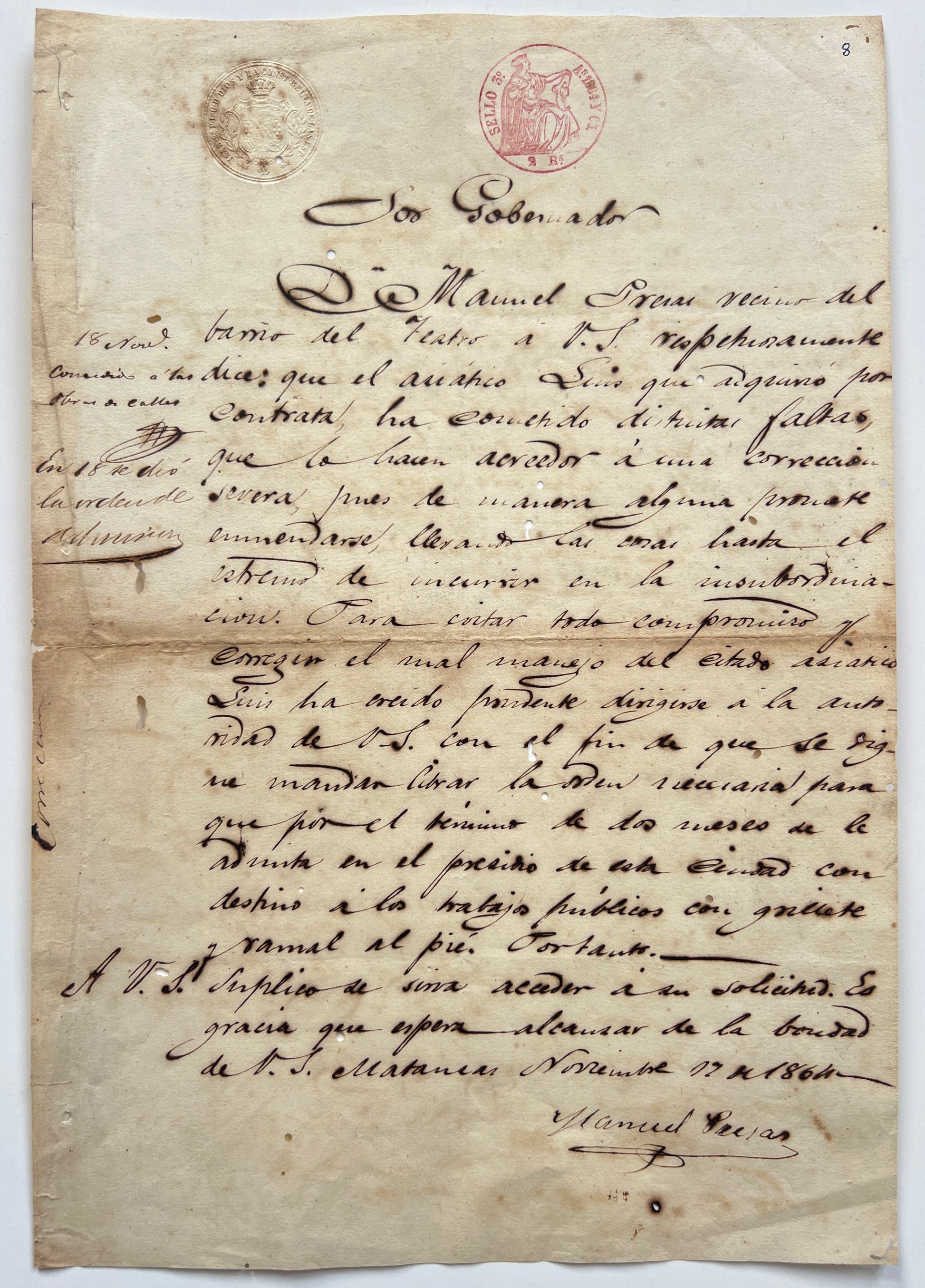 Single leaf manuscript letter from D. Manuel Presas to the local governor seeking correction for the colono Lino. November 17, 1864. 31. 5 x 21. 5 cm. Some wormholes, not affecting legibility. Blind and ink stamped. Creased where folded.