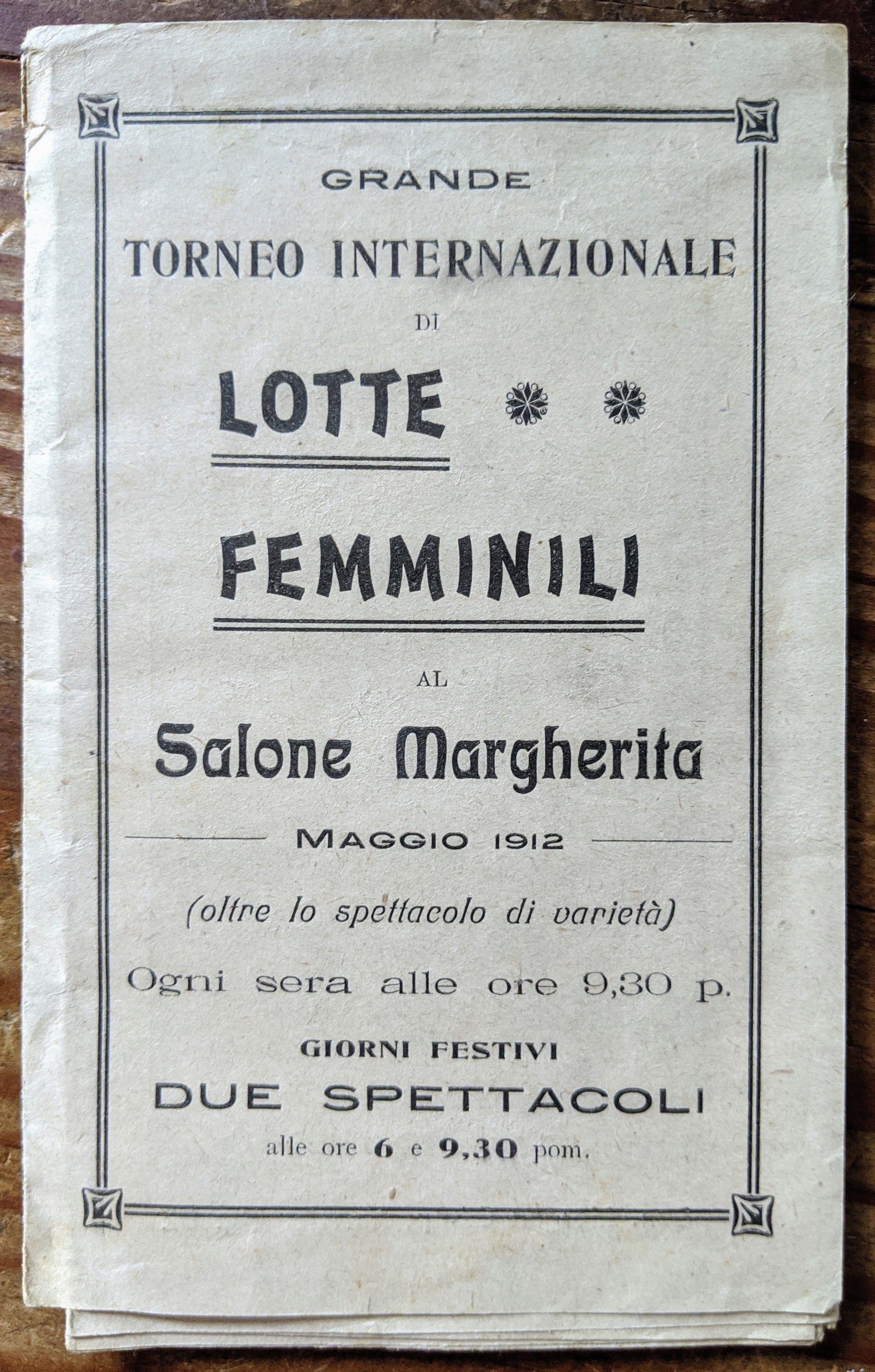 Grand Torneo Internazionale di Lotte Feminili al Salone Margherita. Rome, 1912. Concertina booklet, closed: 5-½ x 3-⅜ in., illus. with ten portraits of the fighters, from England, Europe, Russia, and the US; some usual wear, esp. at folds.
