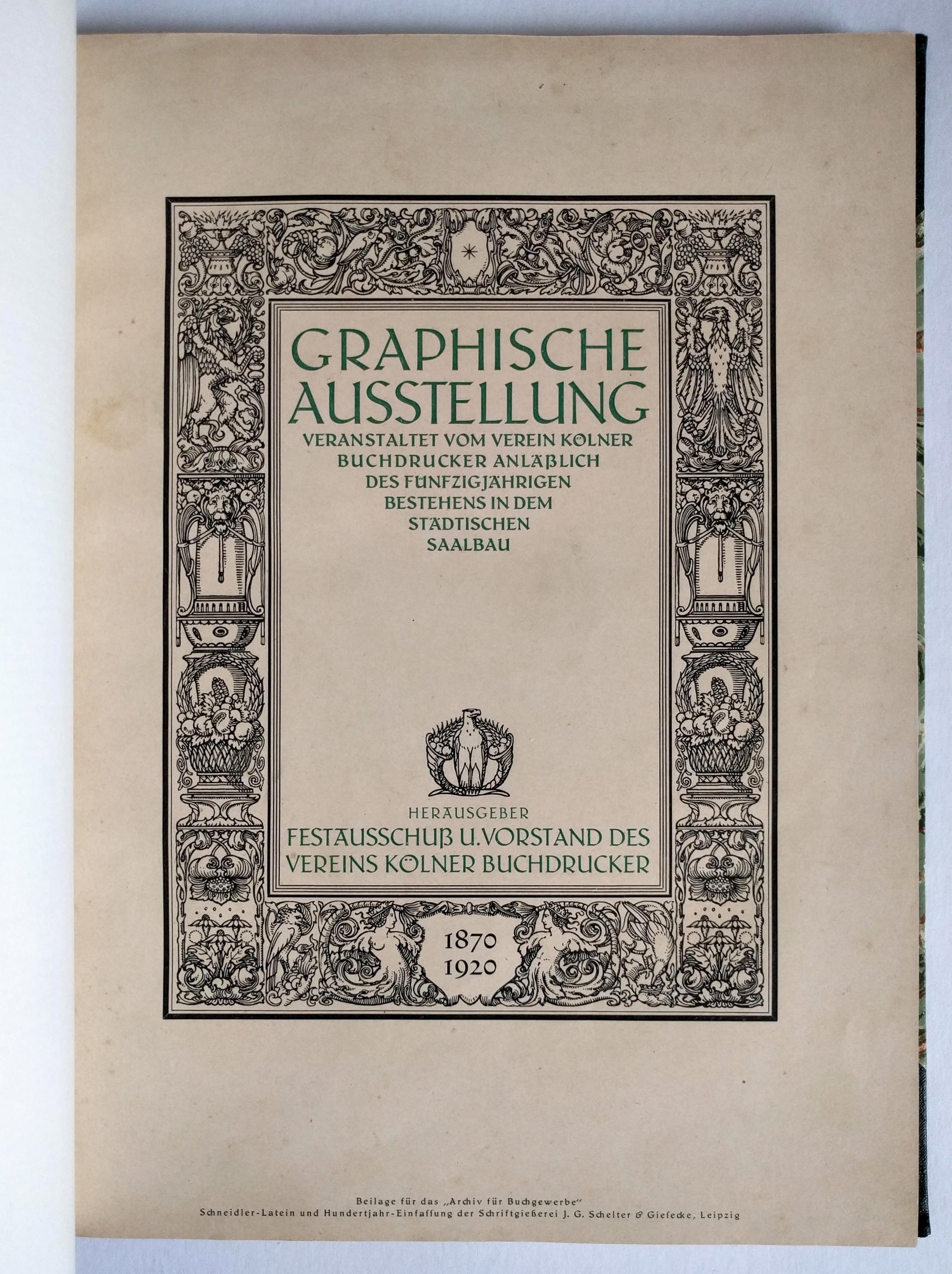 [Archiv für Buchgewerbe und Gebrauchsgraphik]. Graphische Ausstellung veranstaltet vom Verein Kölner Buchdrucker Anläßlich des fünfzigjährigen Bestehens in dem Städtischen Saalbau. Leipzig: [Festausschuß und Vorstand des Vereins Kölner Buchdrucker], 1920.