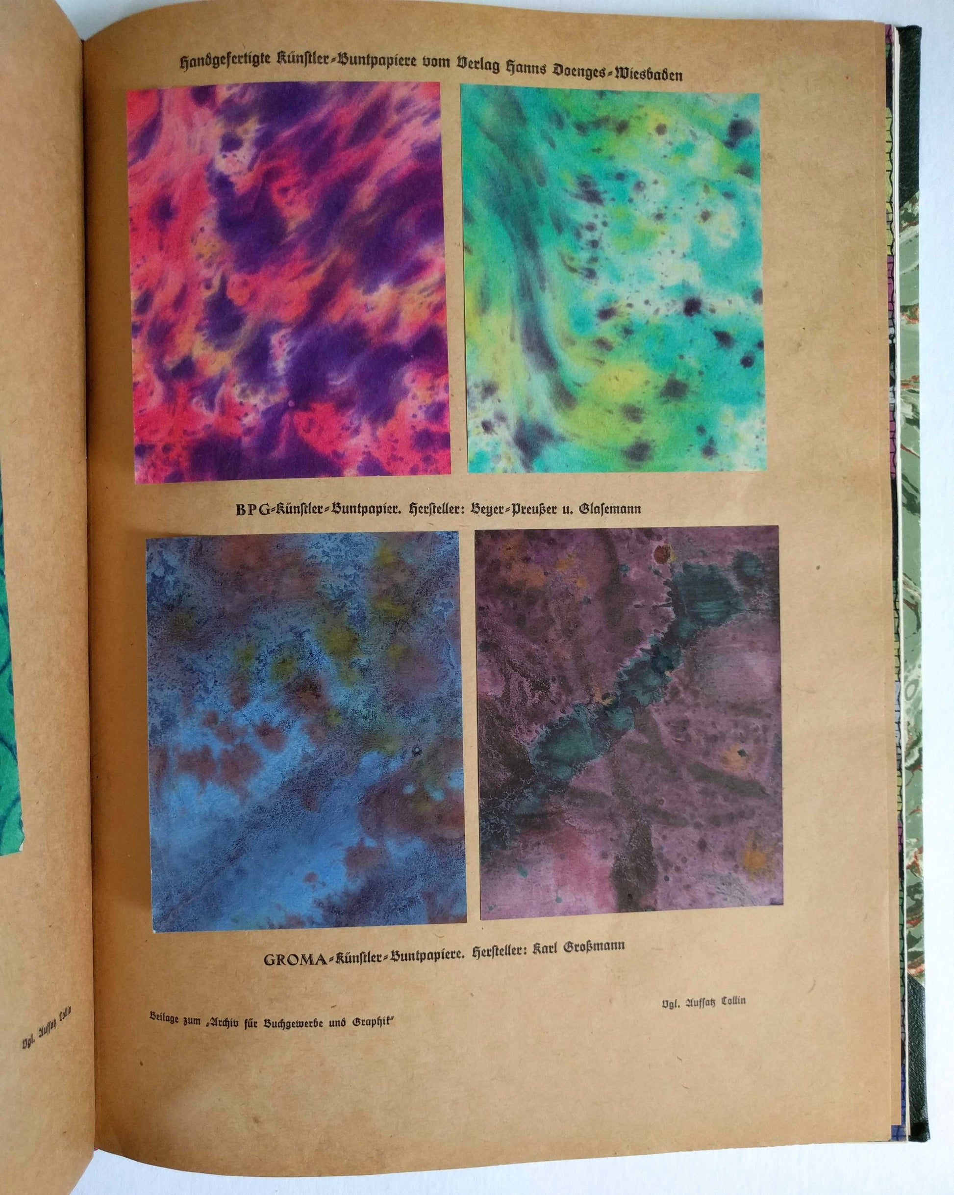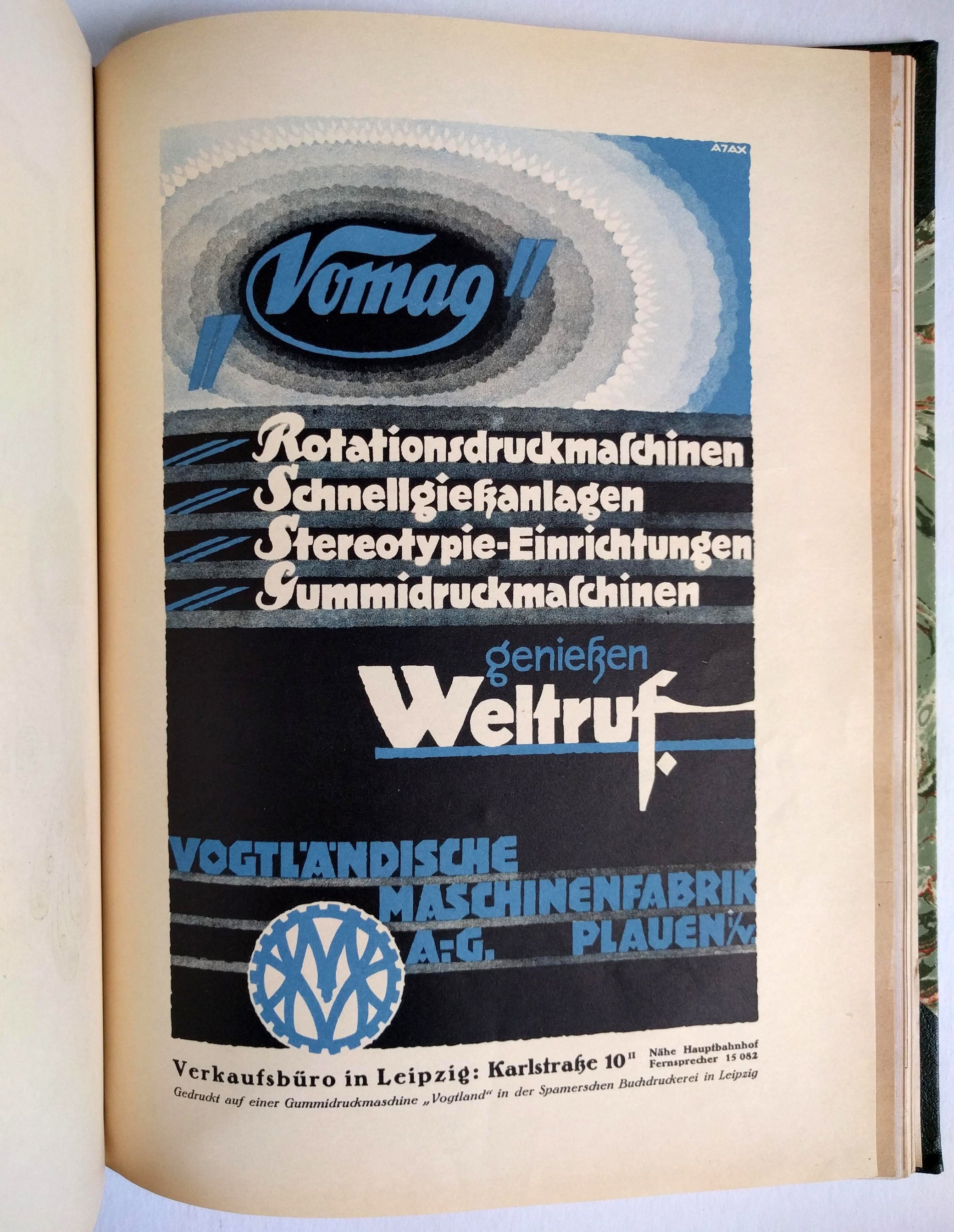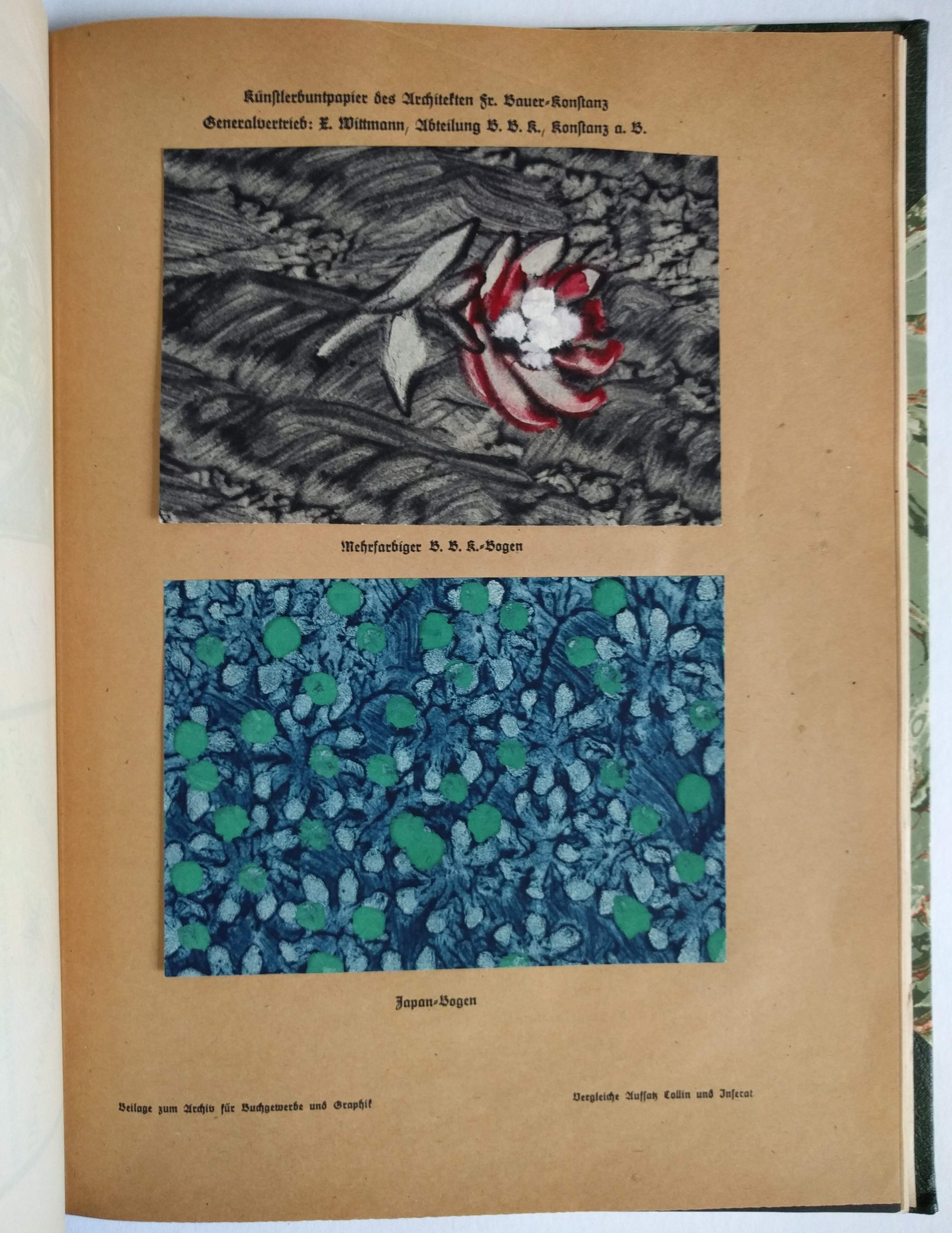 4to, [73] leaves; profusely illustrated publicity catalogue for German graphic arts businesses featuring samples and advertisements for printers, lithographers, engravers, binders, papermakers, graphic designers, etc., most leaves either plates or with tipped-in color plates or samples, some leaves printed recto and verso, a few elaborate handmade artist’s paper samples, one leaf with closed tear at f.e., one newsprint leaf with small chip, else very good; green three-quarter calf with marbled boards, gilt title to spine, lightly worn.
