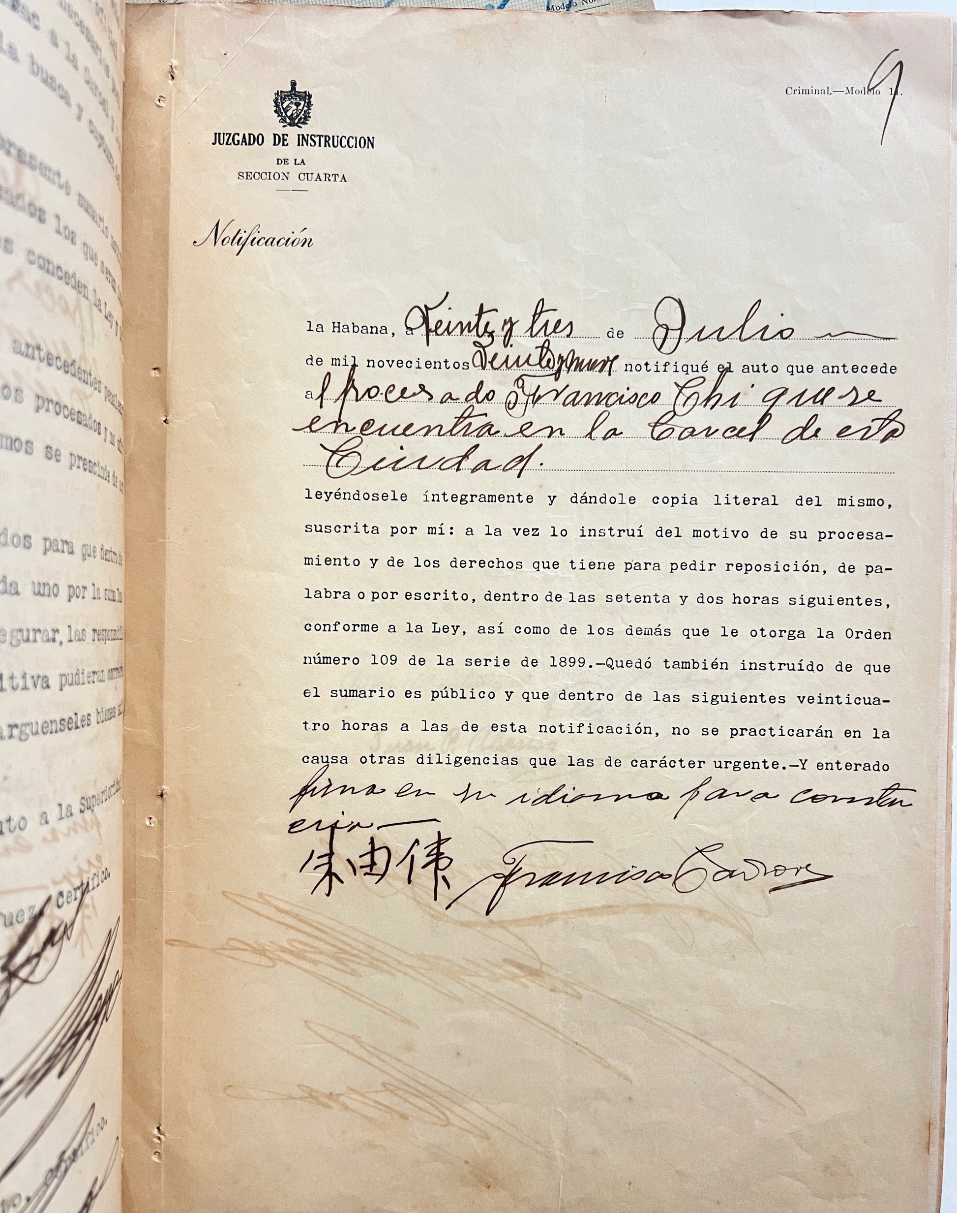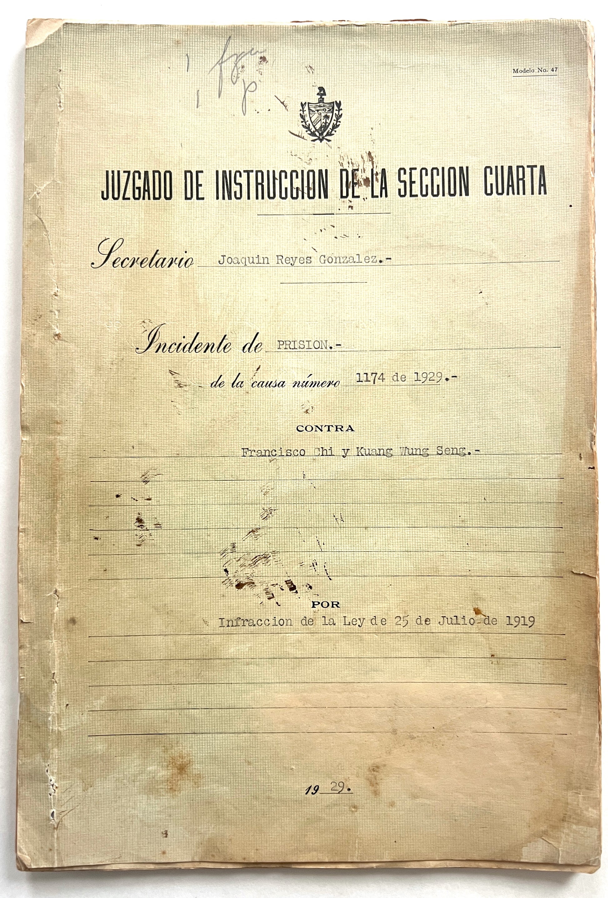 Prison, Release, and Disappearance: A printed paper folder, 31.5 x 21 cm, “Incidente de Prison,” 32 leaves, leaves 1-21 numbered. A few of the documents are printed legal forms completed in typescript or manuscript, others are letters or testimony in typescript or manuscript. Many written on Carcel de la Habana stationary, some from the Departamento de Vivac. A few with the Chinese signature of Chi and possibly El Viejo. Toned and edgeworn.