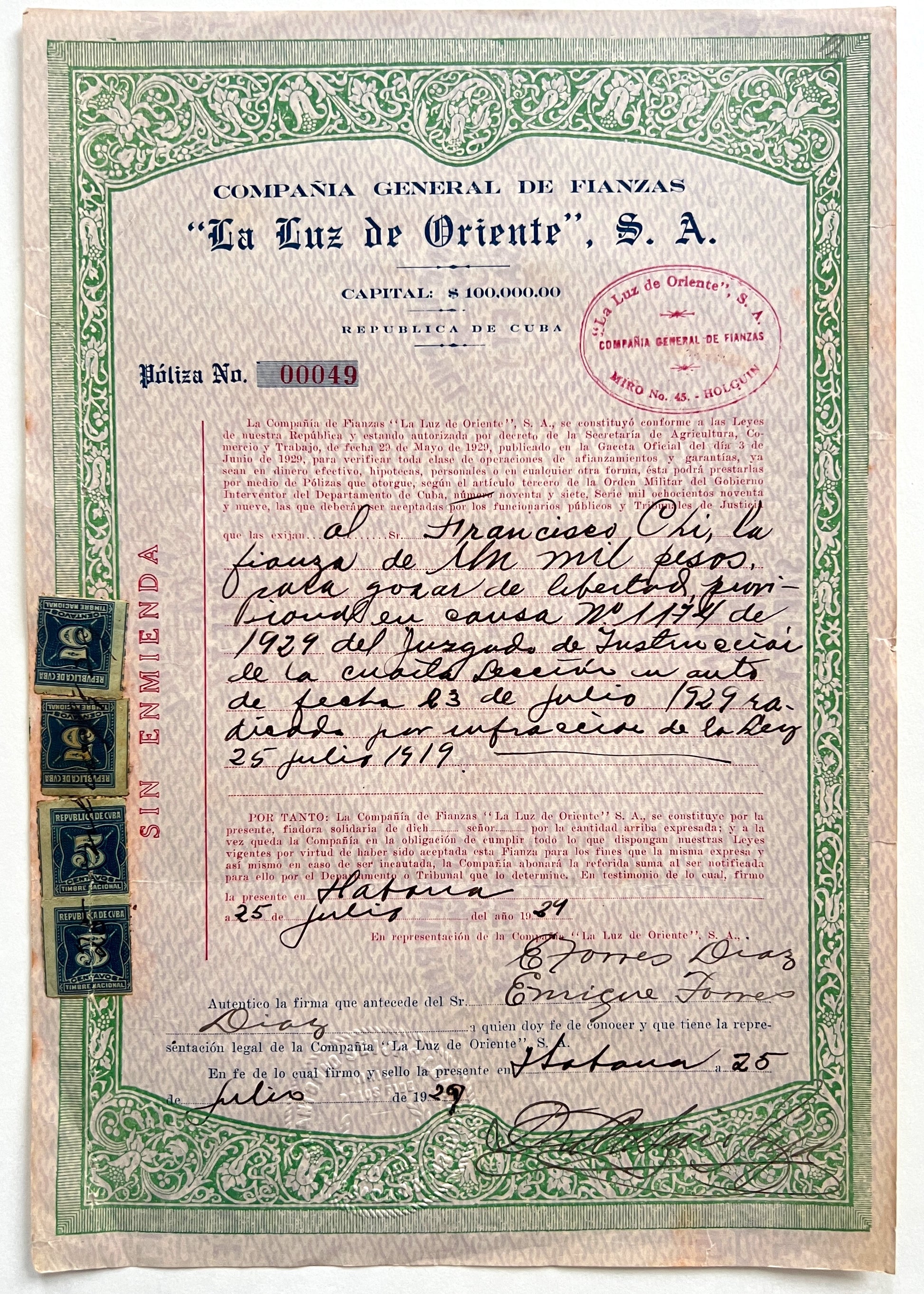 Police testimony in his case and the demanding juridical process highlight the precarious legal status of Chinese immigrants during this era and the use of minor infractions to extract revenue through predatory fines and bail. Chi was represented by a Cuban lawyer and although he likely made around 1 peso a day or less as a farm laborer (his listed occupation), he was able to post the expensive bail of 1000 pesos through a bail bond company. One of the most fascinating aspects of the case is represented by the bond he used, included in this group of material and issued by “La Luz de Oriente" S.A. Compañía General de Fianzas. “The Light of the East” was probably the subsidiary of a Chinese corporate association (e.g. Casino Chung Wah), in which community capital was pooled to pay the state fines and bail of Chinese men targeted by the national and sanitary police.