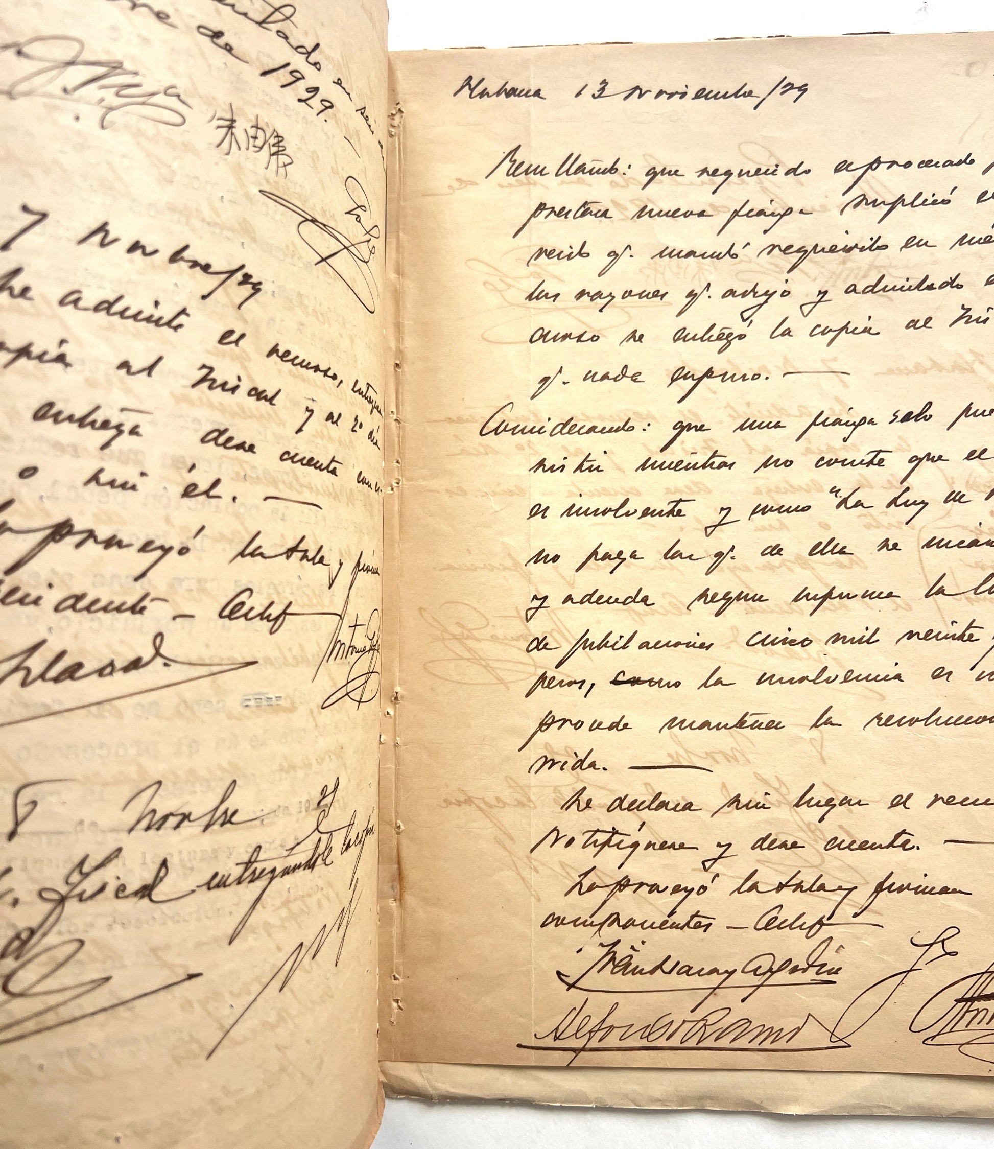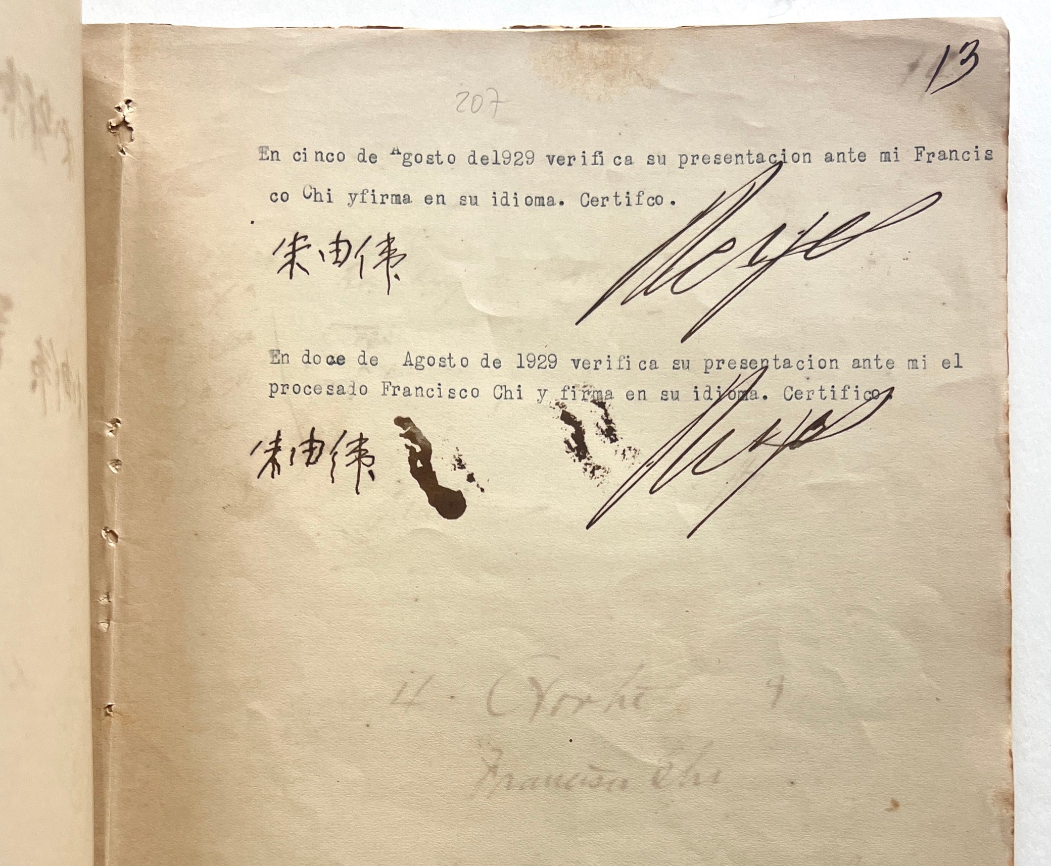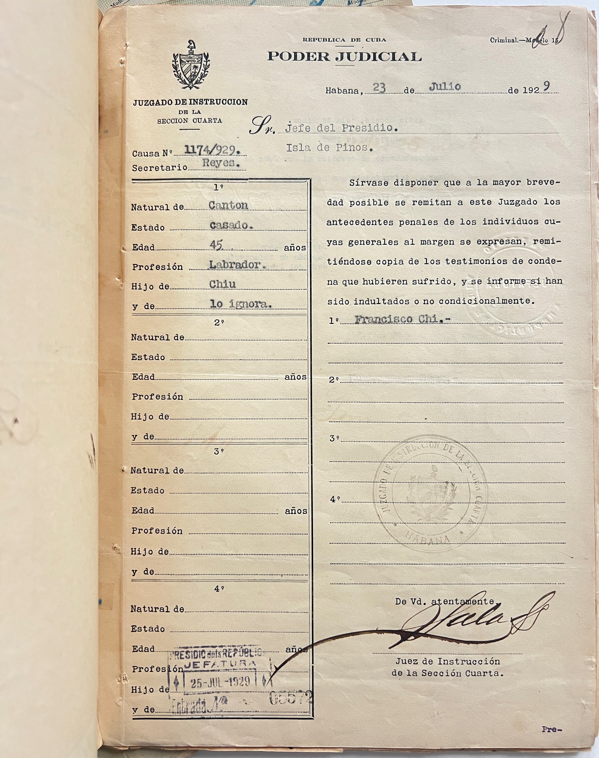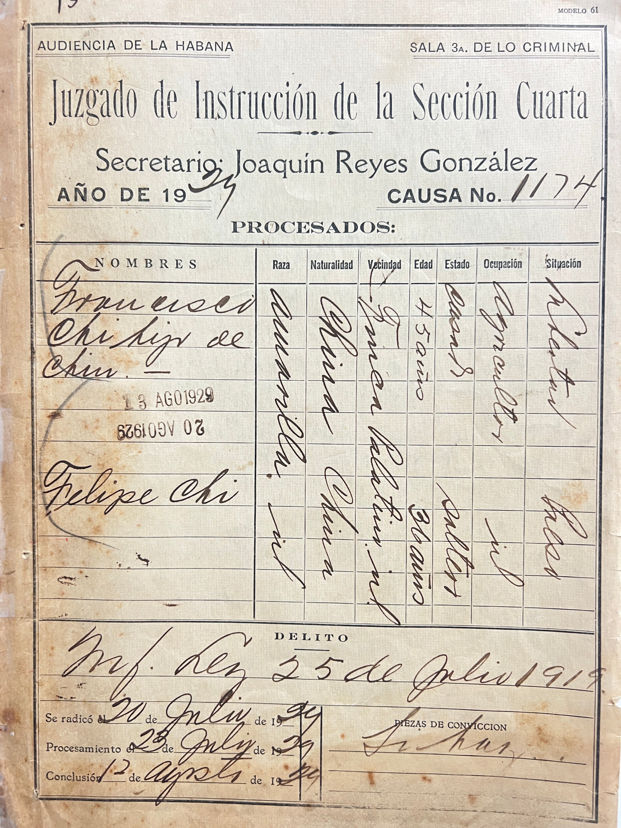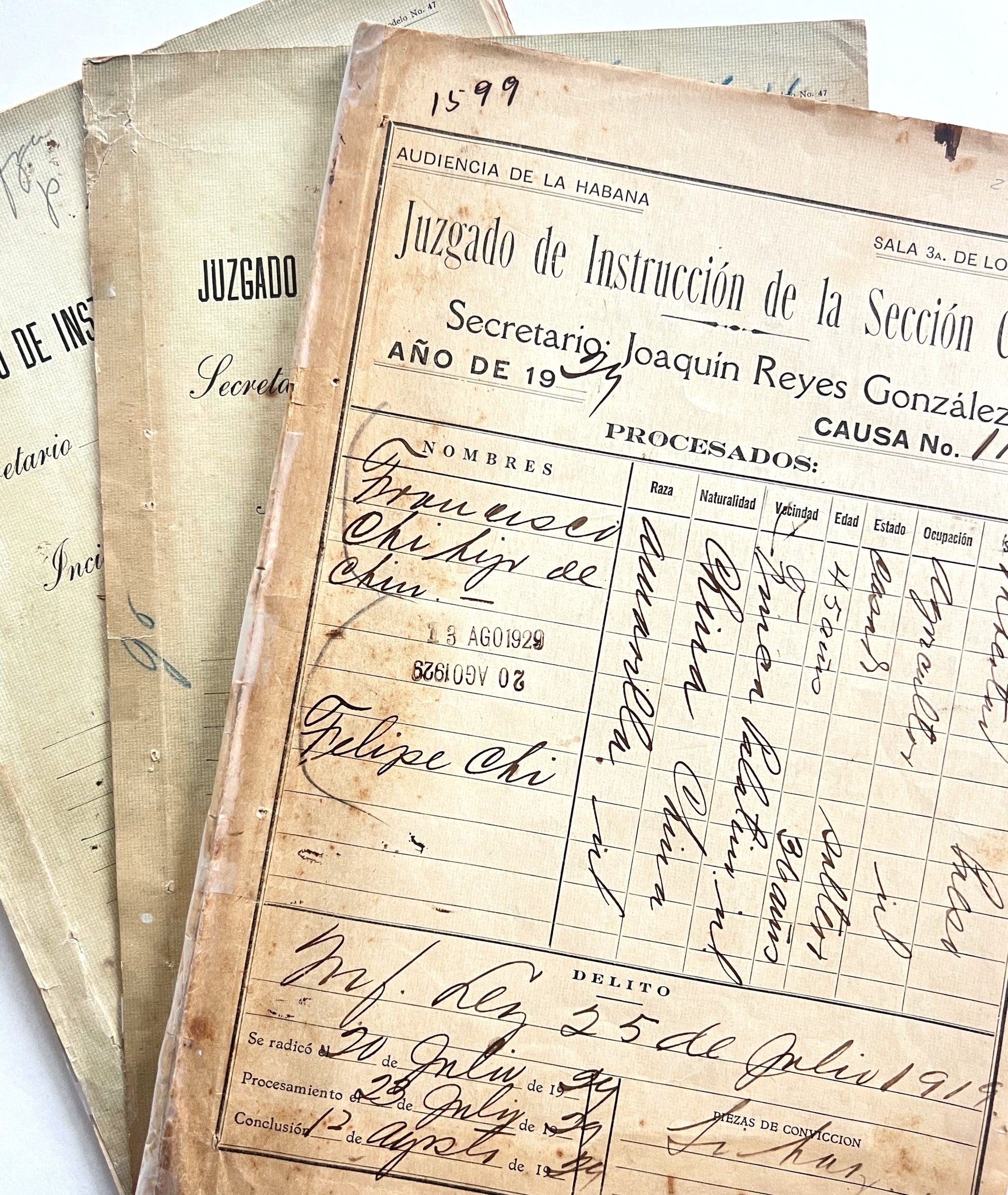 This is a particularly illustrative and complex case - in July 1929, the defendant Franciso Chi was detained, indicted, prosecuted, and eventually convicted for the possession and sale of opium. The other suspect, El Viejo, initially fled, and although he and his many aliases appear in the files, including letters regarding what seems to be his recapture and imprisonment, Chi is the main subject. The extensive reporting describes surveillance of the accused, the seizure of a minor amount of drugs and paraphernalia, 175 pesos, and some personal effects; the files also include correspondence, demographic data, depositions, notes on the movement of the prisoner, defensive arguments, judicial conclusions, and many examples of Chi’s manuscript Chinese signature verifying that he had been provided adequate translation of the proceedings.
