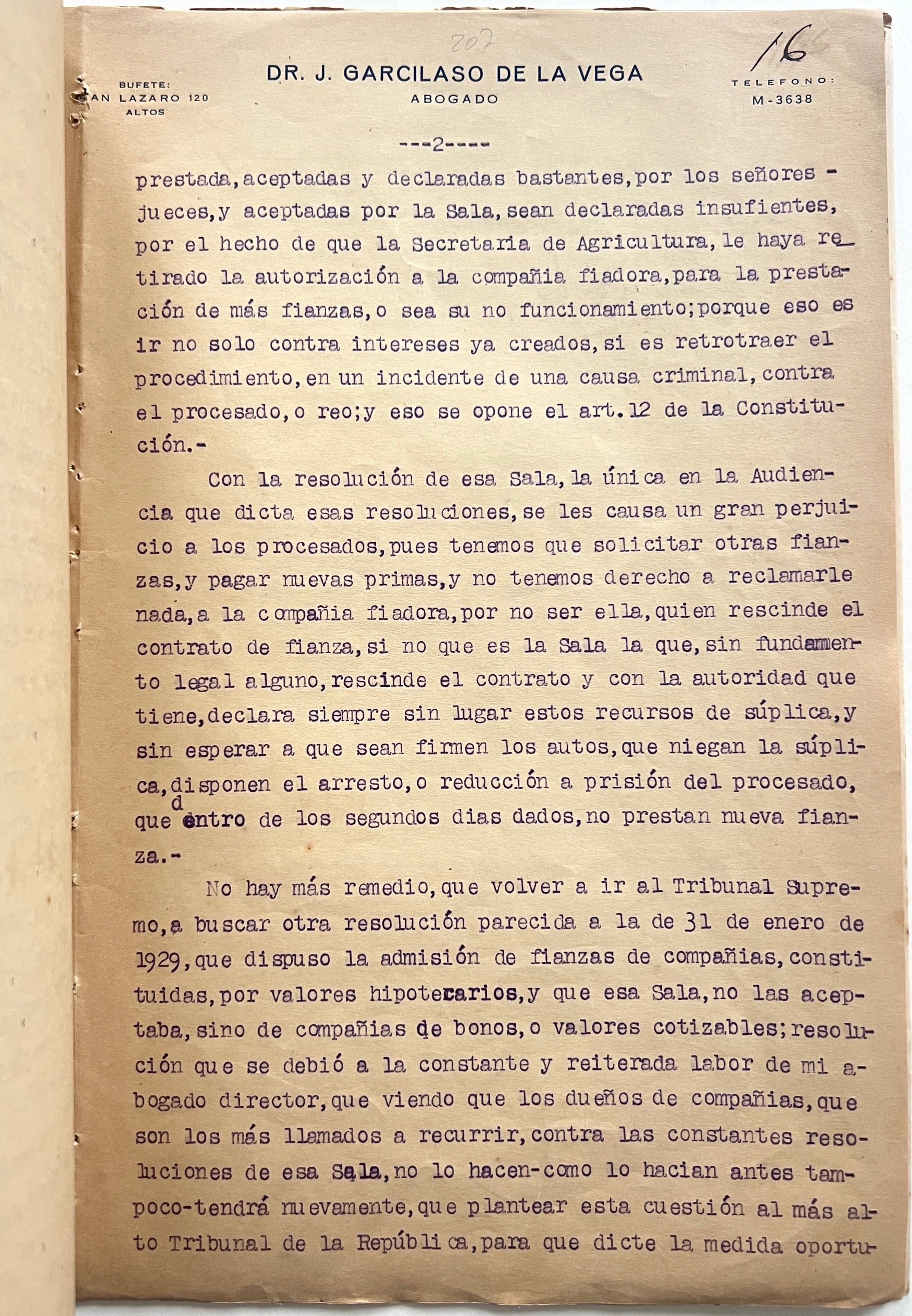 The final section of the case file includes significant controversy over the solvency of La Luz de Oriente and its legal right to post bail for Chi; a lengthy and impassioned letter from his lawyer challenges the court’s refusal to accept the company’s bond and the constitutionality of keeping the accused in prison indefinitely. Further correspondence suggests the bond was eventually accepted, or at least Chi was released despite the court’s continued rejection of La Luz de Oriente’s surety, but he failed to appear back in court for his conviction. The last few letters address the state’s seizure and deposit of the 1000 peso bond and the secret police’s search for Chi. The file ends with a letter from February, 1930, stating that he has not been found and is not known to the sugar mill he claimed as his employer when arrested.