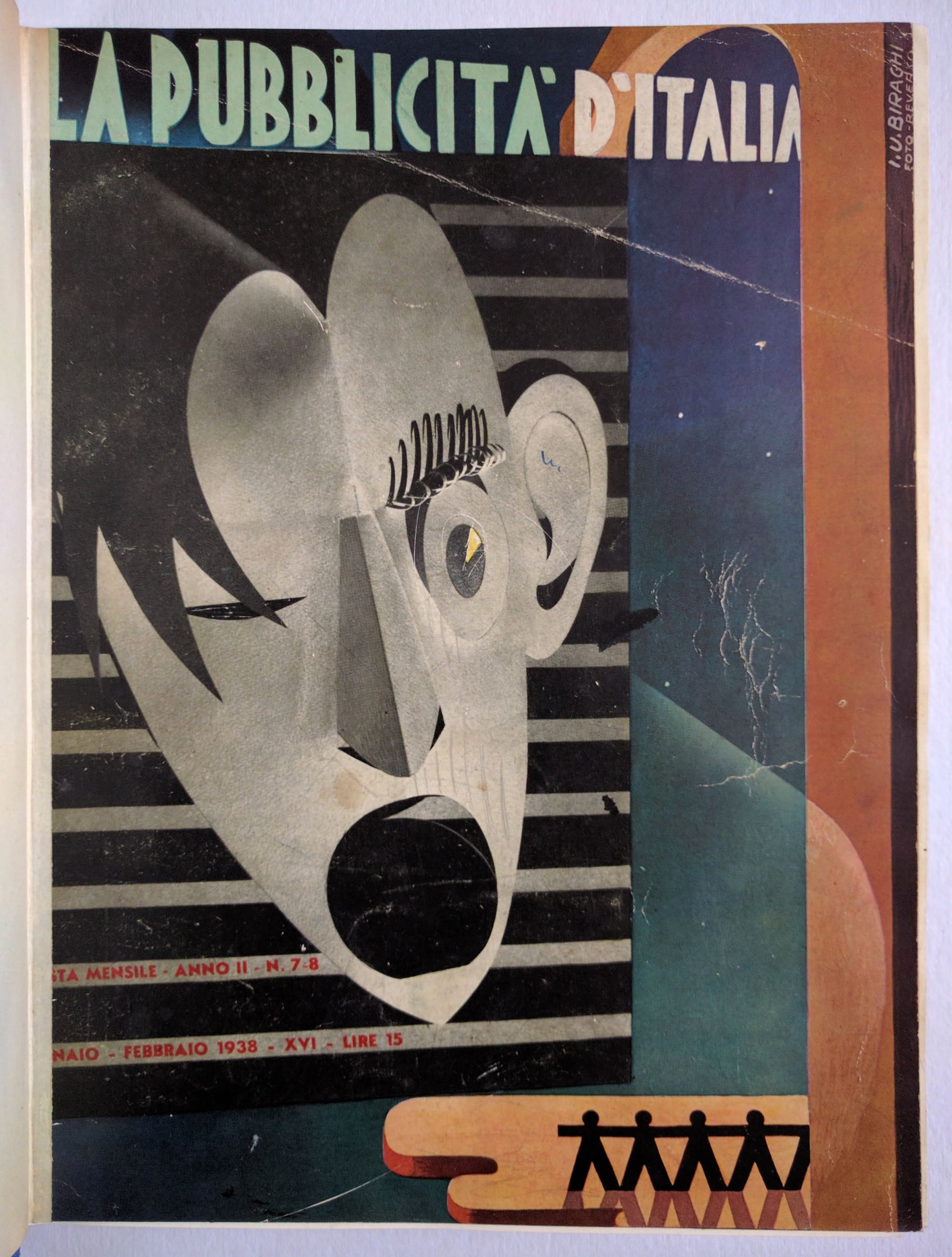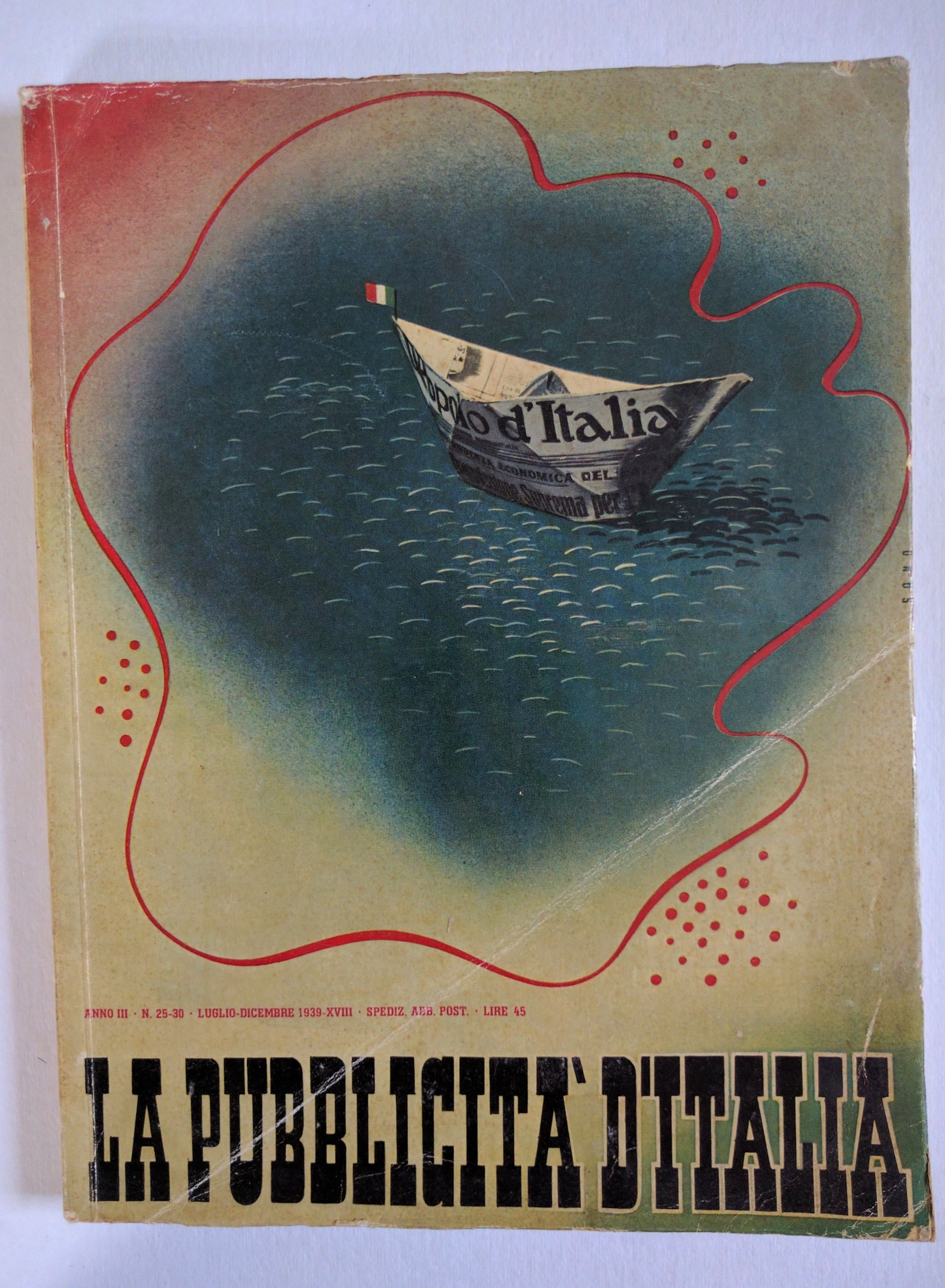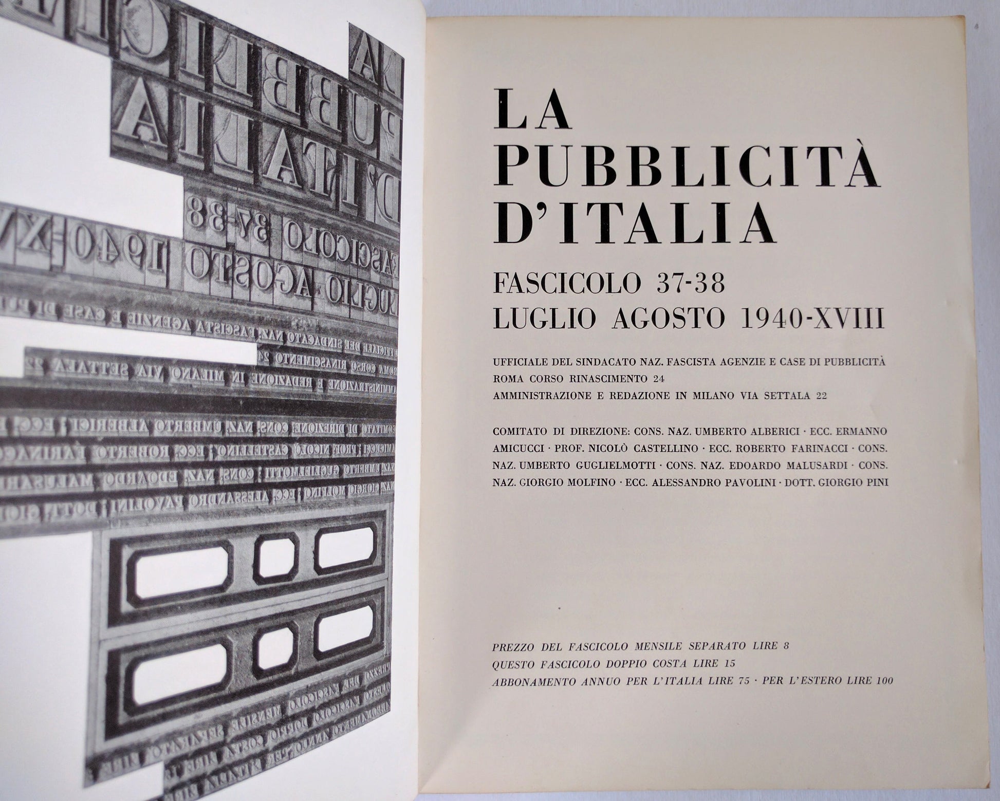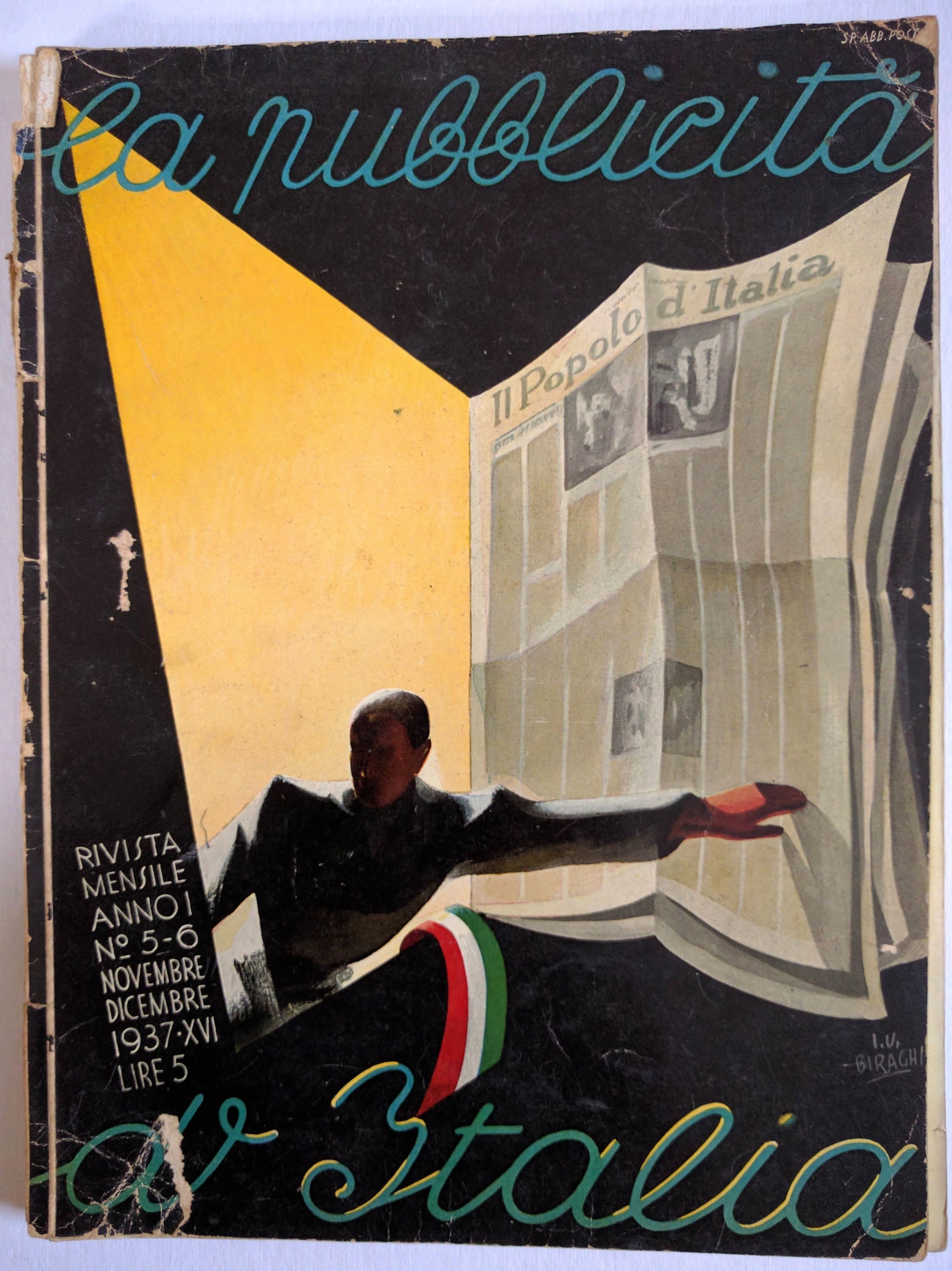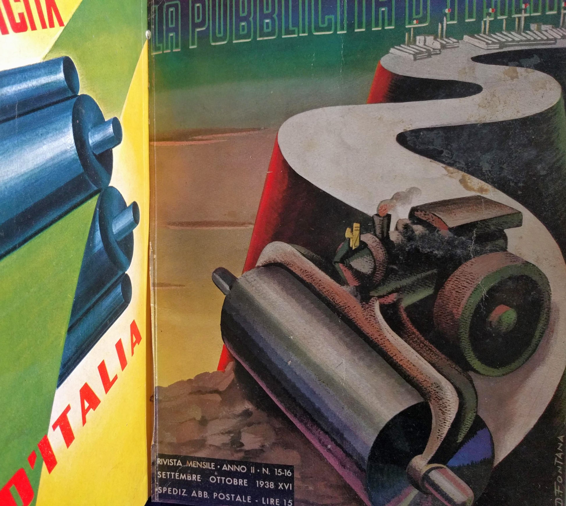 La Pubblicita̧ ̀ d'Italia: [Organo ufficiale del sindacato nazionale fascista agenzie e case di pubblicita̧ ̀]. Nos. 5-20, 25-30, 37-38, and 43-46. Milan: N.p., 1937-1941. 25 numbers in 11 issues: 7 bound in 2 vols. (nos. 7-18 and 43-46), 4 loose (nos. 5-6, 19-20, 25-30, and 37-38). 4to, approx. 90-150 pp. each; illustrated throughout, many in color, reproducing Italian advertising campaigns for various commercial, industrial, domestic, and agricultural products or brands, with articles on modern marketing strategy, mass communication, the art of propaganda, and collectivism, with a variety of printing techniques and papers, no. 43-46 with numerous folding plates, most issues good to very good internally, no. 7-8 final ten leaves defective, no. 25-30 with an abraded first leaf; bound issues with orig. pictorial wraps (except the back cover of no. 7-8 and the front cover of no. 43-46), loose issues in orig. wraps, no. 5-6 separated with losses to spine, no. 37-38 with rough 4 in. loss to front top edge. A substantial run (25 of 60 numbers) of the remarkable Italian advertising review, much of it by or about the Fascist Party's official ad agency, the Unione Pubblicità in Italia (UPI) and its associated artists, many of them well-known futurists. The publication captures the rich collaboration between the Italian avant-garde, advertisers, and propagandists in extravagantly produced issues that highlight fascism's politically conscious advertising. In particular, it captures the Italian fascist affirmation of mass culture, modern consumers, and the psychology of advertising. Features on specific markets in advertising include comestibles like food, liquor, and tobacco; arts including cinema, theater, fashion, and exhibitions; science and technology; industry; automobiles and motorcycles; tourism; and the armed forces. Essays discuss economic and technical aspects of advertising, including strategies and psychology, but also formal elements of color, type, design, etc. Also covered are various advertising media including film, television and radio. Intended to demonstrate the innovation and sophistication of modern Italian advertising, the editors experimented with typography, illustrated plates, intaglio and block printing, and unusual papers ranging from laid to heavy gloss and newsprint. A special issue on Giambattista Bodoni and Gutenberg includes a reproduction of the type form for the title page. Altogether an exhaustive survey of Italian advertising during the fascist period—and the artists who worked in its service, including: Fortunato Depero, Guido Marussig, Alredo Calvadini, Boccasile, Calze, Carlo Dinelli, Erberto Carboni, Dudovich, Biraghi, etc. Early issues are scarce. OCLC lists only a few institutional holdings worldwide, all with partial or single-issue holdings. There are two locations recorded in North America: the Library of Congress (no physical copies; the OCLC record appears to be derived from their binding catalog, which references two issues never? held) and UI-UC's copy, which is nearly complete. SOLD