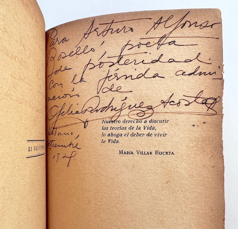 Rare, signed first edition of a novel that "created a vivid argument for female equality" by the novelist and journalist Ofelia Rodríguez Acosta, one of Cuba's most influential suffragists and social reformers. She "enjoyed extraordinary public visibility" through her journalism and editorials in Bohemia. Her radical feminist writings supported free love, reproductive freedom, and homosexual marriage.