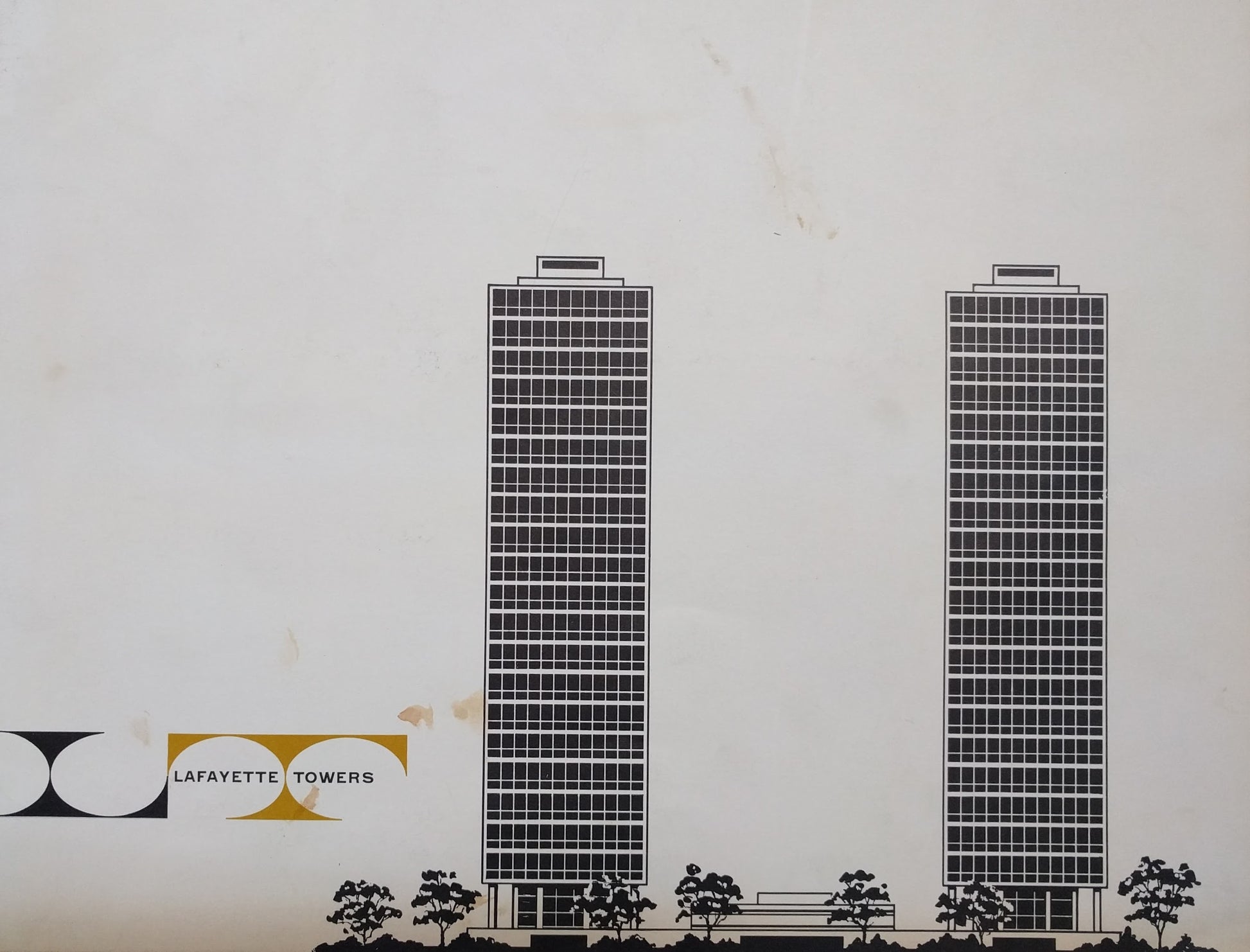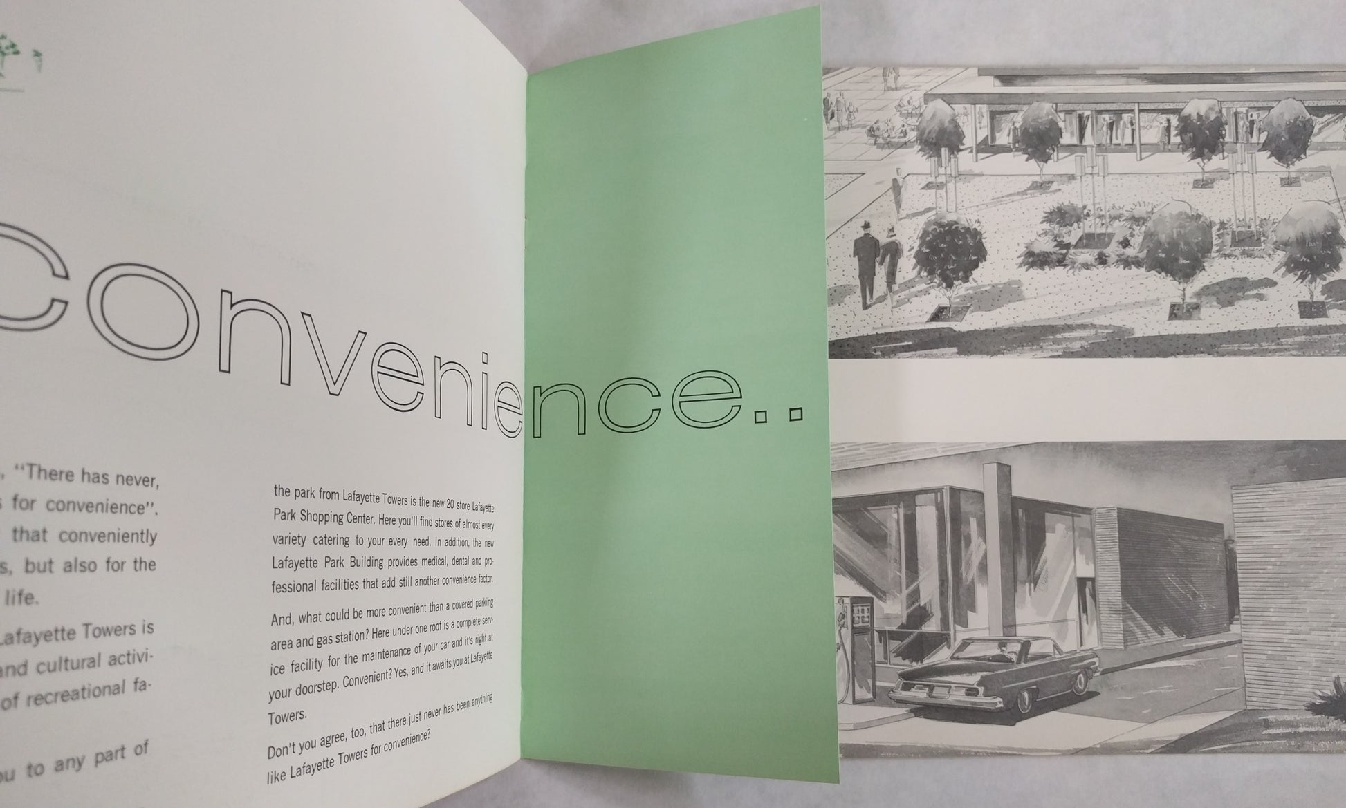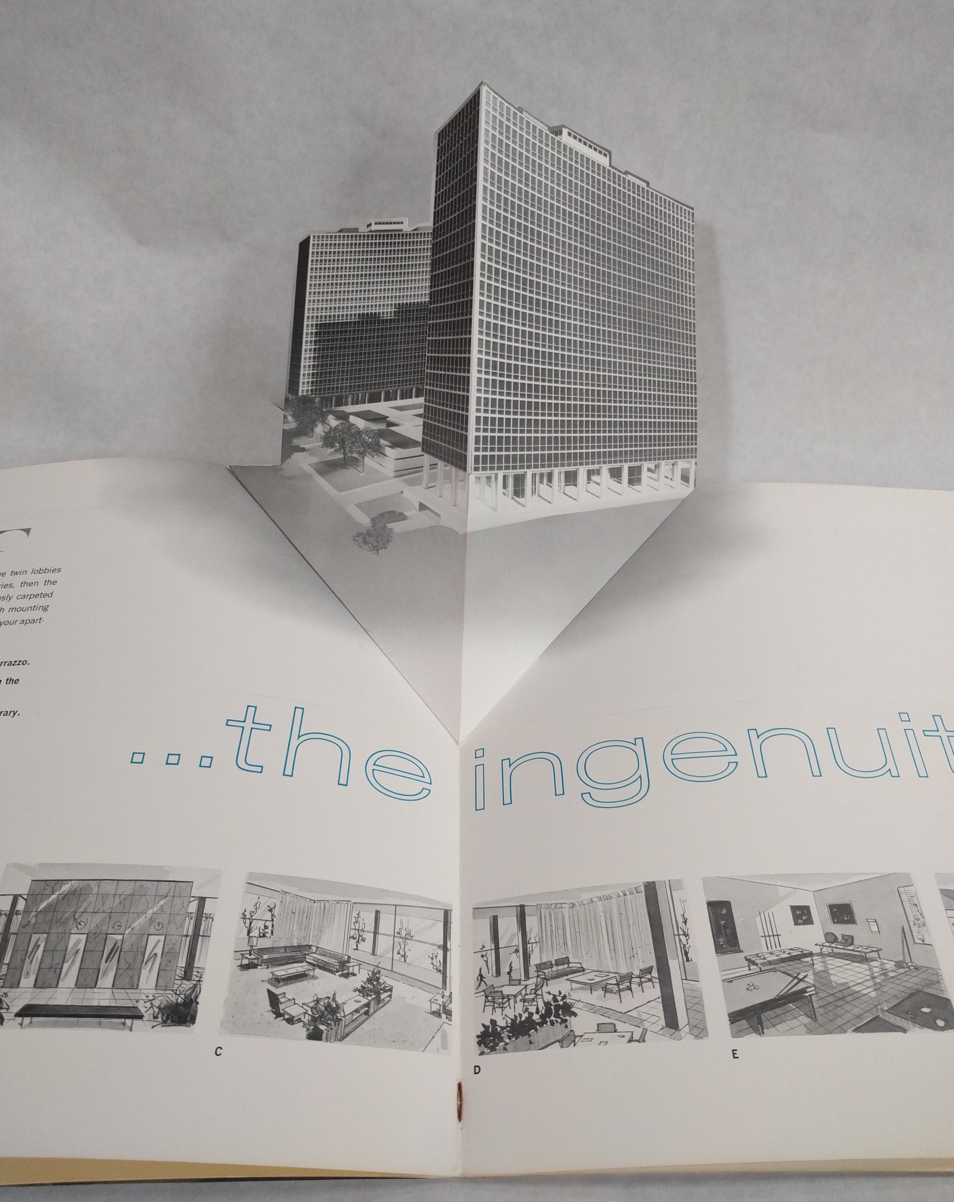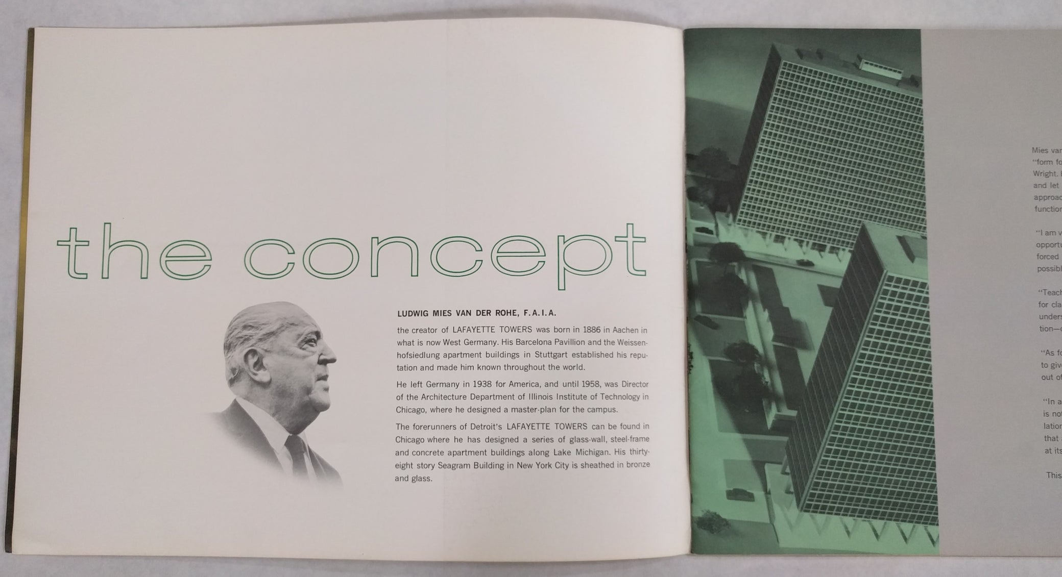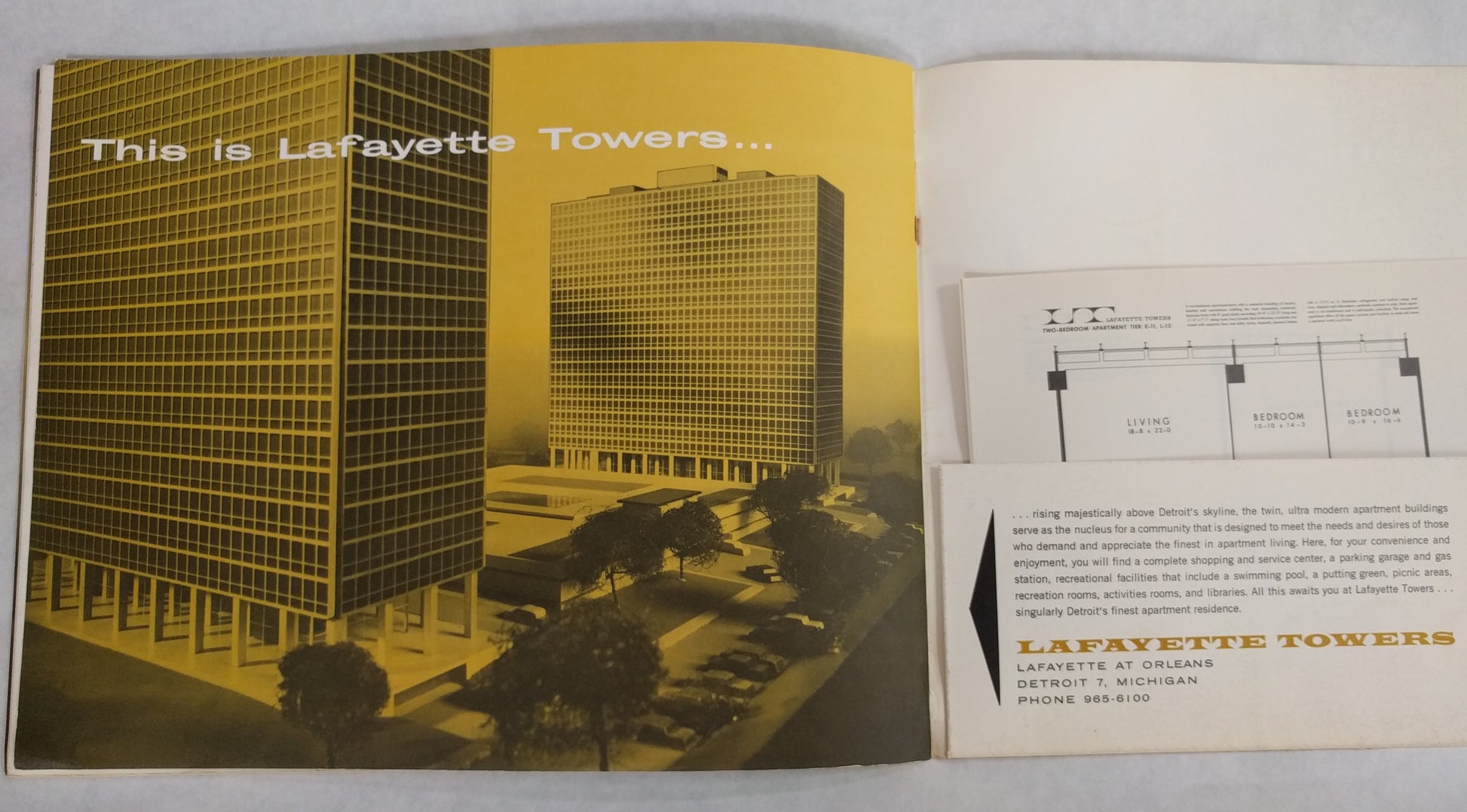 [Mies van der Rohe, Ludwig] Lafayette Towers [title from cover]. [Detroit, MI]: N.p., n.d. [ca. 1961]. Oblong folio, 11 x 14 in., [16] pp.; primarily illustrations, some in color, with pop-up building and multi-color inserts, mild thumbing lower right, overall very good; stapled color wrapper, front wrapper printed recto and verso with folding panel, rear wrapper with inside pocket flap containing eight apartment floor plans, loose as issued, wrappers toned along tail edge with scattered marks and discoloration, rear wrapper separated at top staple. An enthusiastic sales pitch for Lafayette Towers—the final buildings designed by Mies van der Rohe as part of his original plans for Lafayette Park, one of Detroit's major urban renewal projects. This large format promotional catalogue brings together the architect's signature modernism with exuberant graphic marketing of its state-of-the-art appliances and luxury amenities. A startling, optimistic artifact of planned housing and intentional development in a city that would shortly experience dramatic changes following the Civil Rights movement and post-industrial contraction. With the redevelopment of Lafayette Park, Mies van der Rohe and his frequent collaborator, the urban planner Ludwig Hilberseimer, imagined a largely traffic-free, independent neighborhood constructed on 130+ acres in downtown Detroit. The community was designed with its own infrastructure and a variety of residential options, from detached single-family homes to high-rise towers. Largely completed according to van der Rohe and Hilberseimer's plans, it remains an economically and racially diverse community, and a case study of large-scale urban planning. OCLC locates a single copy, at the Univ. of Michigan. SOLD
