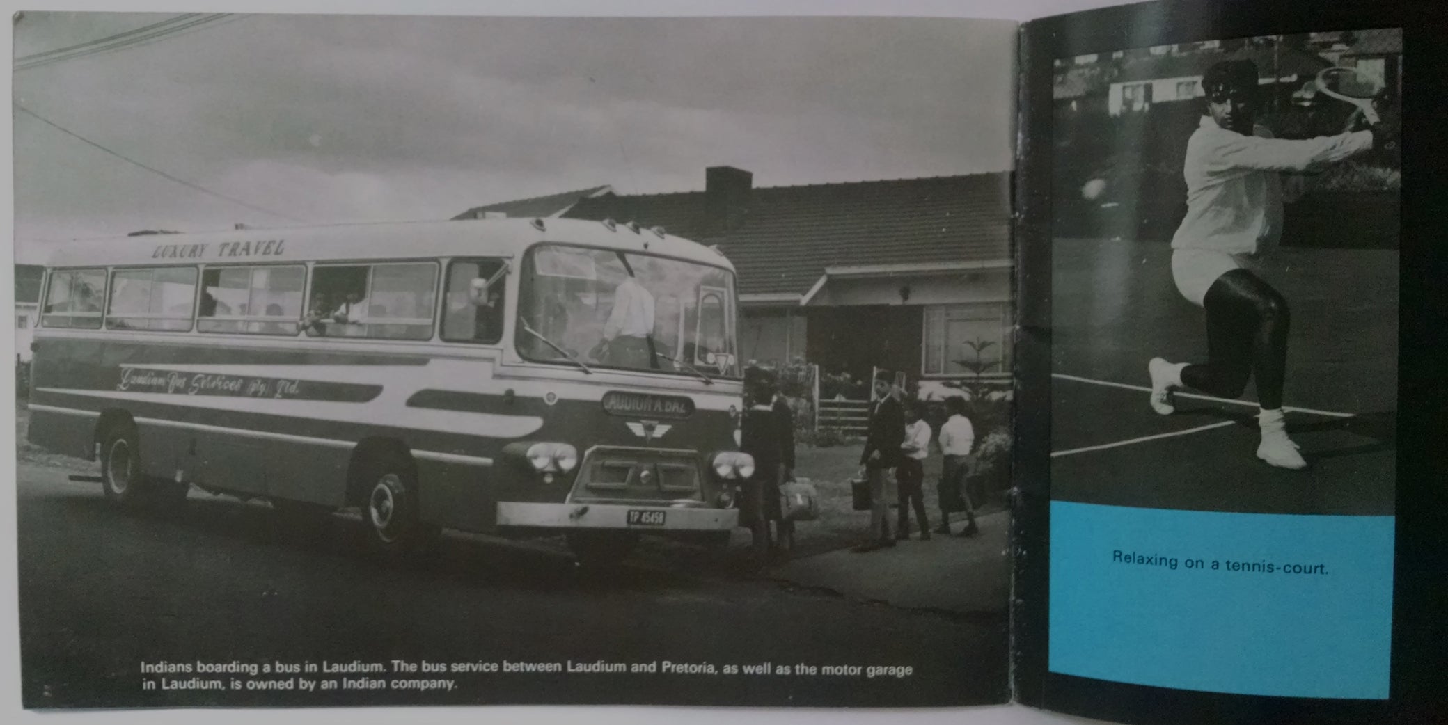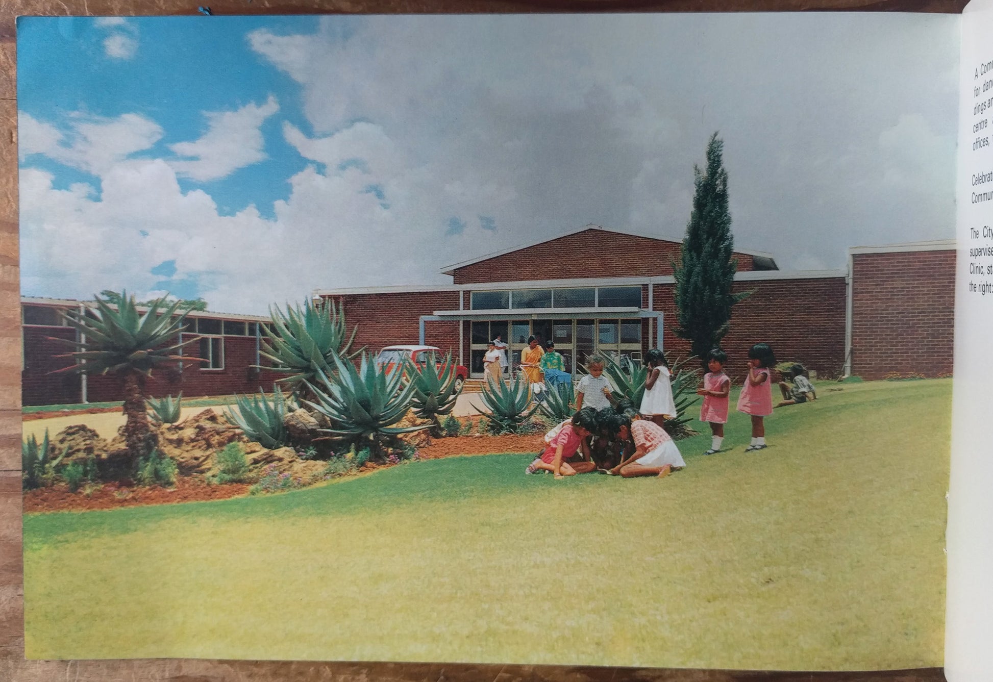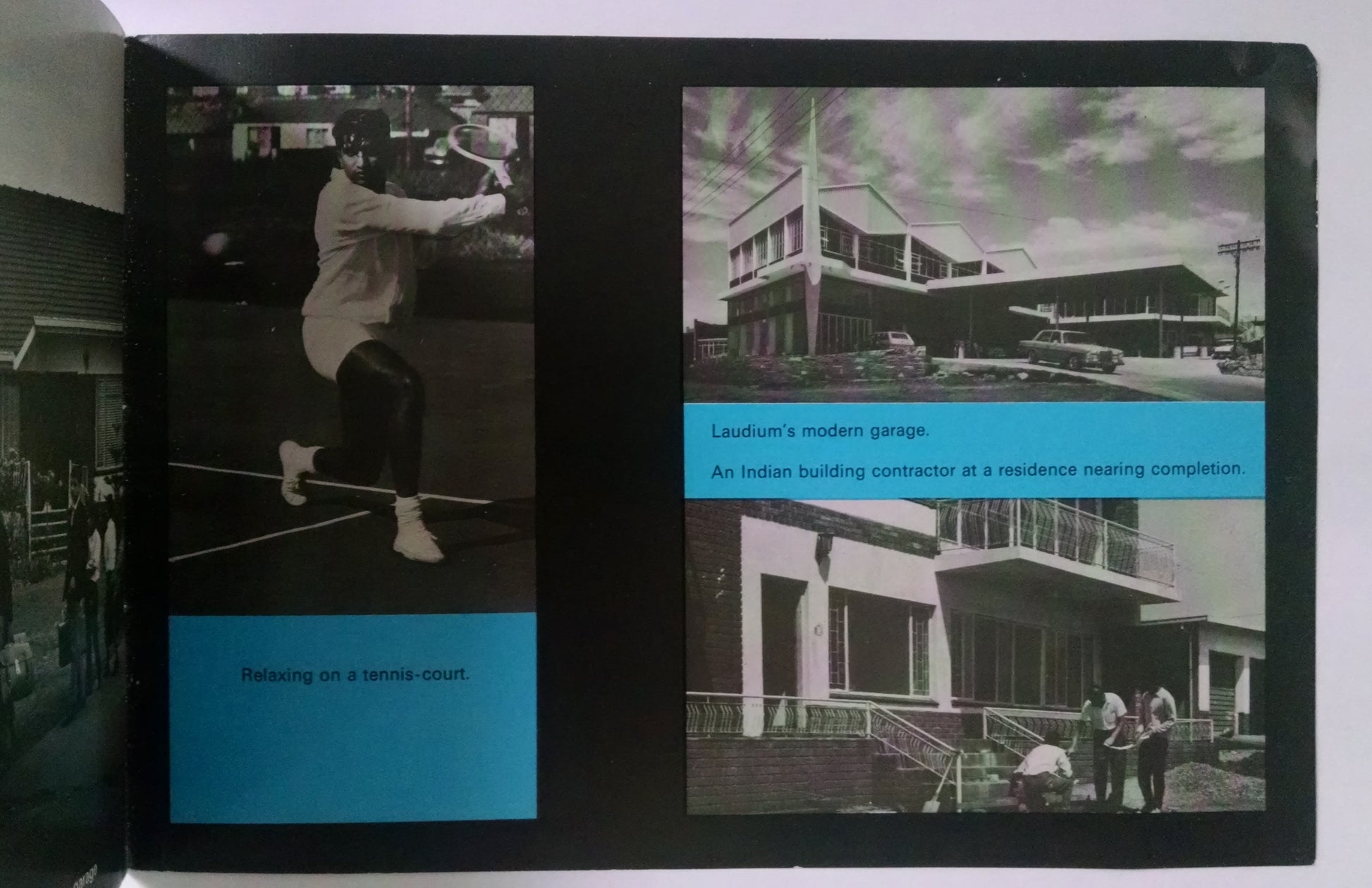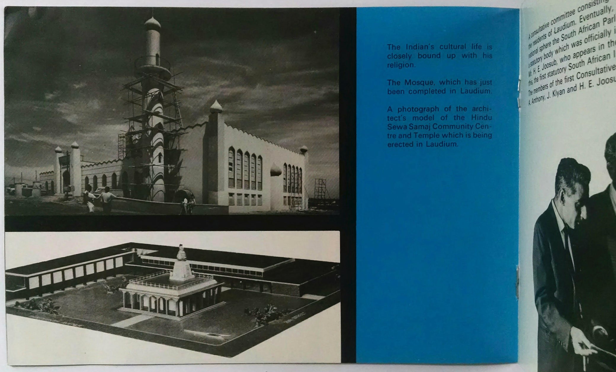Laudium: Where the Indian Community of Pretoria Lives. Pretoria, South Africa: Department for Cultural Affairs, City Council of Pretoria, 1968. Oblong 8vo, [20] pp.; promotional brochure designed by the city council to advertise the modern architecture, public infrastructure, recreation facilities, mosque, Hindu temple, and business district of an Indian township in Pretoria, profusely illus. in color and bw, orig. color illus. wrappers rubbed, interior bright; very good. Rare piece of apartheid government propaganda, putting a positive face on the separate “colored” community of Laudium, with architectural plans for council houses, costs for municipal services, and photos celebrating the modern amenities and free education available to residents of this segregated suburb. OCLC locates only a single holding in North America, at Michigan State. SOLD
