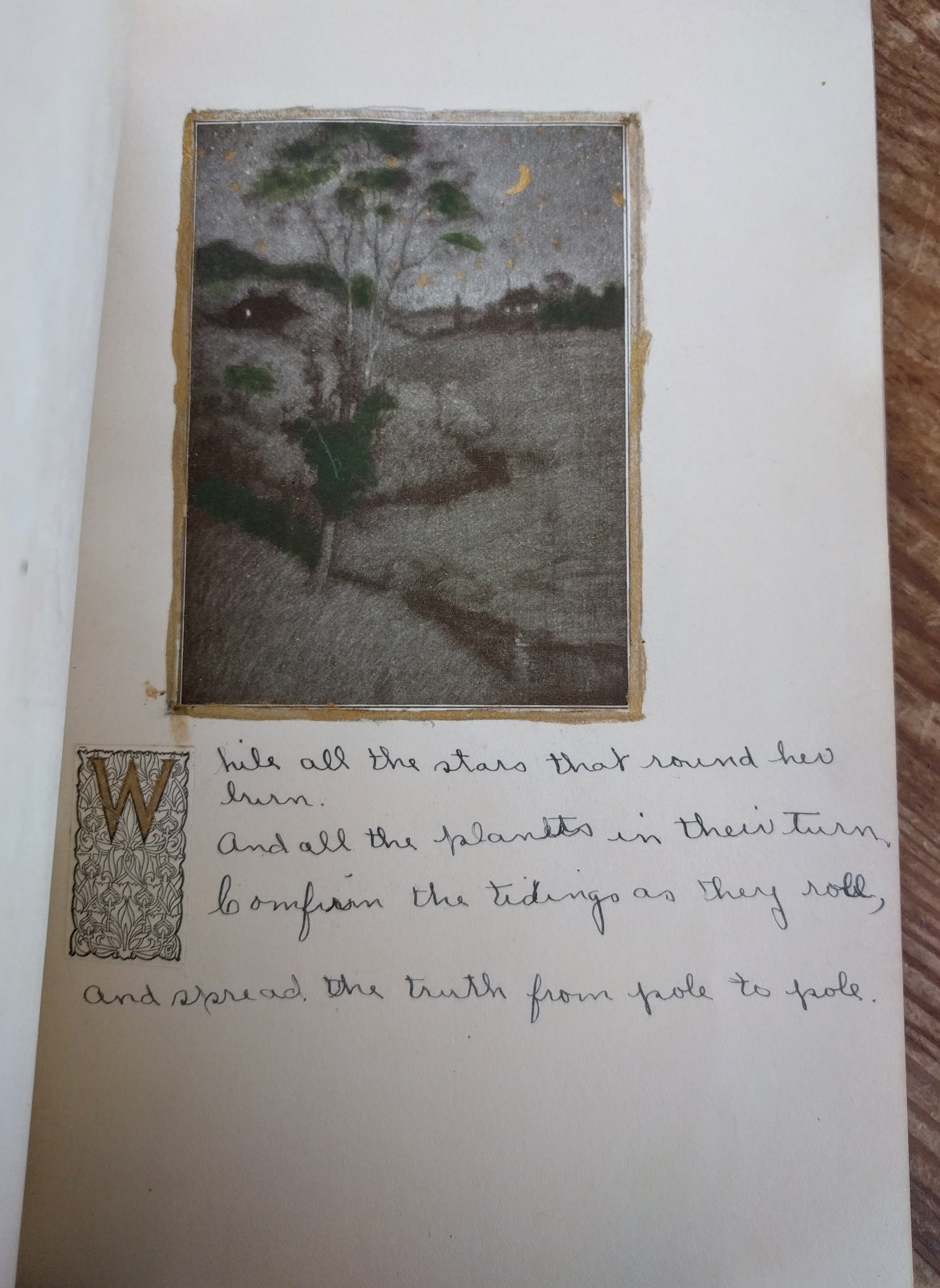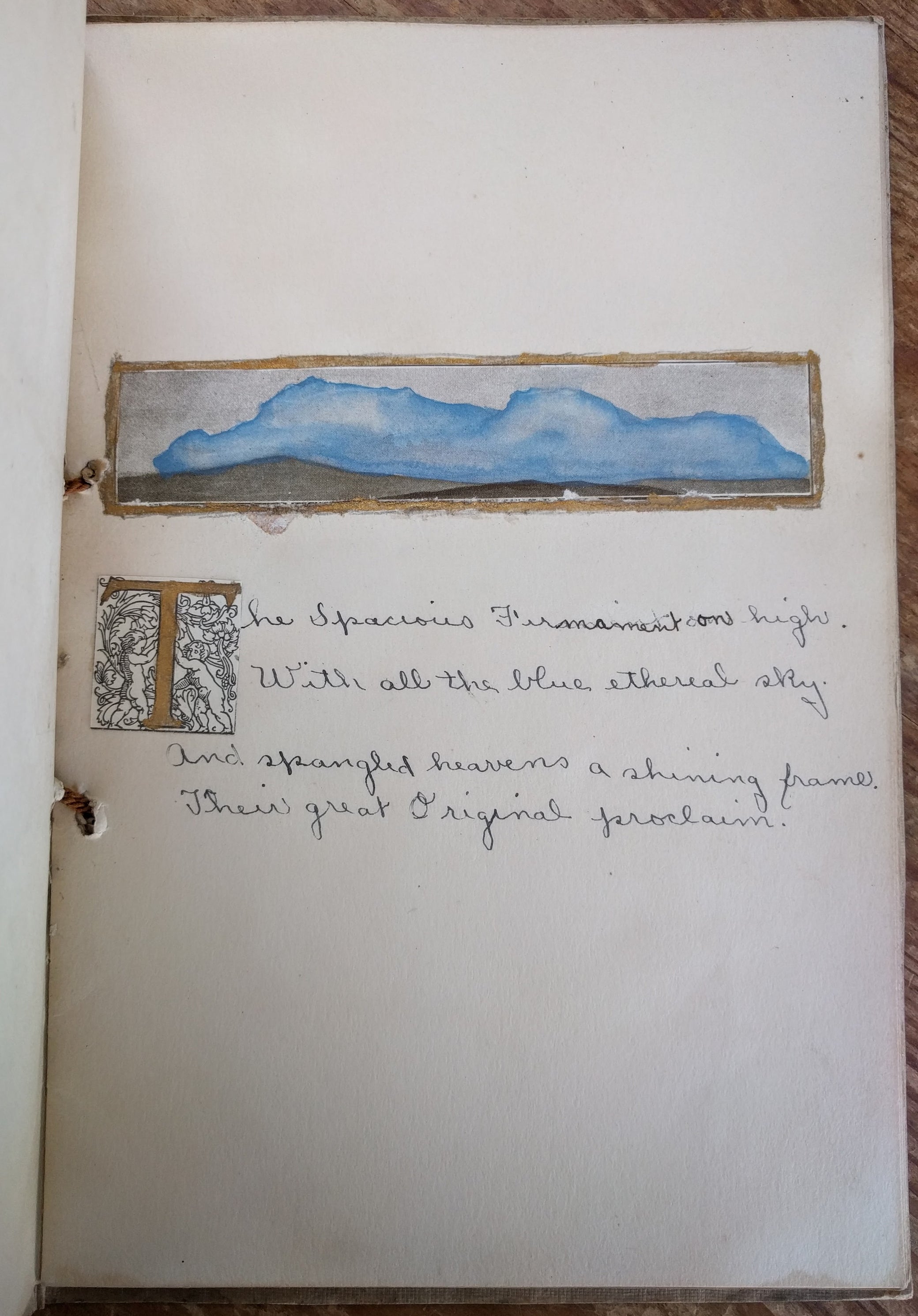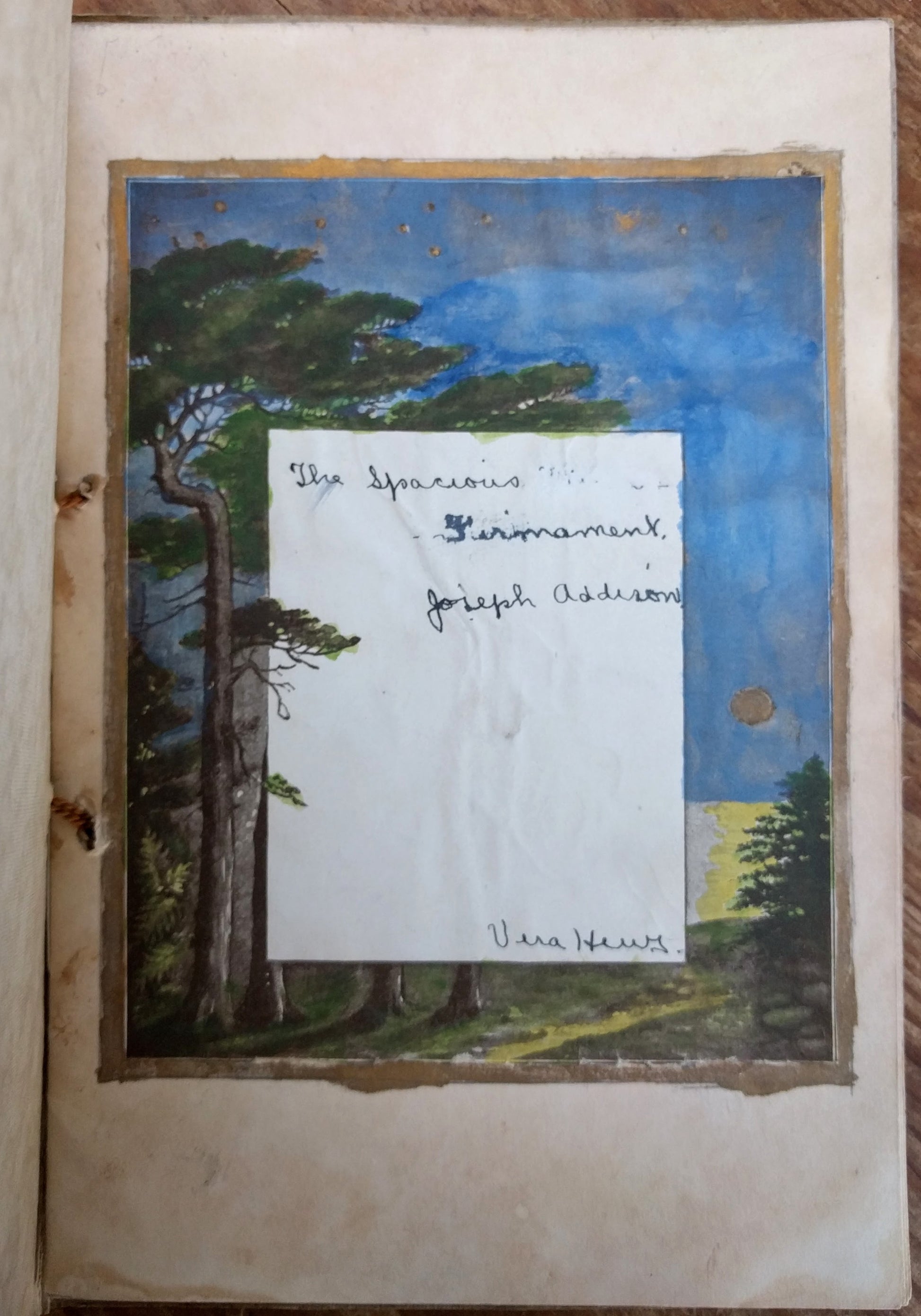 [Vernacular Bindings] [Poetry]. Hews, Vera. Woman's Scrapbook with Manuscript Text of Joseph Addison's “The Spacious Firmament” and Hand-colored Plates. N.p., n.d. [ca. 1940s?]. 8vo, 8 leaves; full text of Addison's poem together with bw reproductions tipped-in and hand-colored, text and illus. recto only, in stabbed, illus. heavy card wrapper; leaves and wrapper sl. soiled and toned, small loss to cover illus., one interior illus. missing and one abraded with loss on left edge. Attributed on title page to Vera Hews, perhaps a church project? $20