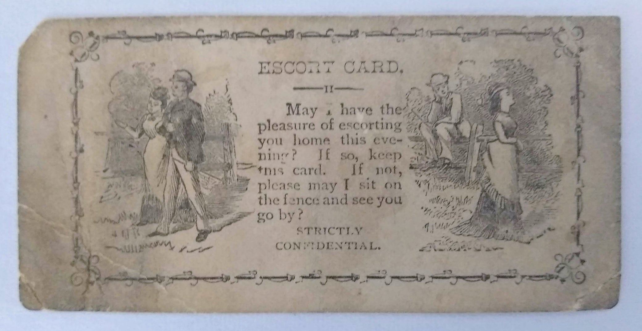 (Calling Card) Escort Card: May I have the pleasure of escorting you home this evening? [...]. N.p., n.d. [19th cent.]. 1-⅝ x 3-⅜ in., printed recto only; darkened, small loss at top corner. “May I have the pleasure of escorting you home this evening? If so, keep this card. If not, please may I sit on the fence and see you go by? Strictly confidential.” Such flirtatious calling cards, a.k.a. “acquaintance cards,” were popular in the US in the late 19th-century. $50
