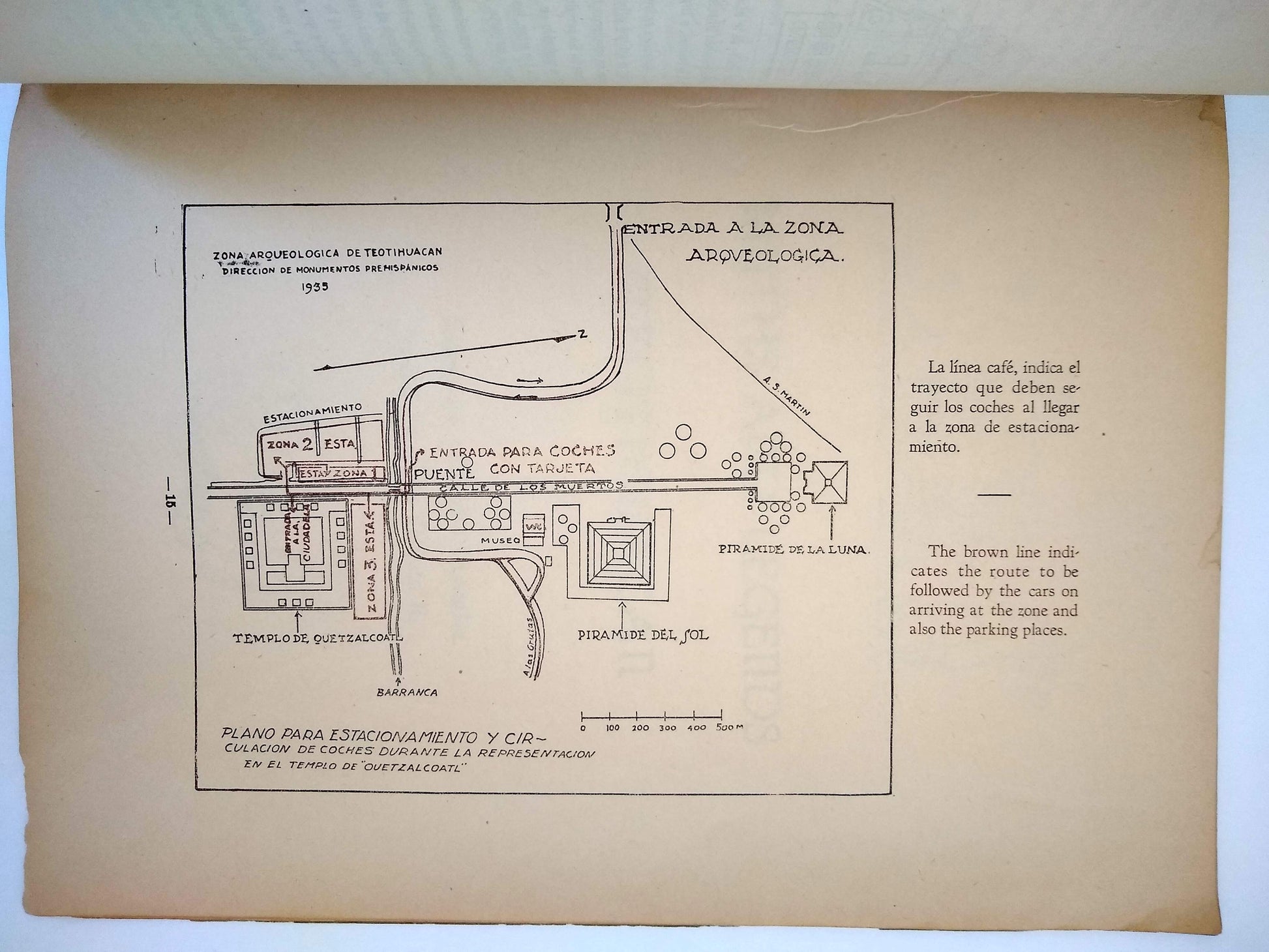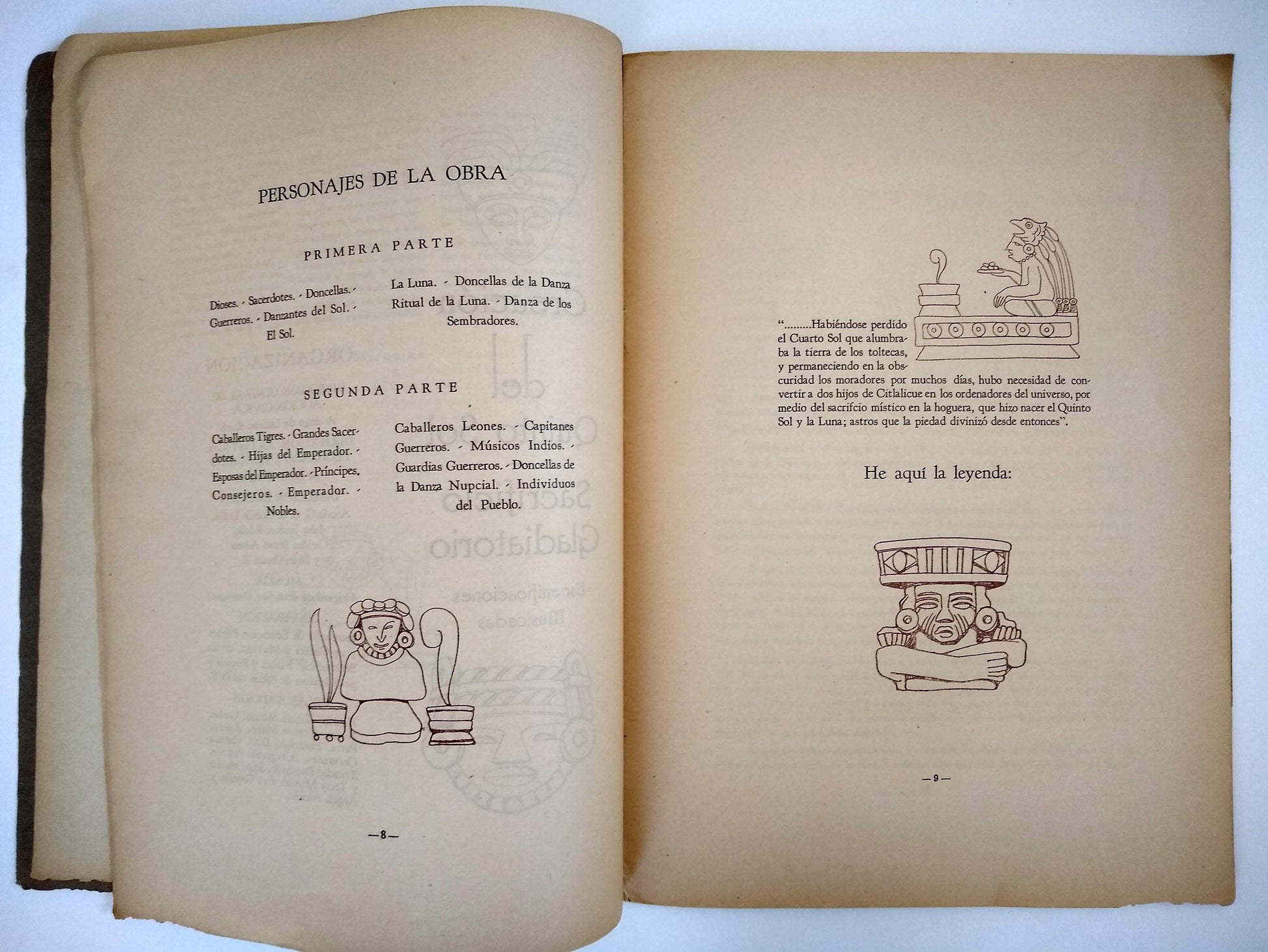 [Dominguez, Francisco; Gonzalez, Carlos; and Efren Orozco Rosales] Departamento del Distrito Federal [México], Dirección General de Acción Cívica. Mitos y Leyendas de Teotihuacan. Creación del Quinto Sol; Sacrificio Gladiatorio: Escenificaciones Musicadas Myths and Legends of Teotihuacan. Creation of the Fifth Sun; Gladiatory Sacrifices: Musically Arranged Scenes. Mexico, D.F.:, Imp. “Cosmos”, 1935. Tabloid, 29 pp.; program with illus. head- and tail-pieces, mostly repeating from Spanish to English sections, and map; stapled stiff card wrapper, with color illus. recto and verso. Damage to wrapper at lower forecorner, causing small area of loss through the text block (not affecting text or images). Rear wrapper chipped with earlier tape repair. Only fair. Souvenir program for a musical event held at the Teotihuacan archeological zone for the international Lion's Club convention in 1935 (the first time the annual convention was held in a non-English speaking country). Includes a map of the zone indicating where the performance took place and how visits were directed. More than 6,000 members attended the convention, where they were greeted by President Cárdenas. SOLD