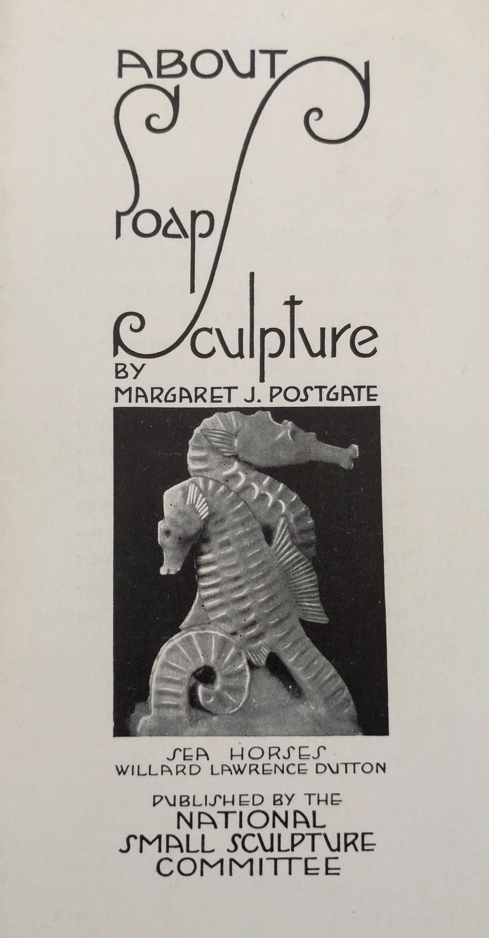 Postgate, Margaret. Modeling Soap Sculptures in White Soap. [New York]: [National Small Sculpture Committee]; [Proctor & Gamble]: [1926]. Single sheet, printed on both sides and folded, folded: 6-1/4 x 6-1/4 in.; fragile at folds, some splitting; together with Margaret Postgate, About Soap Sculpture (New York: National Small Sculpture Committee, [1930]), stapled booklet, [18] pp.