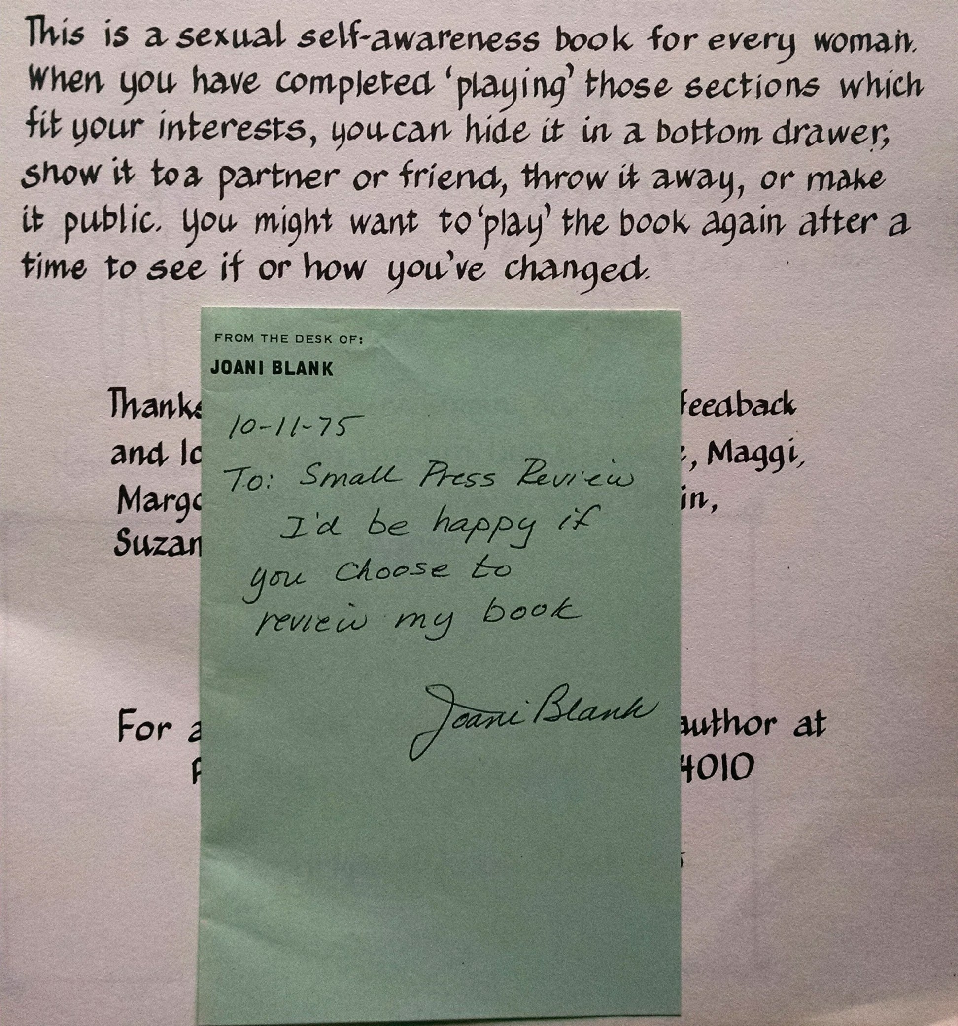 Blank, Joani. My Playbook: for womenabout sex. Burlingame, CA: n.p., 1975. First edition. 4to, 24 pp.; illus. sex education activities book, “invented and handlettered by joani blank,” in orig. orange wrapper, cover illus. by Tee Corrine, with signed letter from author to “small press review” laid-in, worksheets unused, leaves sl. toned, wrapper lightly worn; overall very good. A review copy of Blank's classic feminist sex education workbook with tasks including “portrait of my cunt,” letter writing addressed to an erotic zone of your body, and an application for membership to the “Society of Out-of-the-Closet Masturbators.” OCLC locates only 6 institutional holdings, 4 of the first edition. SOLD