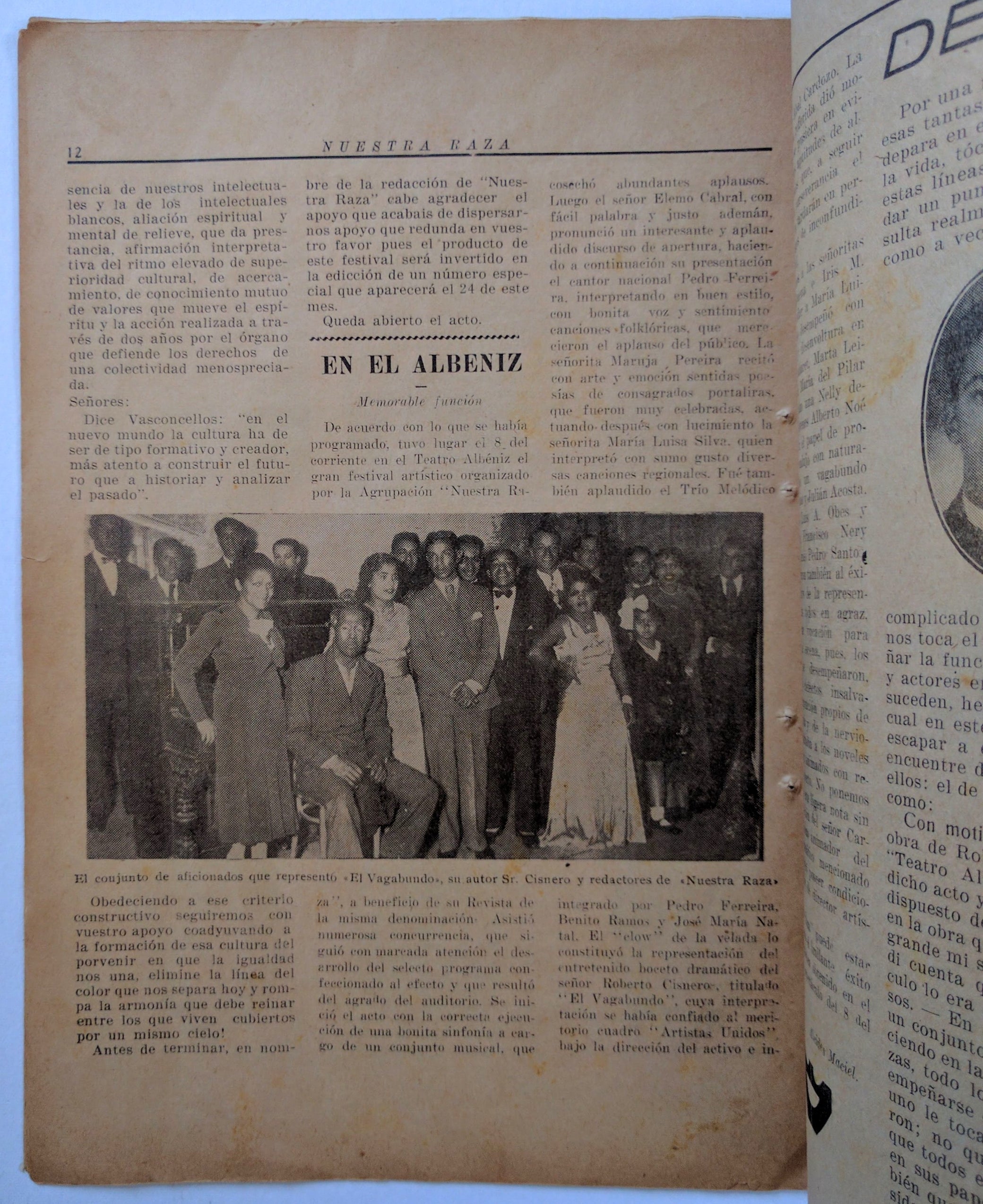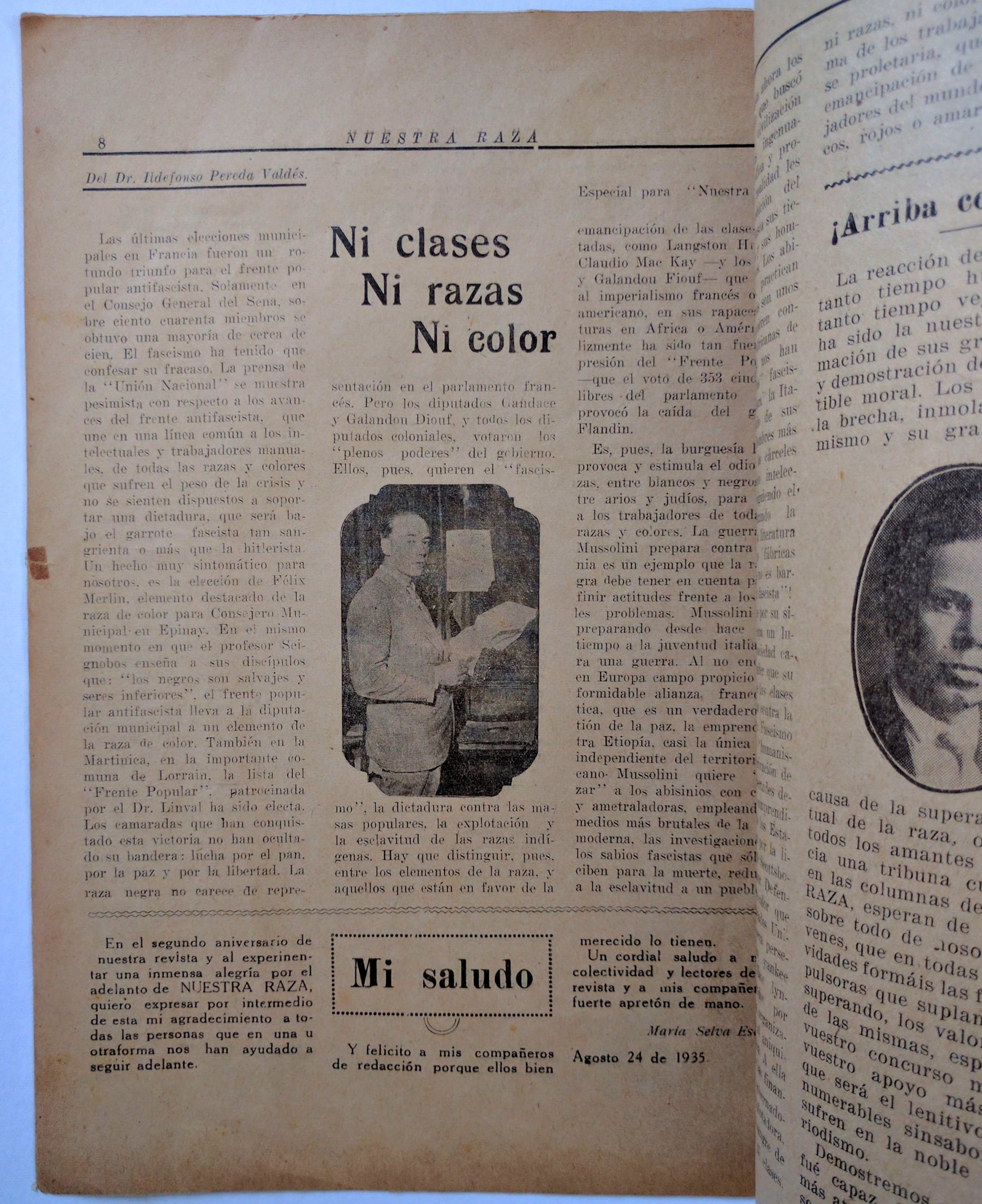 Nuestra Raza: Organo de la Colectividad de Color. Año III, No. 25 (August 24, 1935). Montevideo, Uruguay: 1935. 8vo, 20 pp.; bw illus. throughout from community photos, edges worn, with chips or closed tears; stapled illus. wraps, small early repairs; a pair of stab holes from former binder?; fair. Nuestra Raza was founded in 1917 by the authors, and sisters, Ventura and Maria Esperanza Barrios. The Uruguayan periodical was dedicated to publishing black poets and authors as well as addressing the political and cultural realities of the African diaspora in South America. It folded after less than a year and was resurrected in 1933 by Ventura her brother, the poet Pilar Barrios. By this time, Montevideo had become a center for the Afro-Uruguayan community. Its second run continued for 15 years, until 1948, but issues remain extremely scarce. The impact of the journal as an advocate for racial equality and the expression of black experience cannot be overstated for intellectuals across Latin America. This issue commemorates founding journalist Maria Esperanza Barrios, who died in 1931. It also celebrates the third year of its publication, evaluating its role in the ongoing fight for racial justice in Uruguay. OCLC records only one holding, on microform, and only through 1944. See Reid Anderson, Blackness in the White Nation, p. 216. SOLD