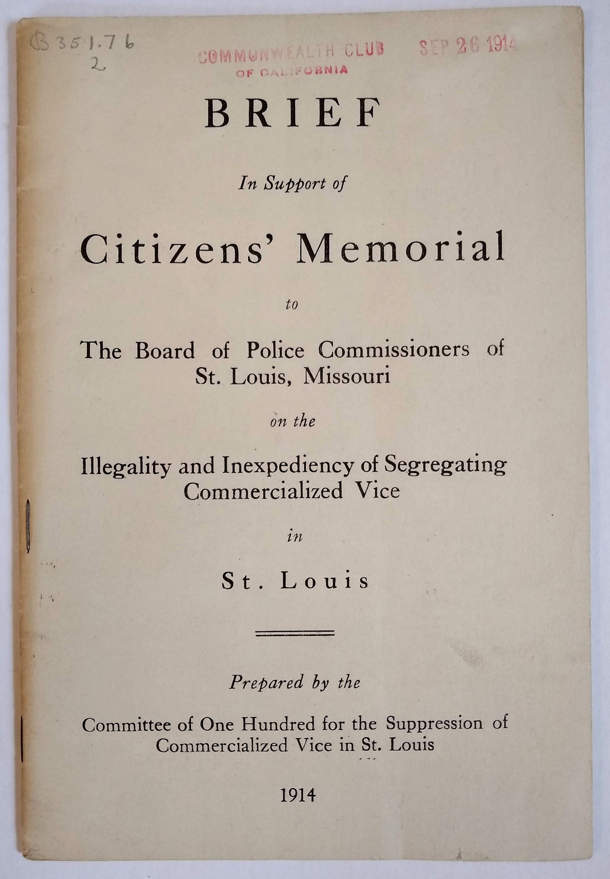 (Antiprostitution) (Missouri) Committee of One-hundred for the Suppression of Commercialized Vice in St. Louis. Brief in support of citizens’ memorial to the Board of police commissioners of St. Louis, Missouri, on the illegality and inexpediency of segregating commercialized vice in St. Louis. St. Louis: n.p., 1914. 8vo, 32 pp.; stapled self-wrapper, sl. toned at edges, one small closed tear to front wrap, ex-library stamp and penciled shelf label, very good.