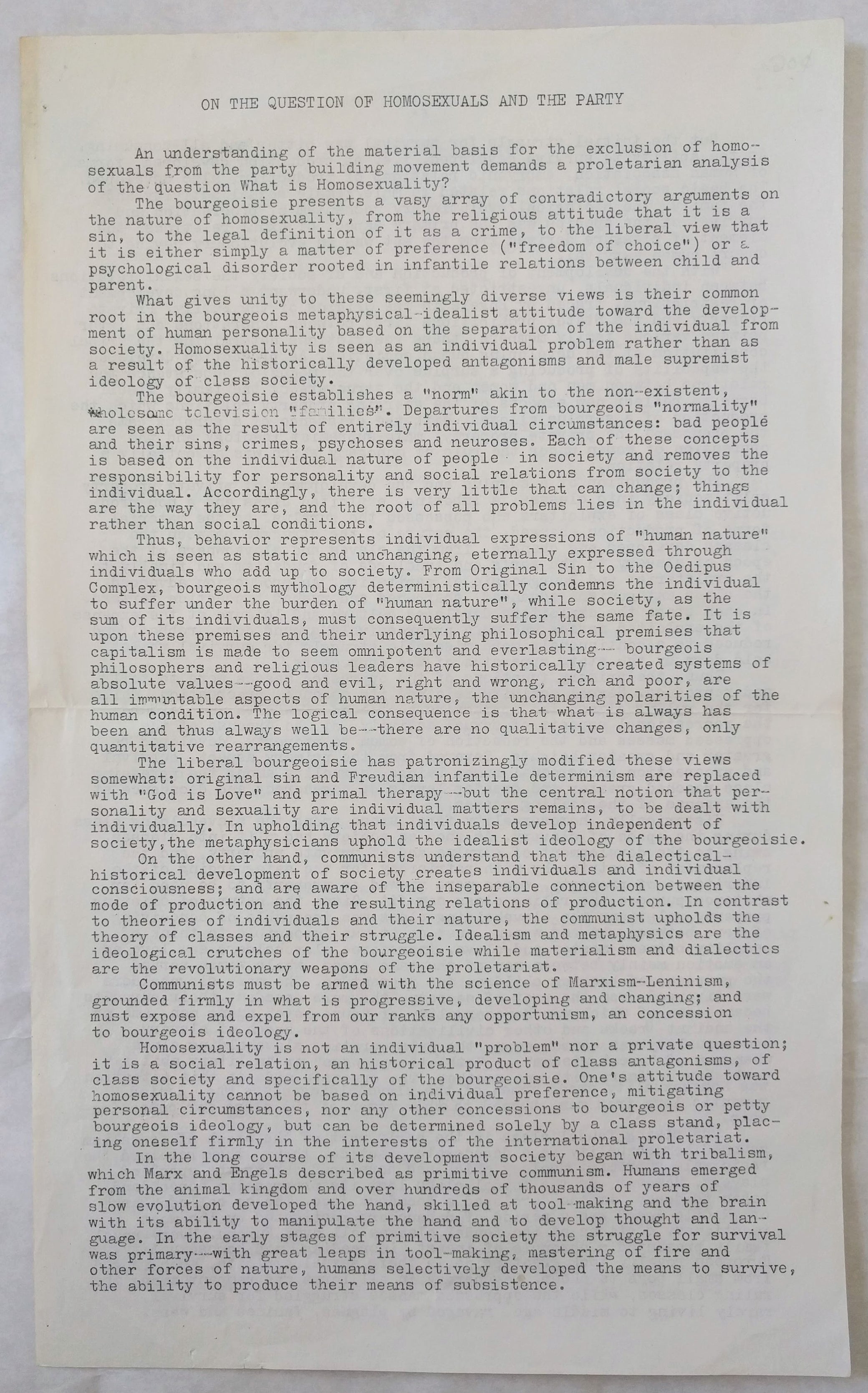Doctrinaire “Marxist Leninist defense of the line of the Continuations Committee on homosexuality,” arguing there is a “material basis for the exclusion of homosexuals from the party building movement.” The paper condemns the mores and metaphysics of the “depraved liberal bourgeoisie” and provides a materialistic, dialectical argument against homosexuality. Homosexuality is not a private question, it is a “social relation” that “replaces love and comradeship between the sexes with antagonism and hatred […] There is no way that such degenerates and exploiters can be admitted to […] the revolutionary party.”