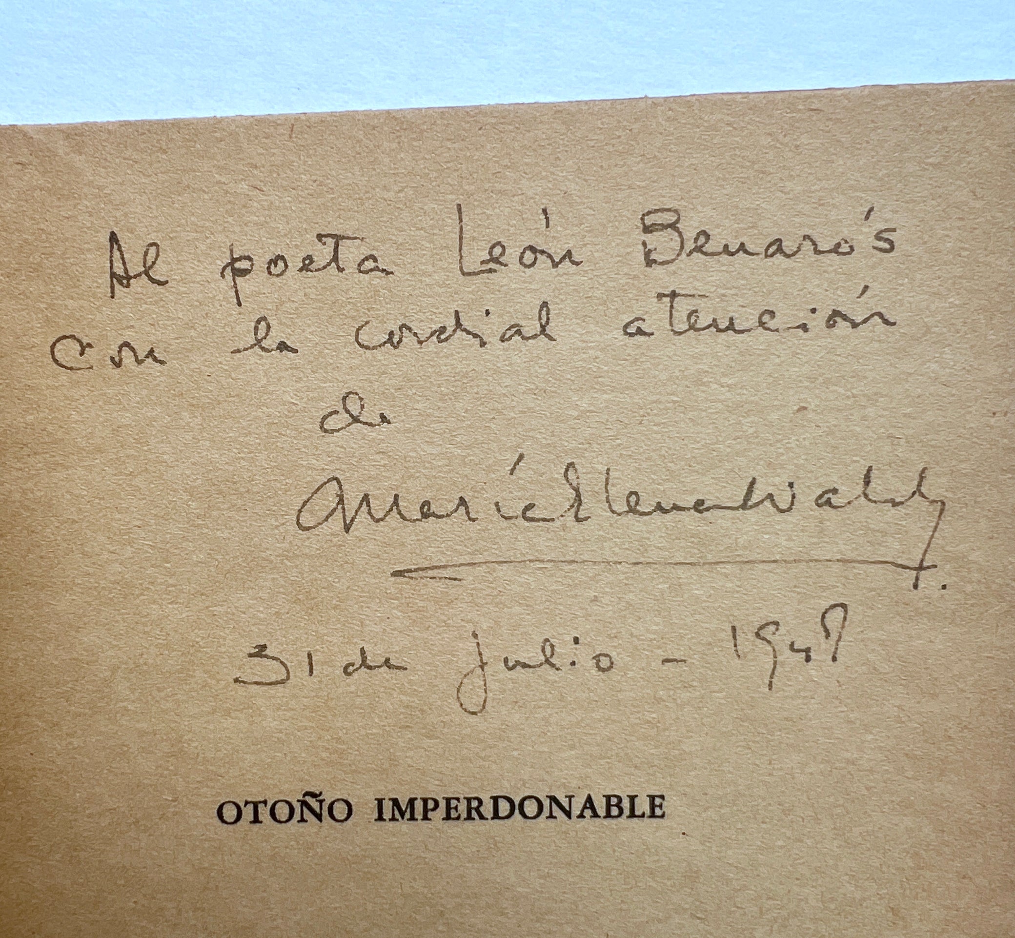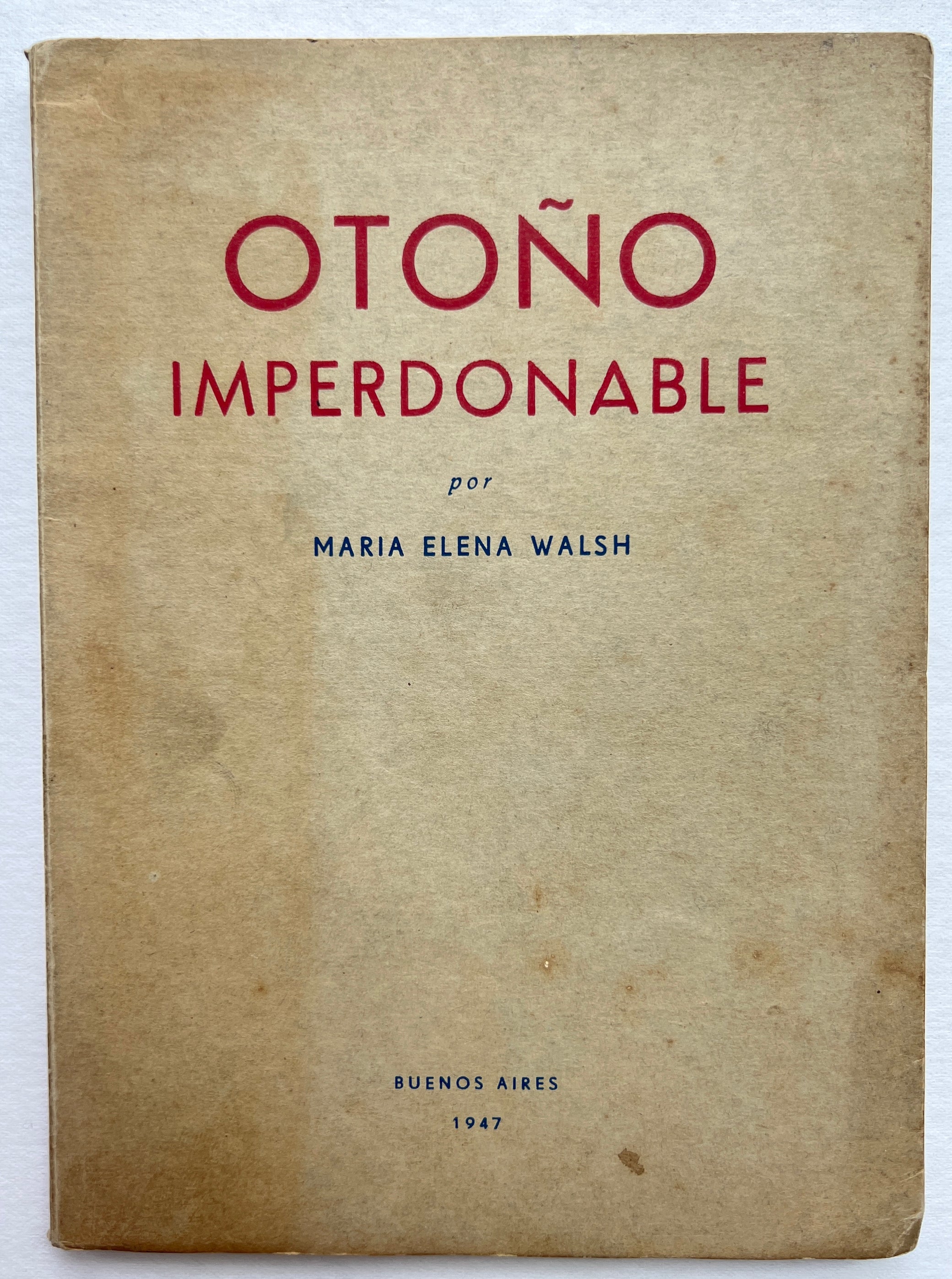 Walsh, María Elena. Otoño Imperdonable. Buenos Aires: [Imp. Ferrari], 1947. First edition. 20.5 cm, 78 pp.; interior evenly toned, wrapper bumped and a bit faded, separating at internal hinge. Signed dedication from the author to the poet and tango critic and historian León Benarós, dated 31-7-1947.
